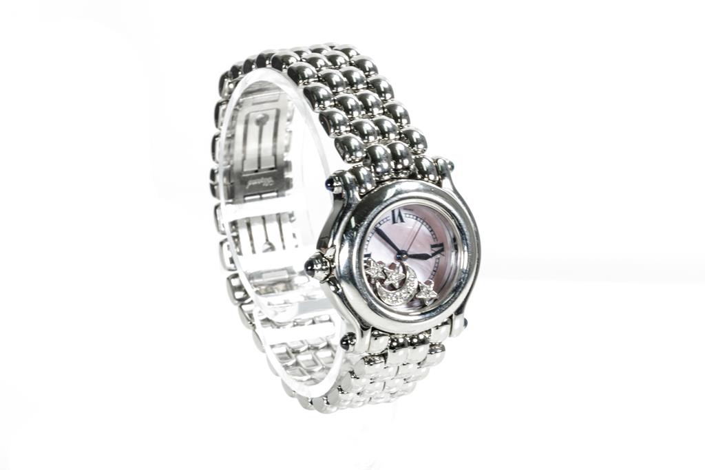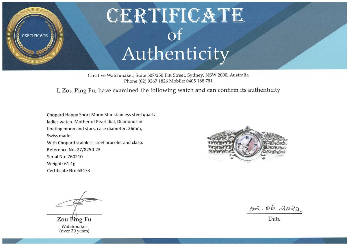 Chopard Happy Sport Moon Star stainless steel quartz ladies watch. Mother of Pearl dial, Diamonds in floating moon and stars, case diameter: 26mm, wrist size: 15.5cm, Swiss made. Ref# 27/8250-23. With Chopard stainless steel bracelet and clasp. With Certificate of Authenticity and 3 month FSA warranty. (Pre-owned)
