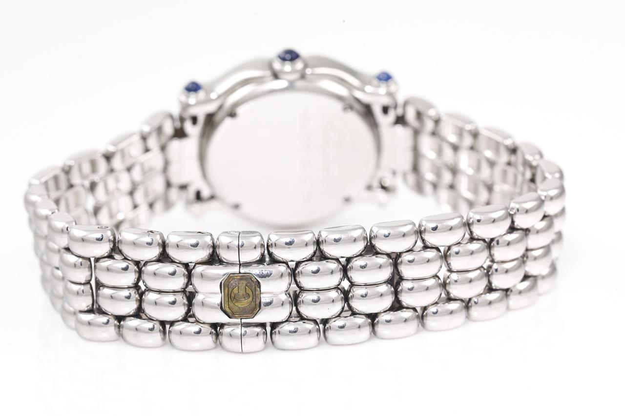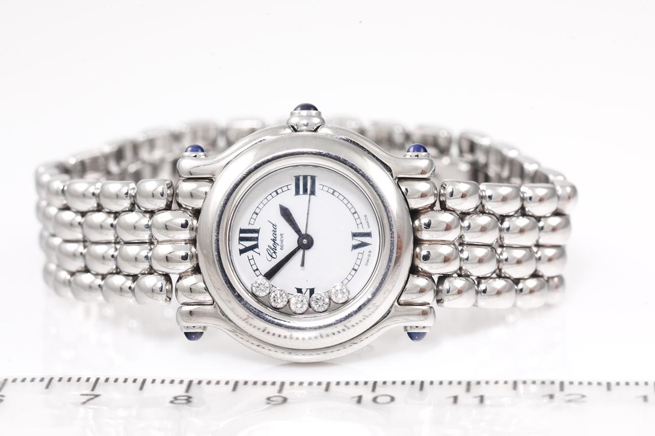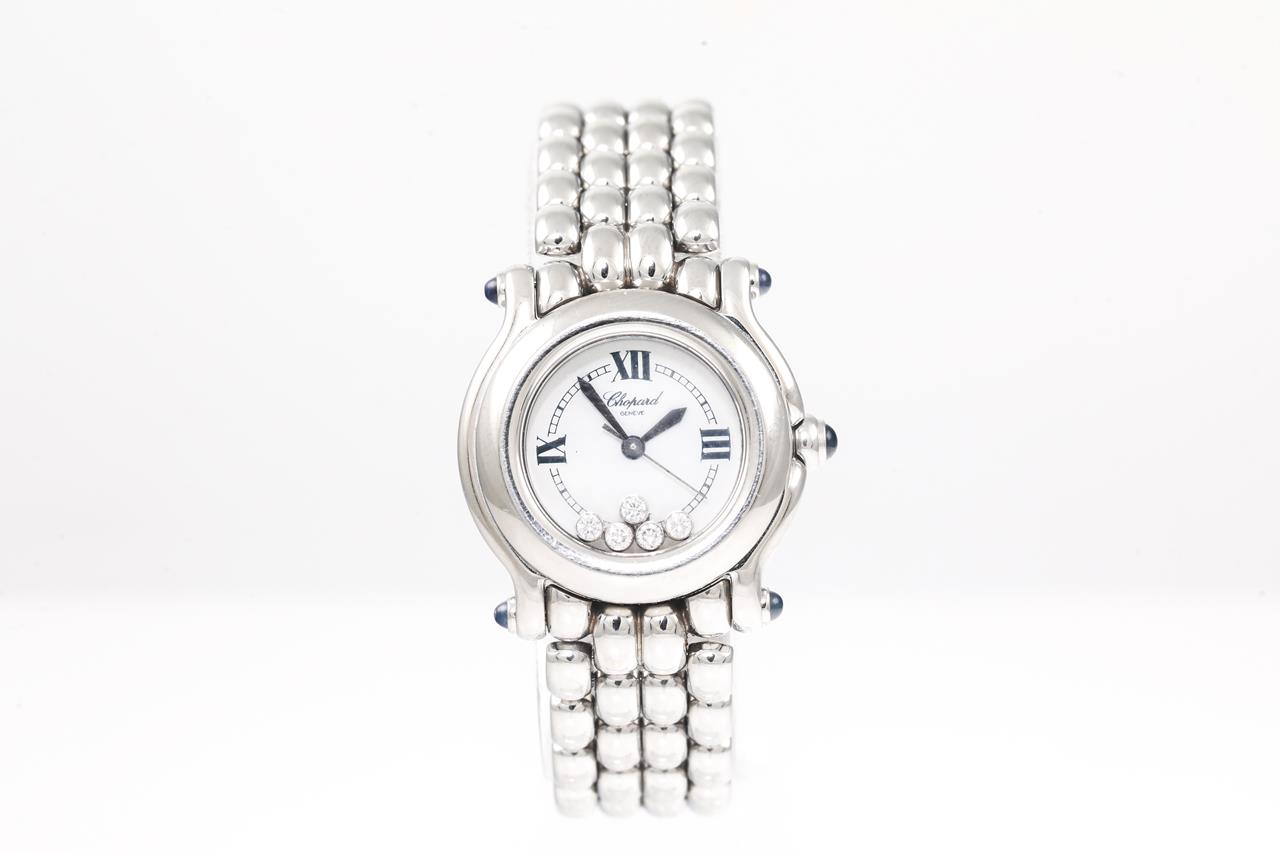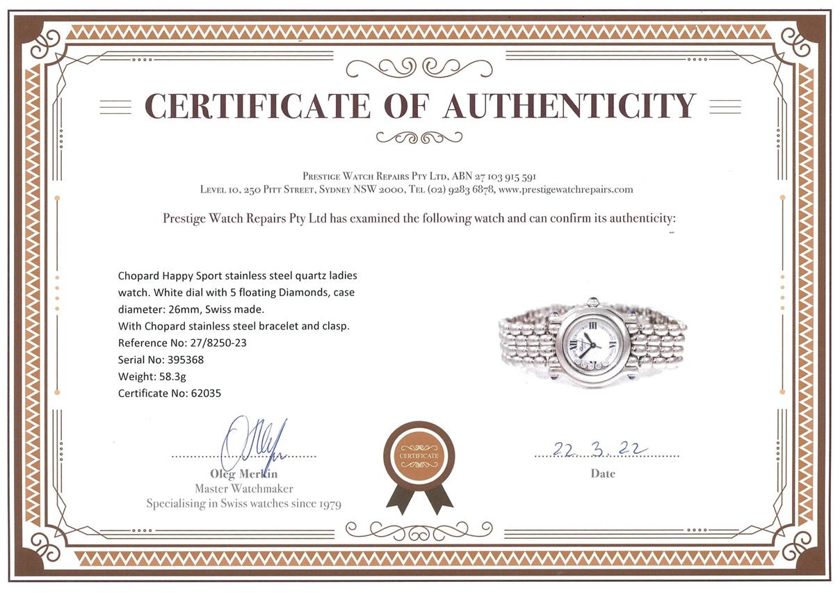 Chopard Happy Sport stainless steel quartz ladies watch. White dial with 5 floating Diamonds, case diameter: 26mm, wrist size: 15cm, Swiss made. Ref# 27/8250-23. With Chopard stainless steel bracelet and clasp. With Certificate of Authenticity. 3 month FSA warranty. (Pre-owned)