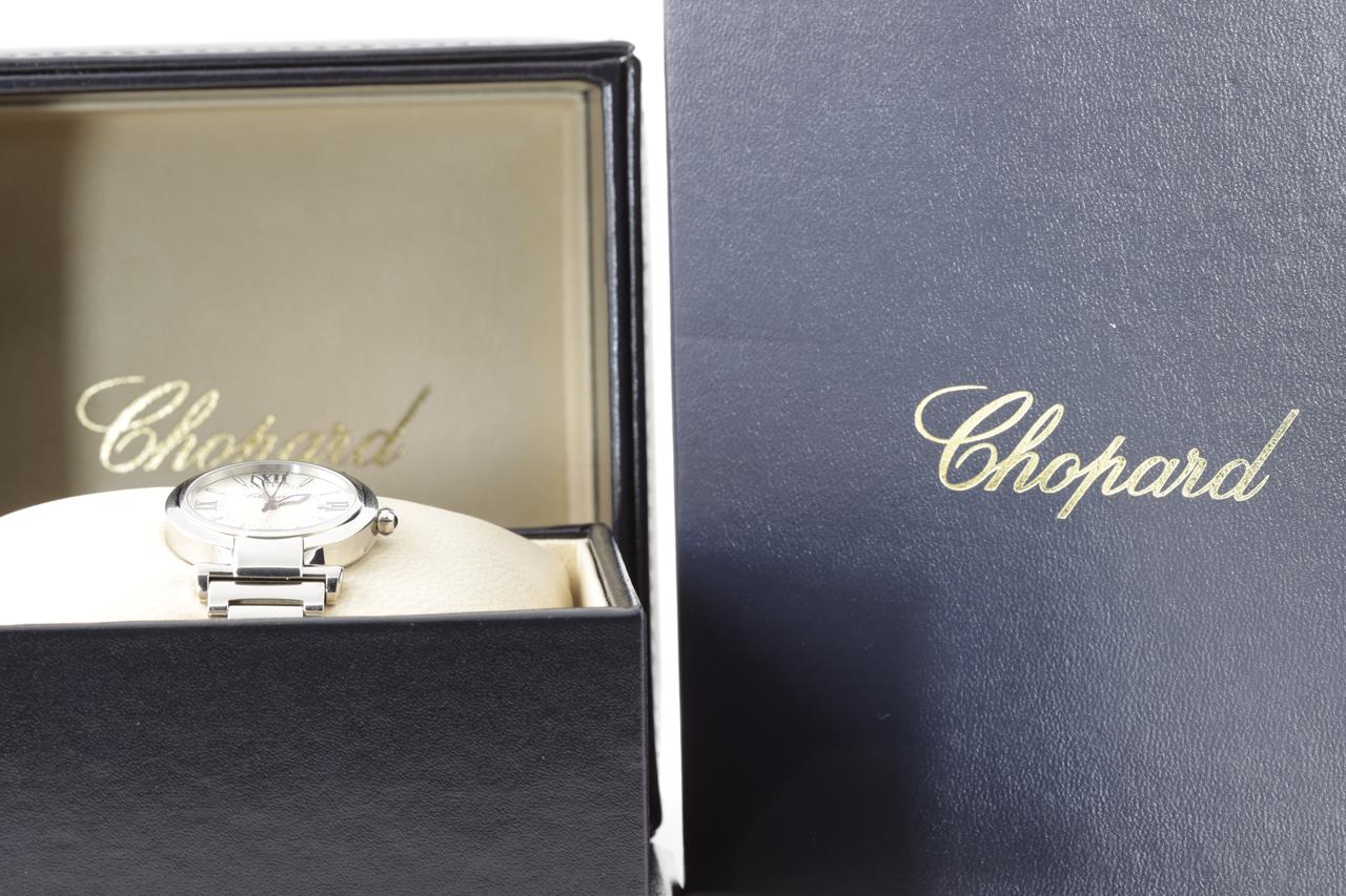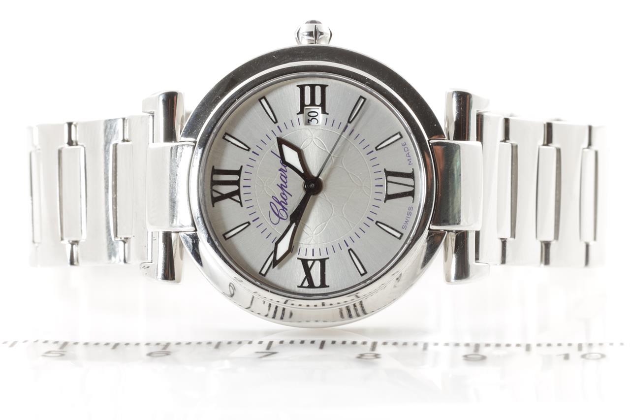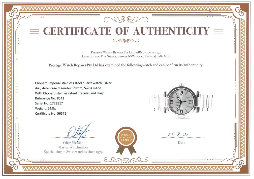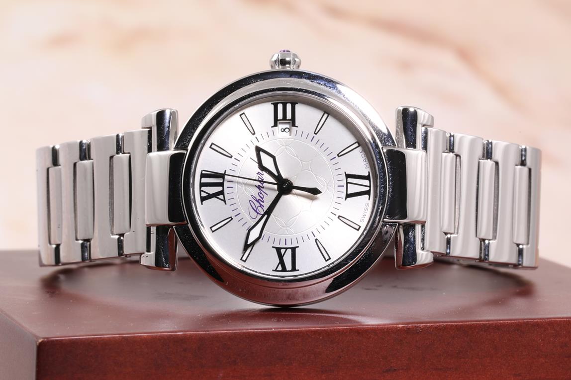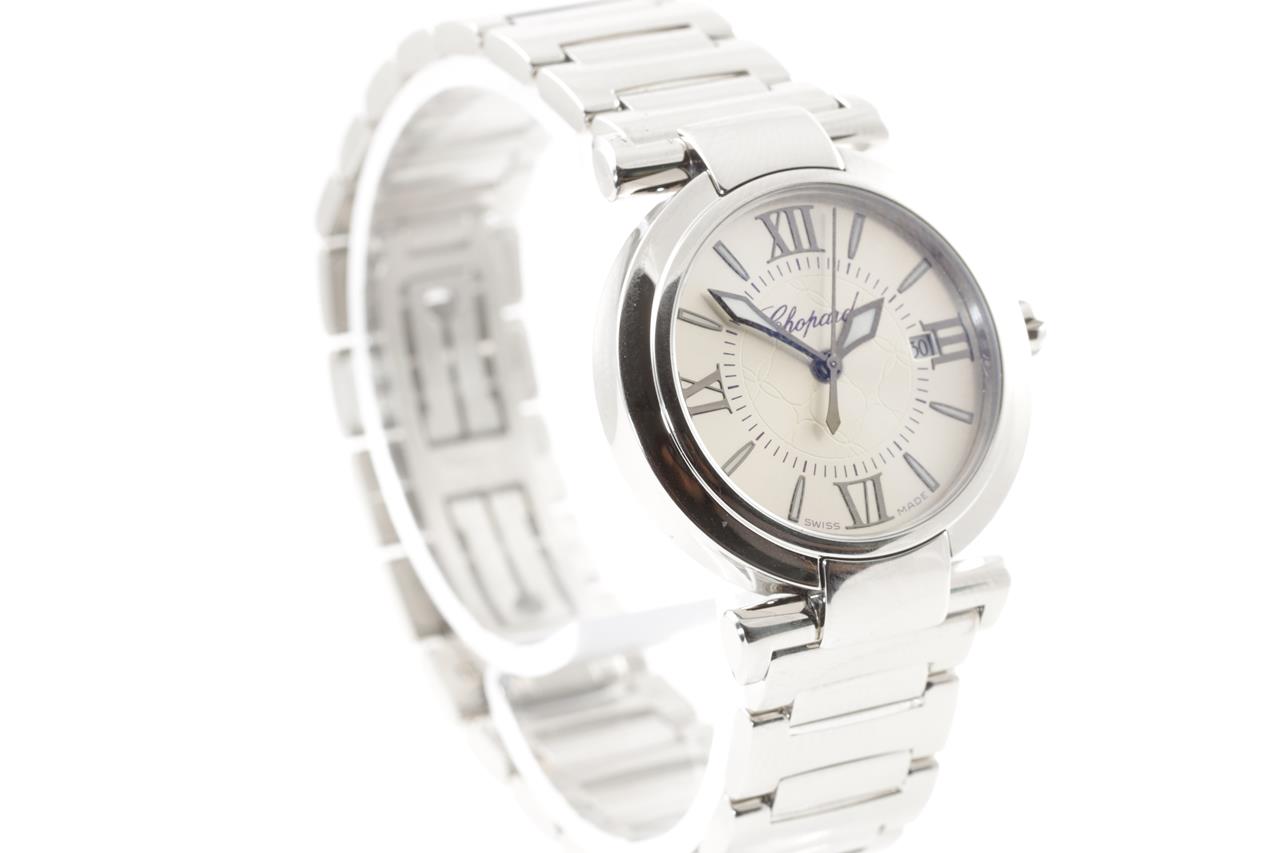 Chopard Imperial stainless steel quartz ladies watch. Silver dial, date, case diameter: 28mm, wrist size: 16cm, Swiss made. Ref# 8541. With Chopard stainless steel bracelet and clasp. With certificate of authenticity and Chopard box. 3 month FSA warranty. (Pre-owned)