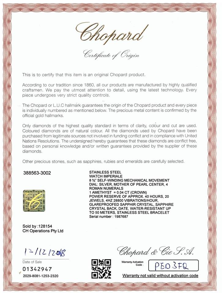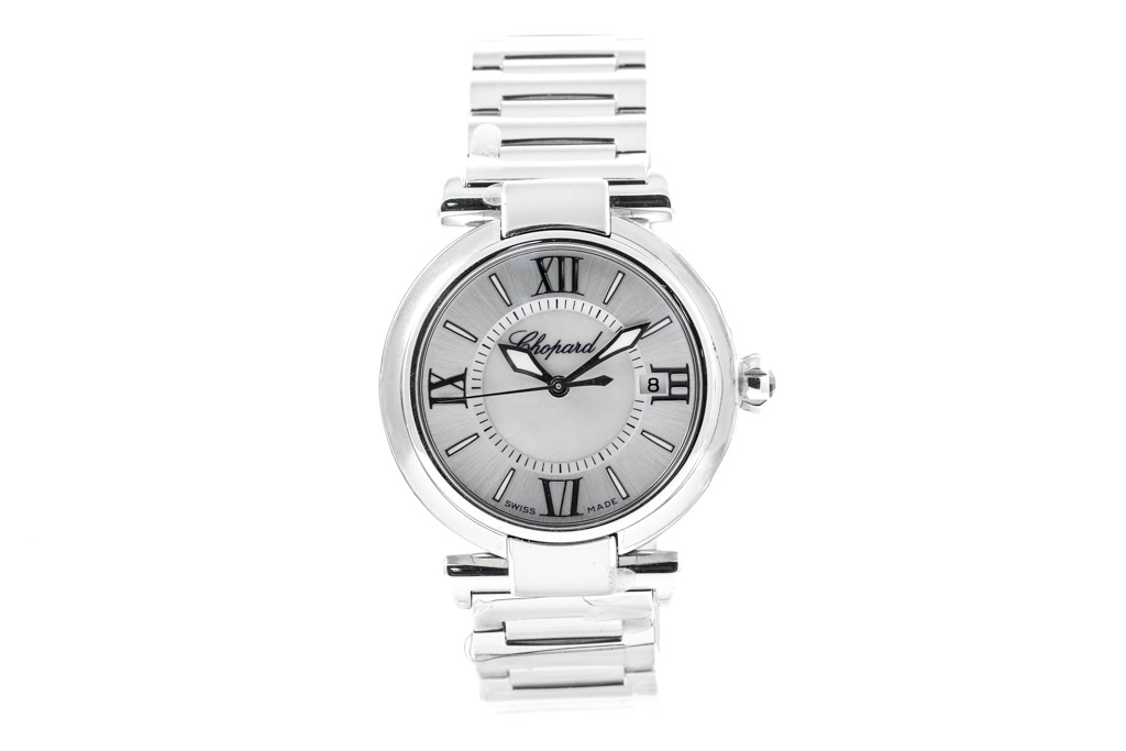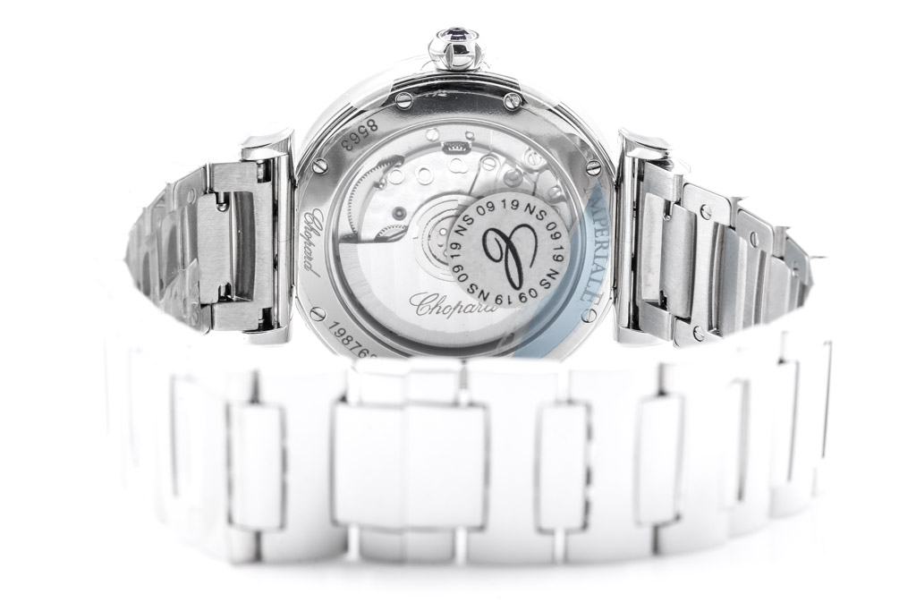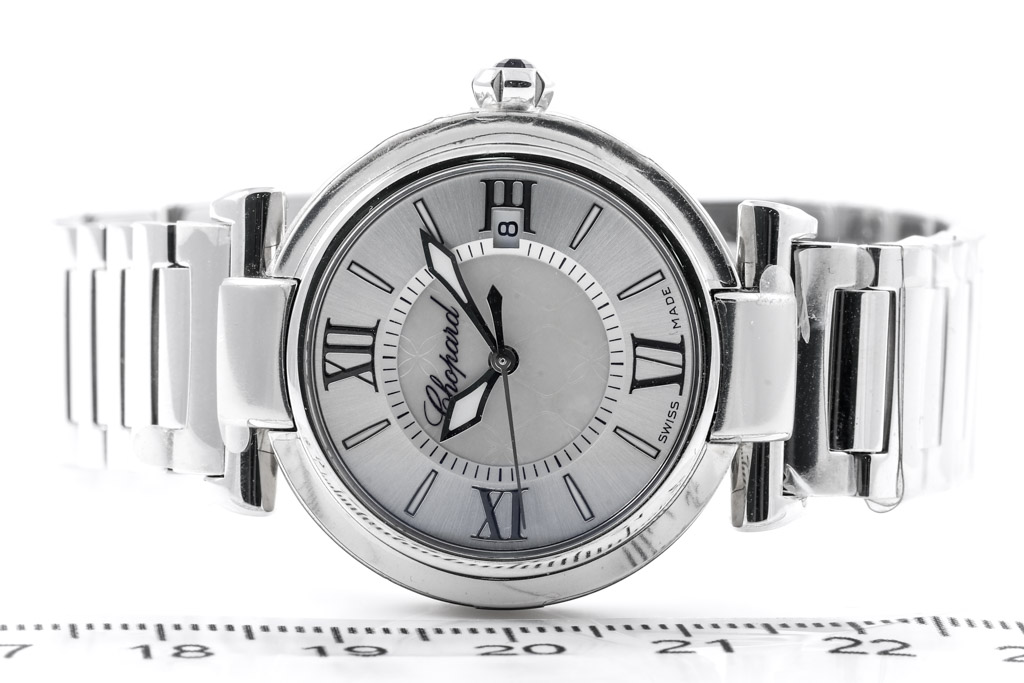 Chopard Imperial stainless steel automatic ladies watch. Silver & Mother of Pearl dial, date, case diameter: 29mm, wrist size: 16cm, Swiss made. Ref# 388563-3002. With Chopard stainless steel bracelet and clasp. With Certificate of Authenticity, Chopard Certificate of Origin dated 12/12/2018 and Chopard box. 3 month FSA warranty. (Pre-owned)