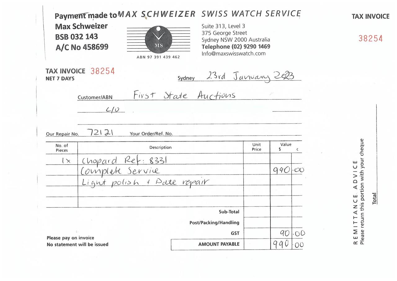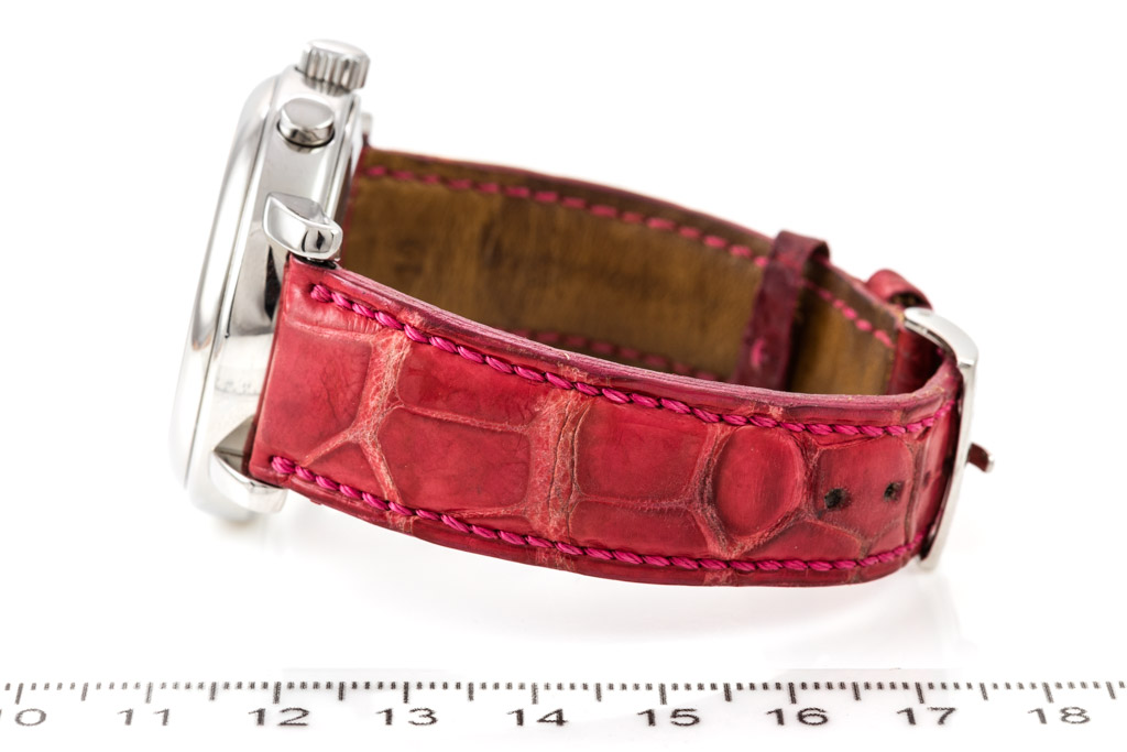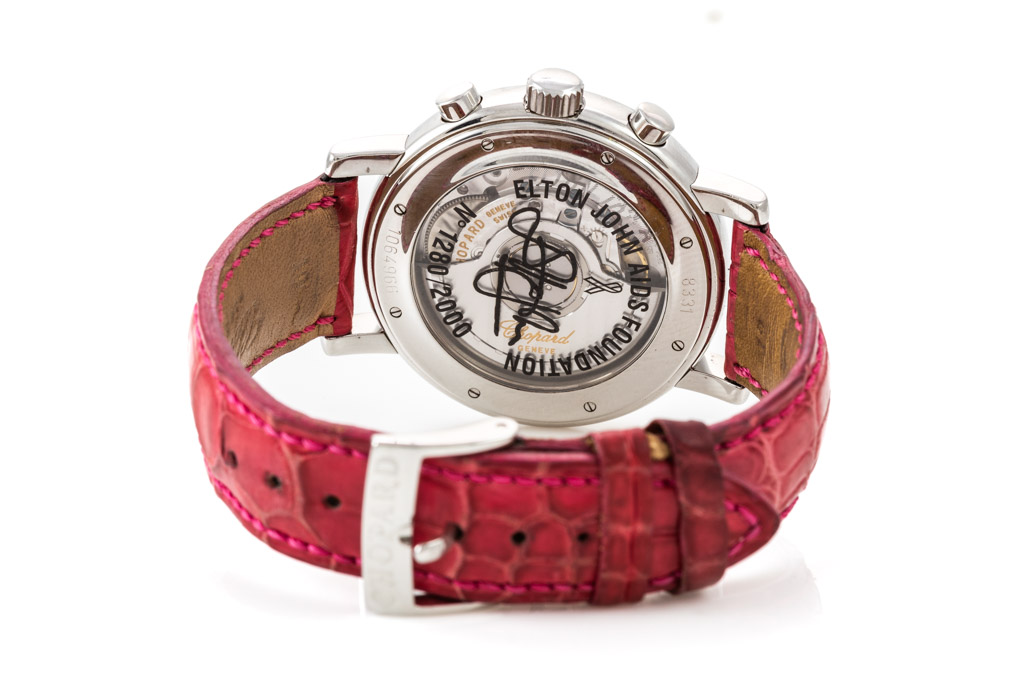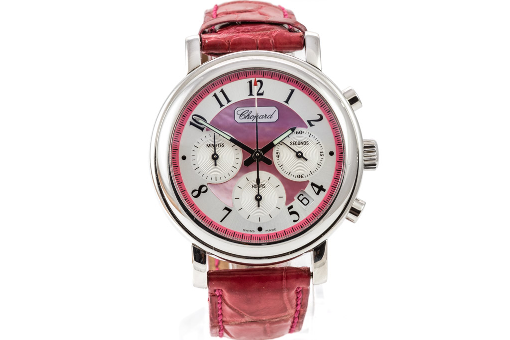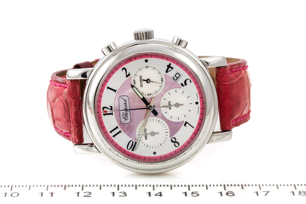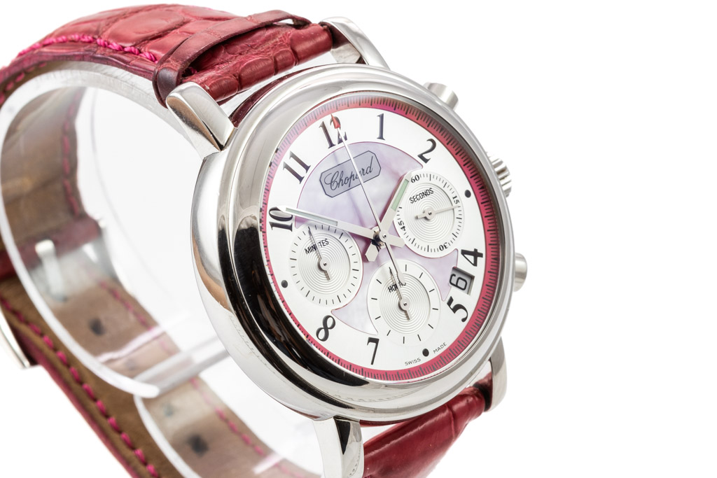 Chopard Mille Miglia Elton John Limited Edition of 2000 stainless steel automatic ladies watch. Mother of Pearl chronograph dial, date, case diameter: 39mm, strap length: 19cm, Swiss made. Ref# 8331. With Chopard red leather strap and buckle. With Certificate of Authenticity, Max Schweizer copy of complete service invoice dated 23/01/23. 2 years Max Schweizer warranty from the date of full service. (Pre-owned)