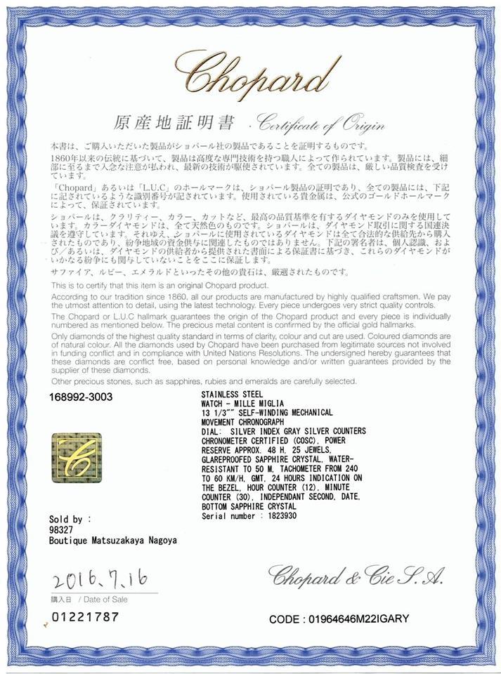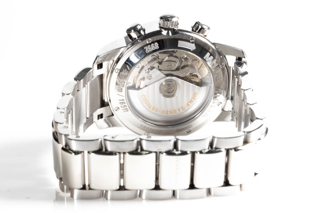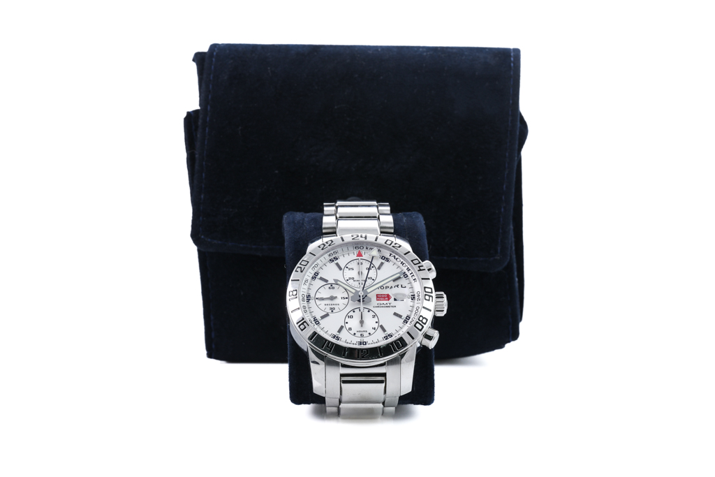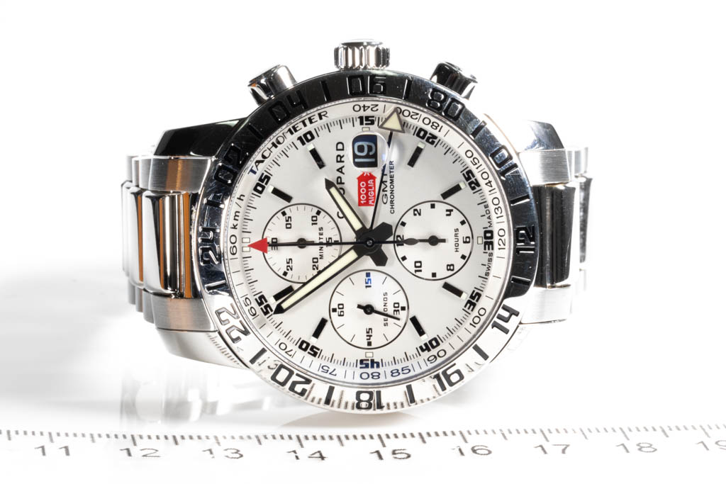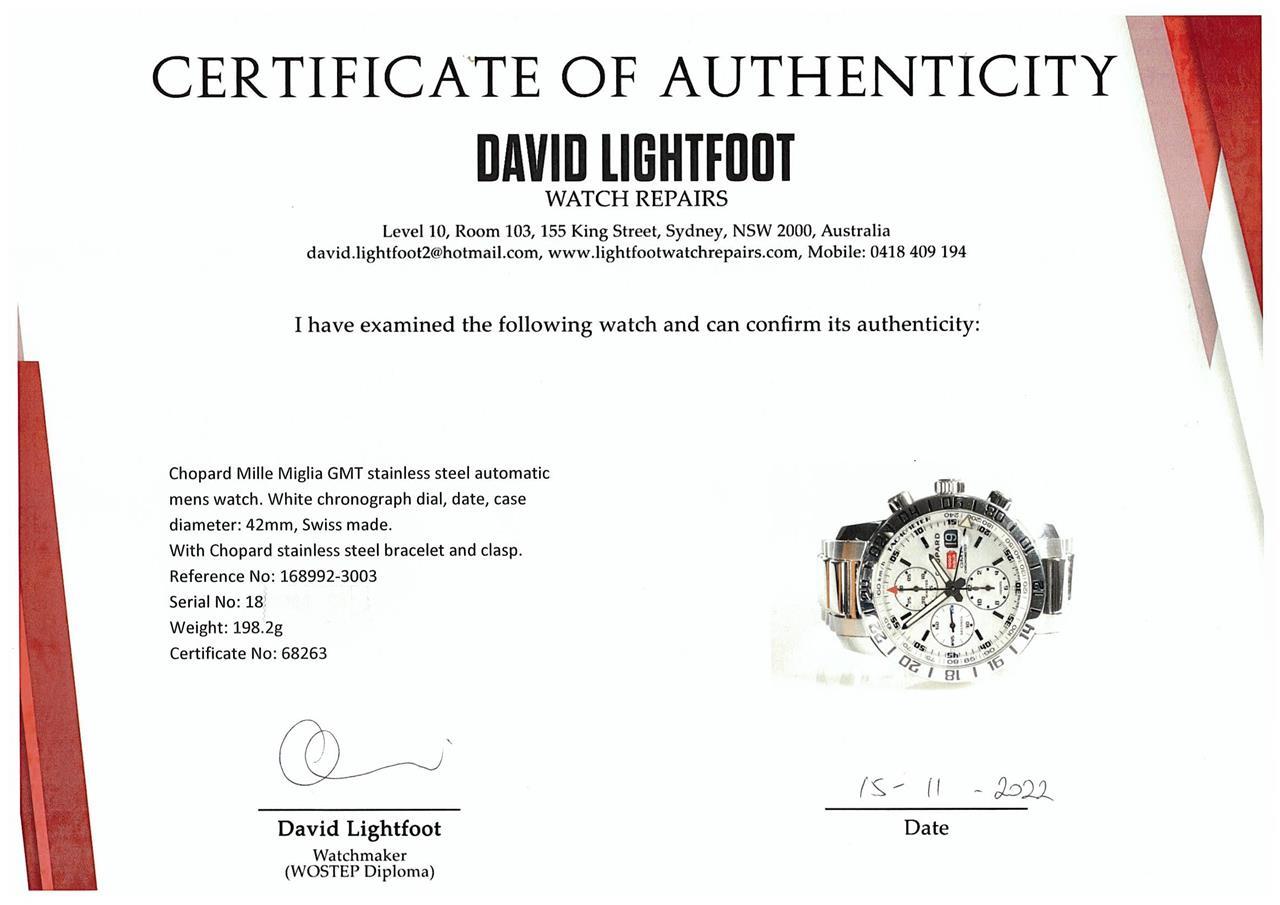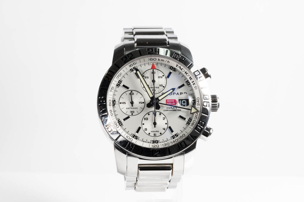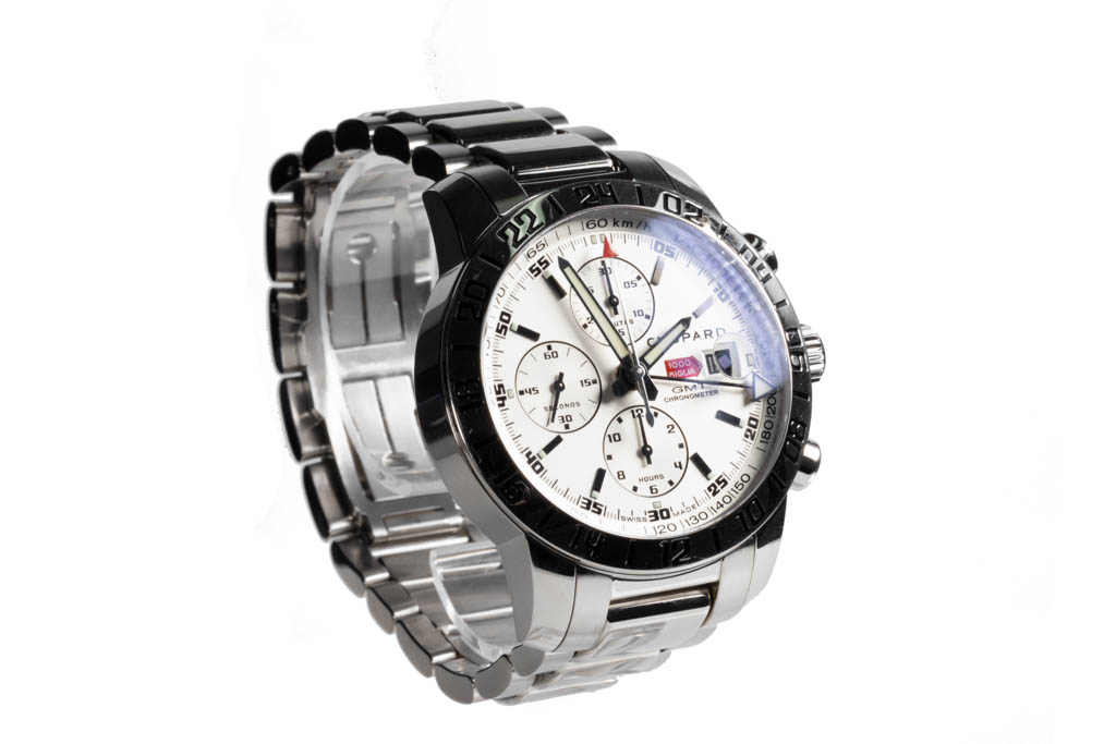 Chopard Mille Miglia GMT stainless steel automatic men's watch. White chronograph dial, date, case diameter: 42mm, wrist size: 19cm, Swiss made. Ref# 168992-3003. With Chopard stainless steel bracelet and clasp. With Certificate of Authenticity, Chopard Certificate of Origin dated 16/07/2016, spare black rubber strap and Chopard case. 3 month FSA warranty. (Pre-owned)