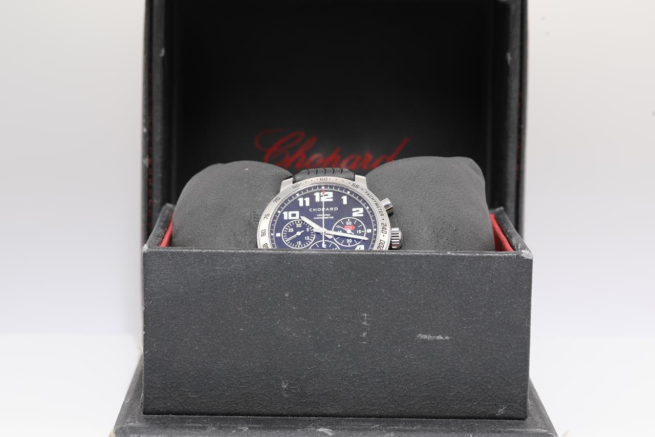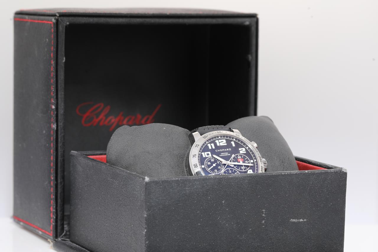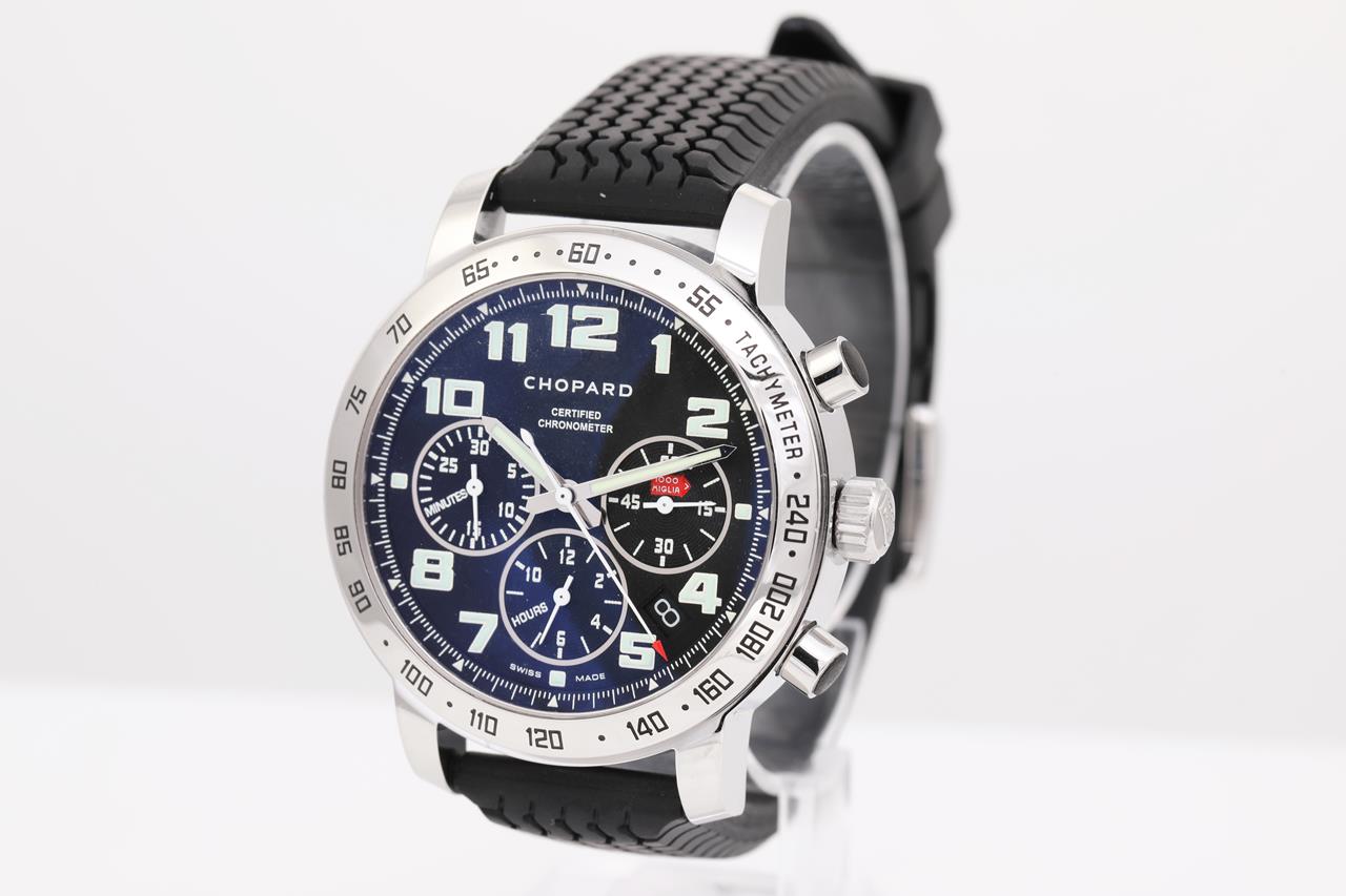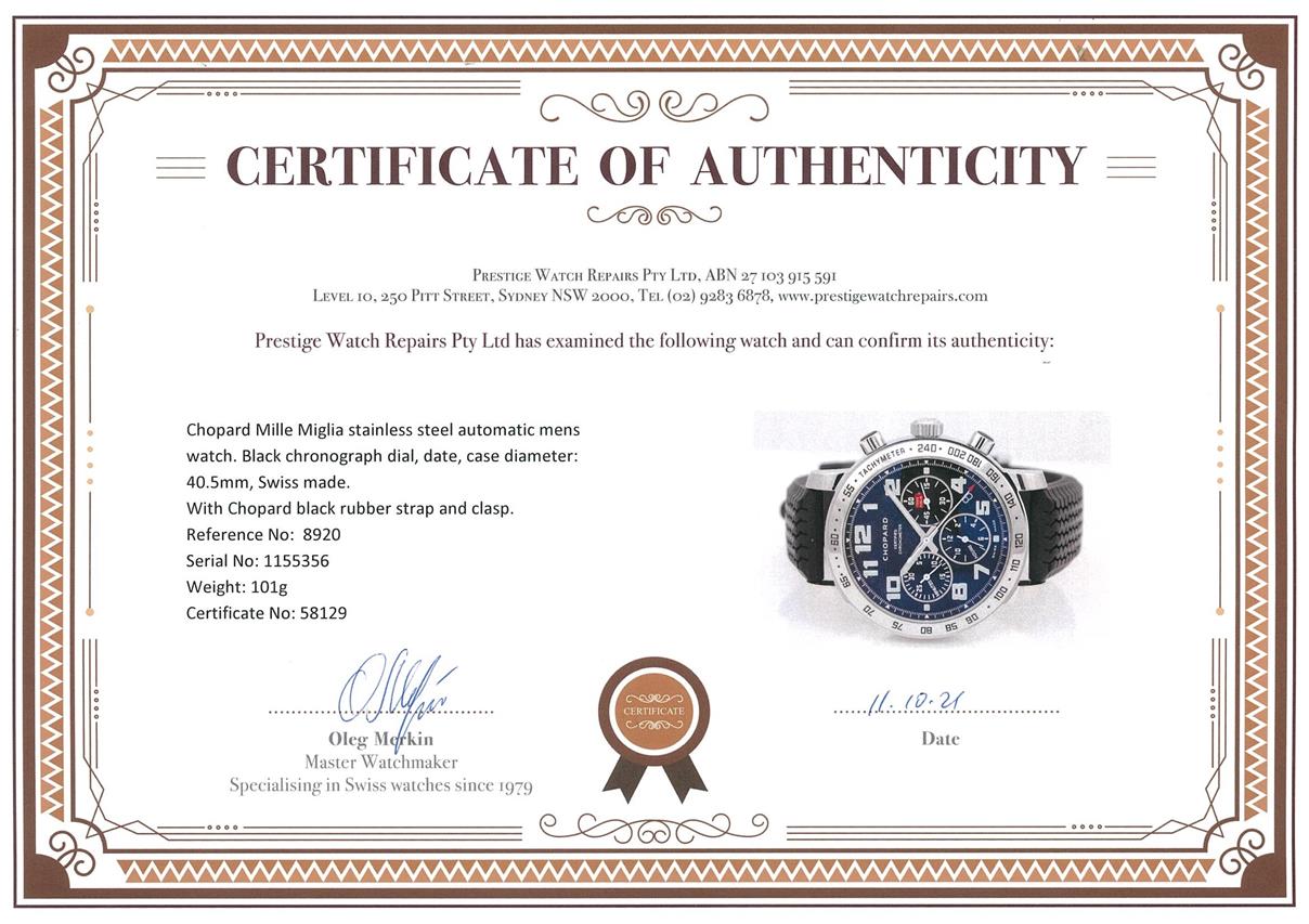 Chopard Mille Miglia stainless steel automatic mens watch. Black chronograph dial, date, case diameter: 40.5mm, length: 21cm, Swiss made. Ref# 8920. With Chopard black rubber strap and clasp. With certificate of authenticity, Chopard certificate of origin and Chopard box. 3 month FSA warranty. (Pre-owned)