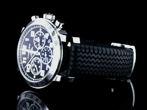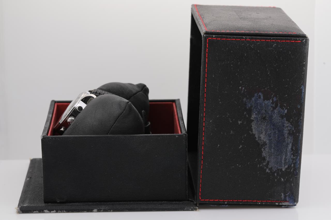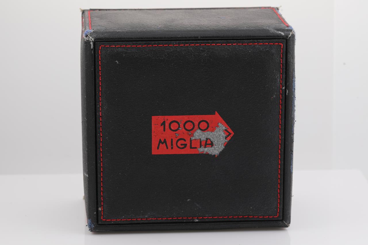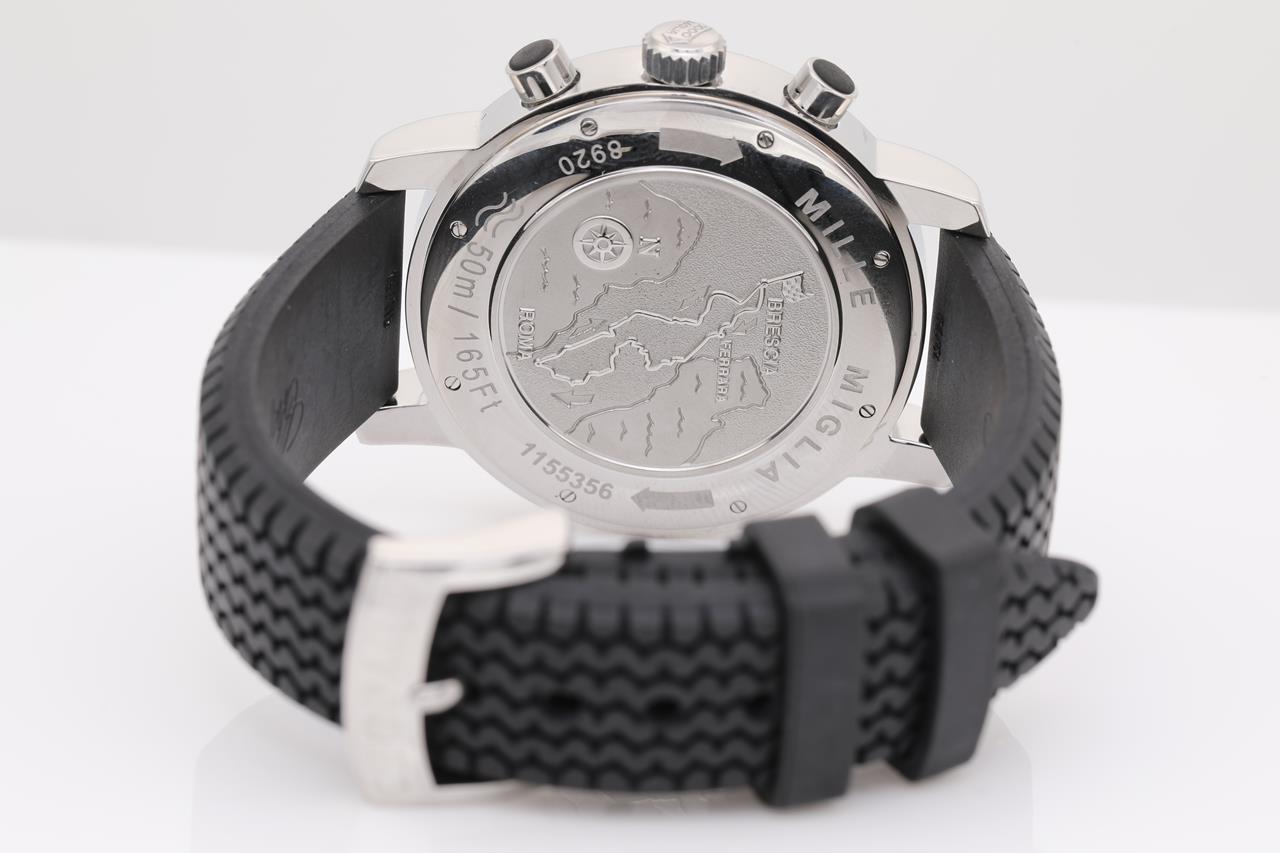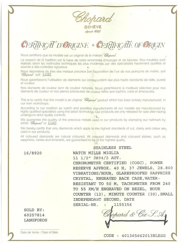 Chopard Mille Miglia stainless steel automatic mens watch. Black chronograph dial, date, case diameter: 40.5mm, length: 21cm, Swiss made. Ref# 8920. With Chopard black rubber strap and clasp. With certificate of authenticity, Chopard certificate of origin and Chopard box. 3 month FSA warranty. (Pre-owned)