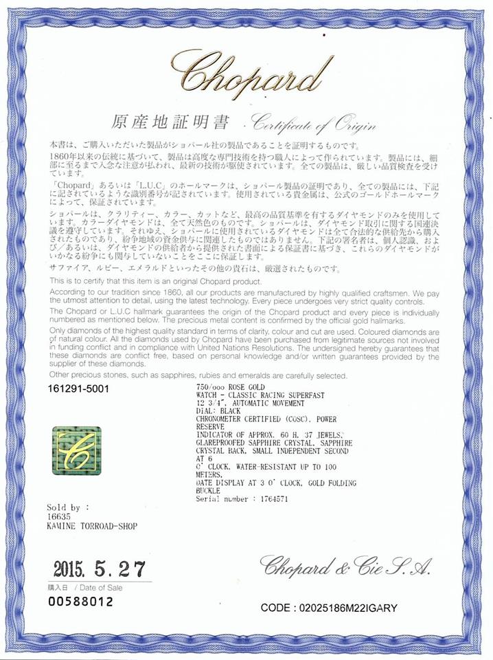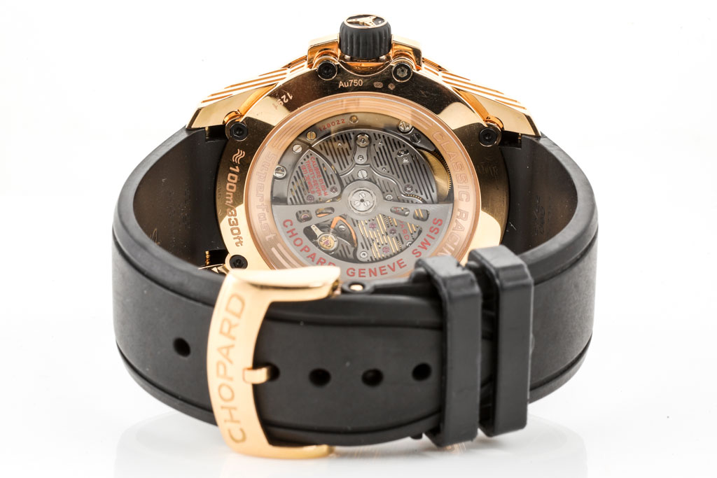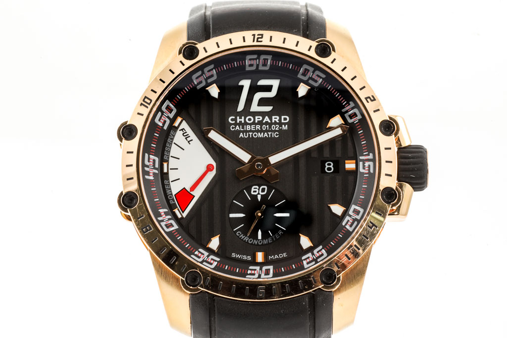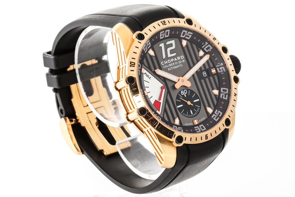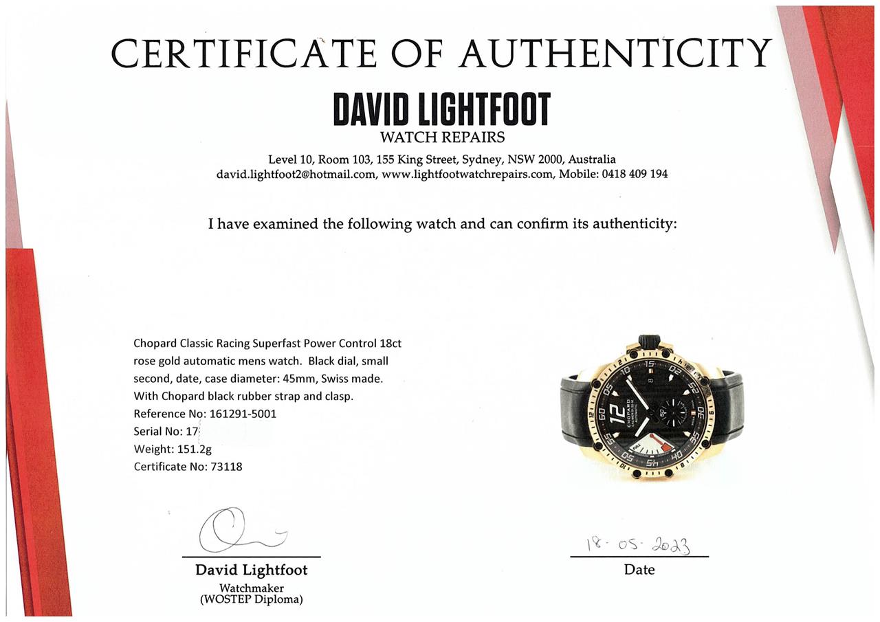 Chopard Classic Racing Superfast Power Control 18ct rose gold automatic mens watch. Black dial, small second, date, case diameter: 45mm, strap length: 21.5cm, Swiss made. Ref# 161291-5001. With Chopard black rubber strap and clasp. With Certificate of Authenticity, Chopard Certificate of Origin dated 27/05/2015 and Chopard box. 3 month FSA warranty. (Pre-owned)