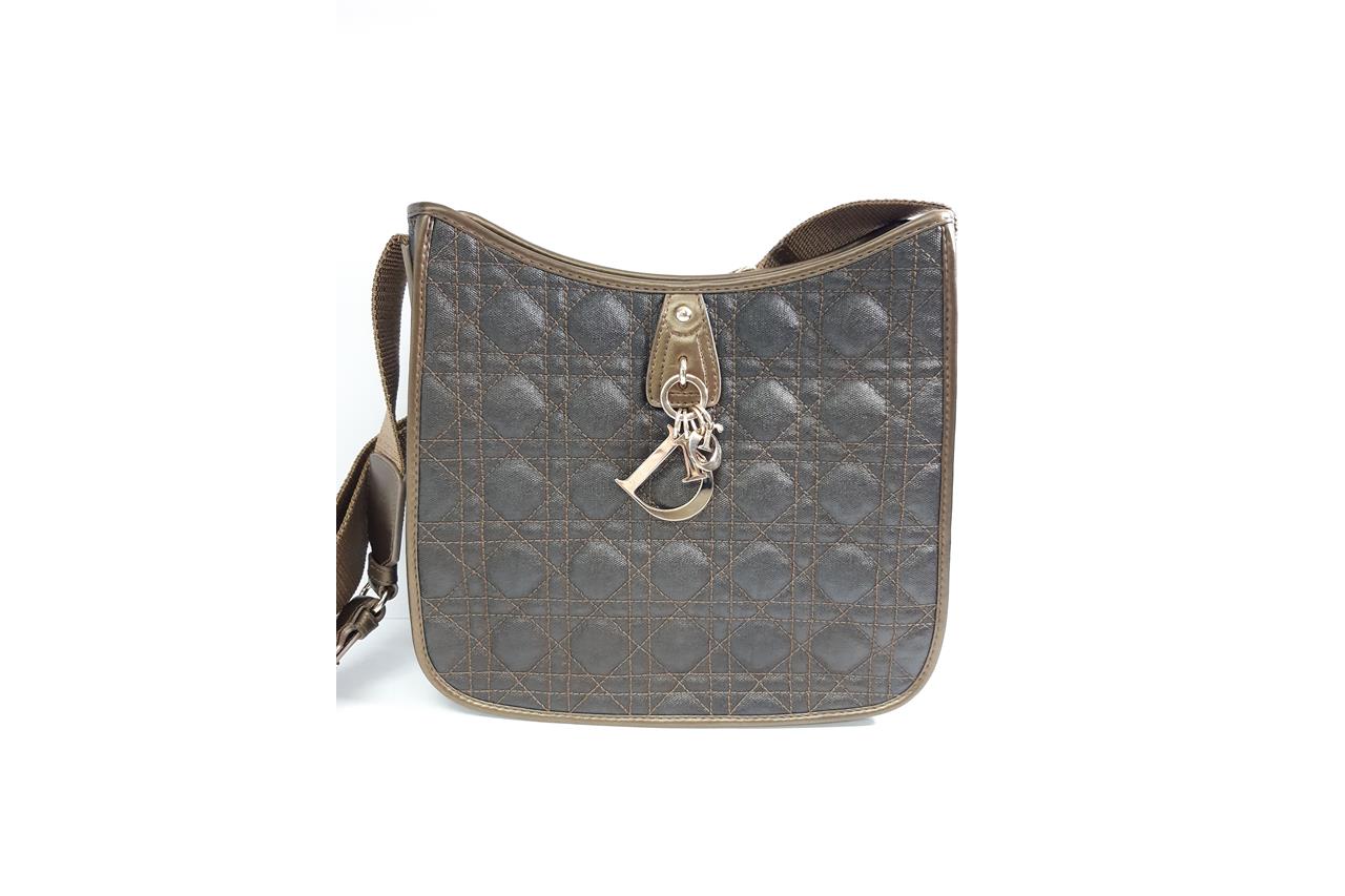 Christian Dior Cannage crossbody bag in brown coated canvas. Featuring gold-toned hardware, gold/brown leather trim, zipper closure on top. The top opens to a brown fabric interior with zipped and patch pockets. Approximate dimensions: 27.5cm(W) x 26.5cm(H) x 8.5cm(D), 44cm (minimum) adjustable shoulder strap drop. Accompanied by Dior certificate card (dated 10/08/21) and dust bag. With Entrupy Certificate of Authenticity. (Pre-owned)