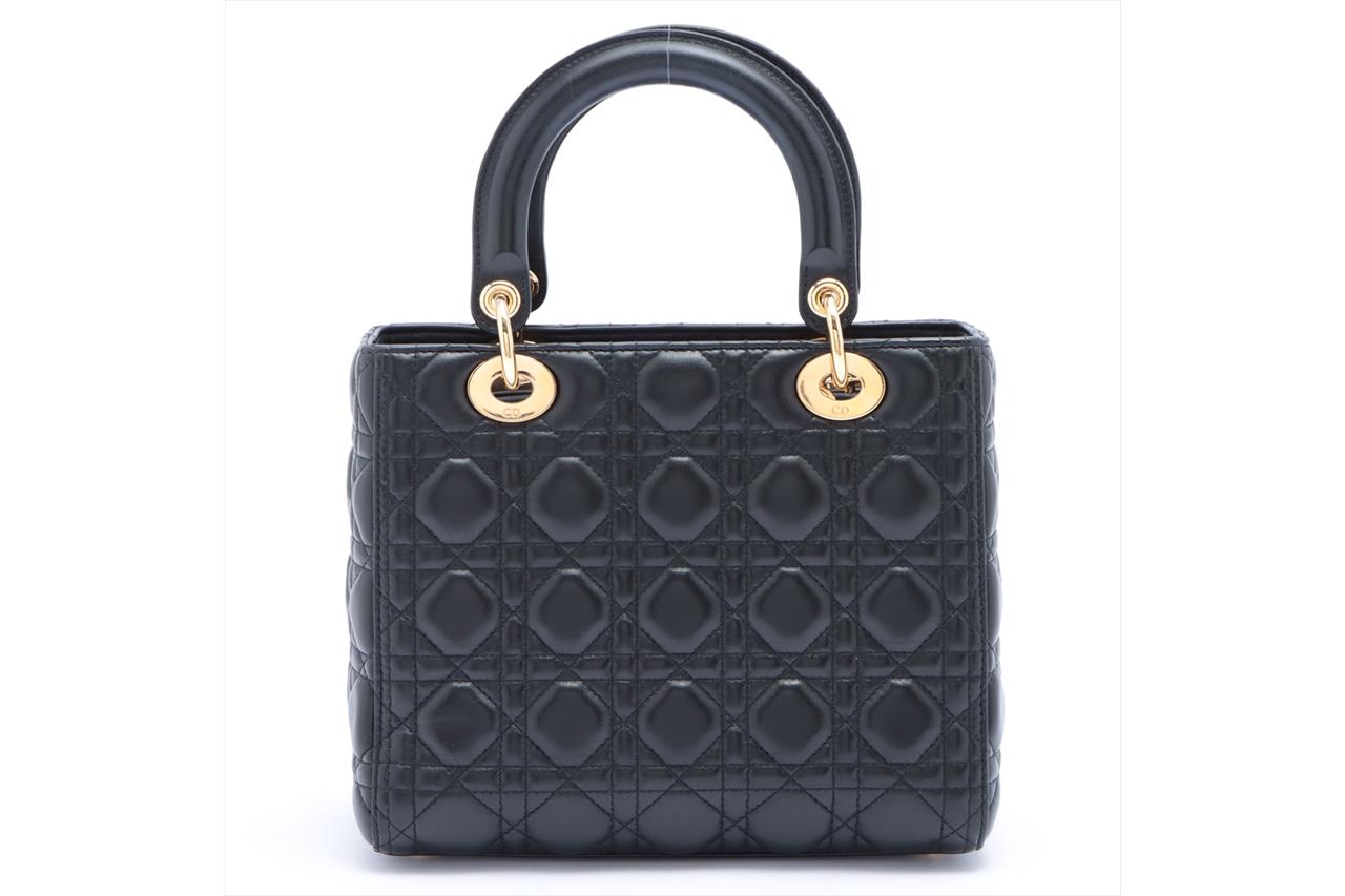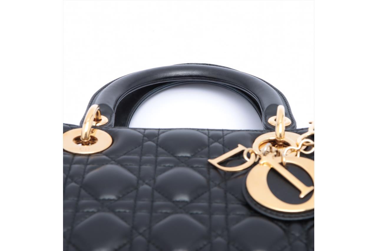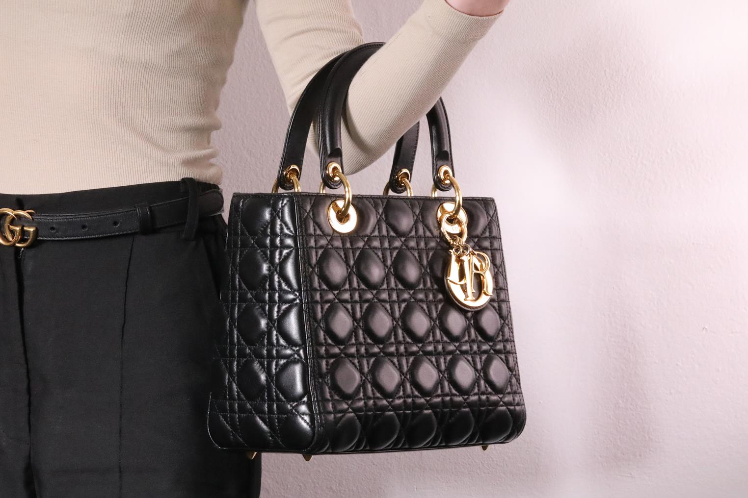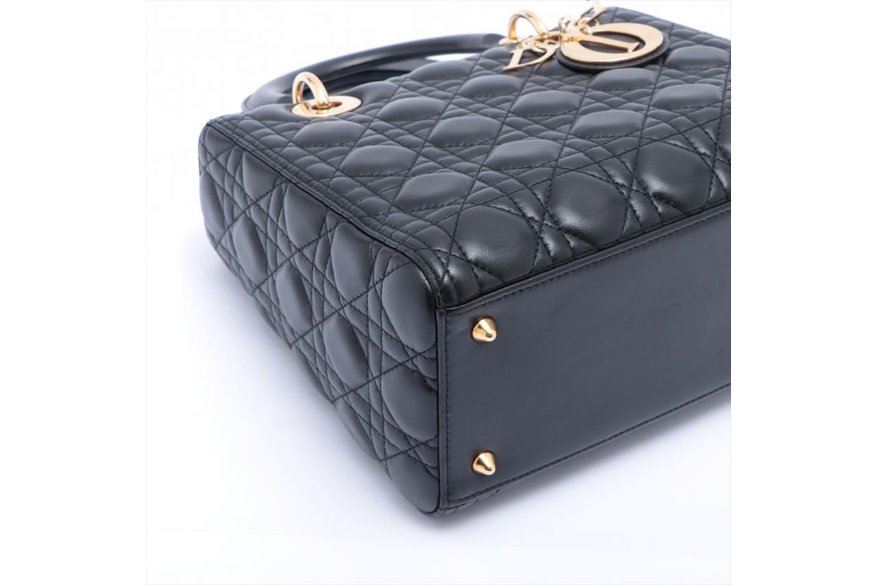 Christian Dior Medium Lady Dior Bag. Black Cannage Lambskin. Gold-tone hardware including the signature 'D.I.O.R' charms. Approximate dimensions: 24cm (L) x 20cm (H) x 11cm (D) and 10cm Handle Height. With thin, removable and adjustable Dior shoulder strap, Dior dust bag and box. With Entrupy Certificate of Authenticity (Pre-owned).