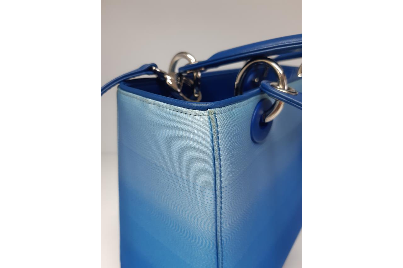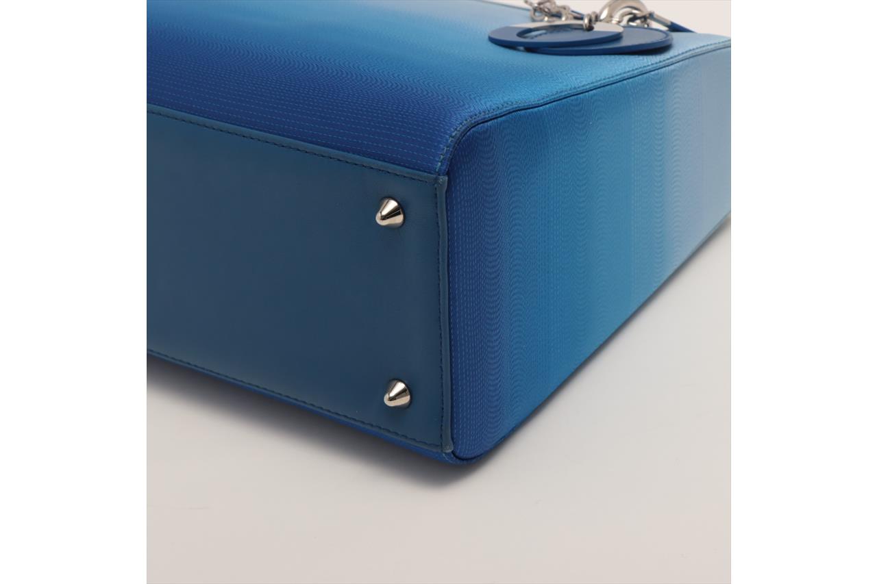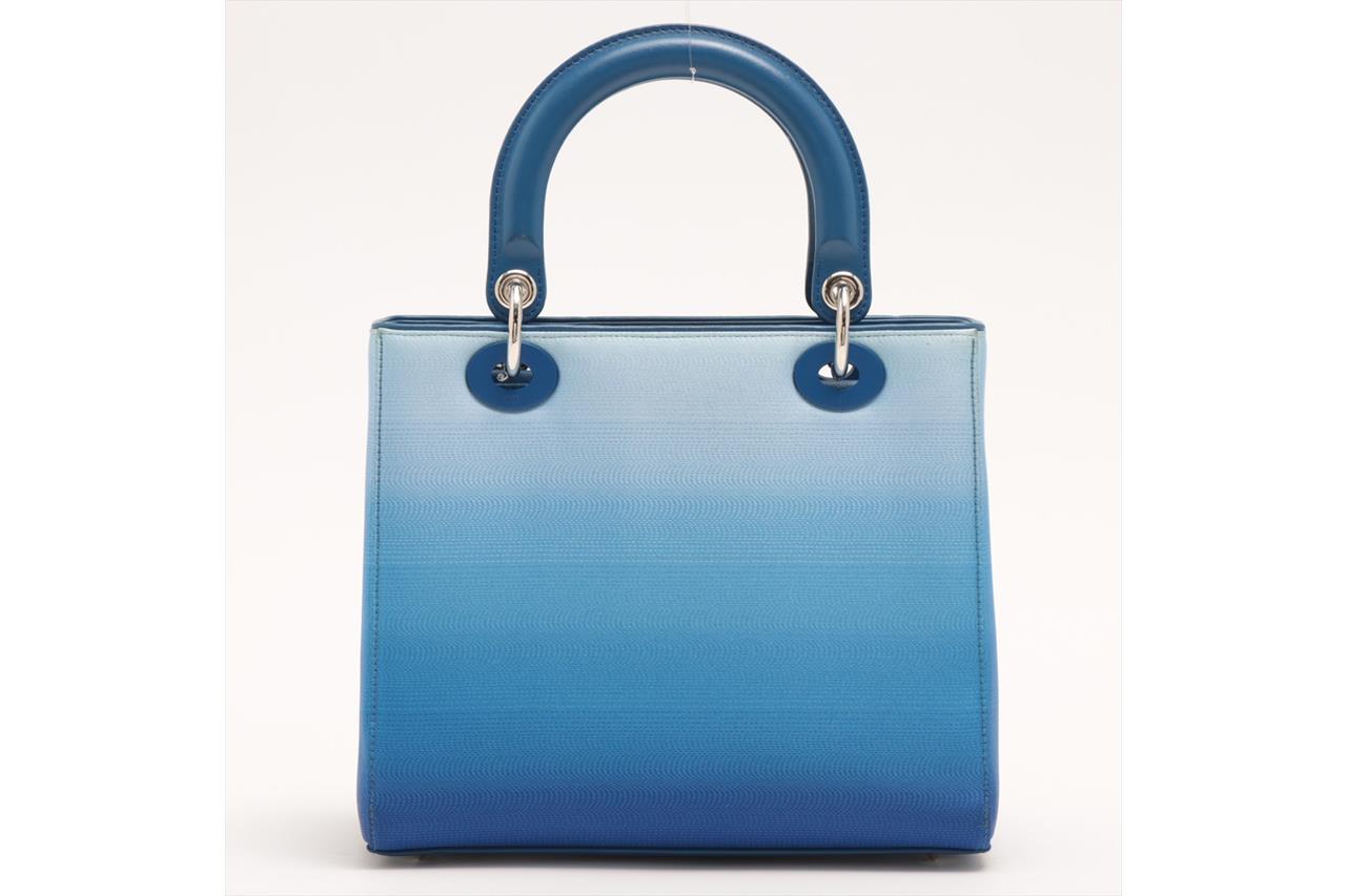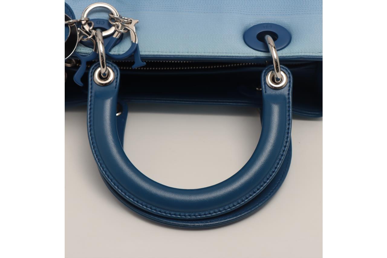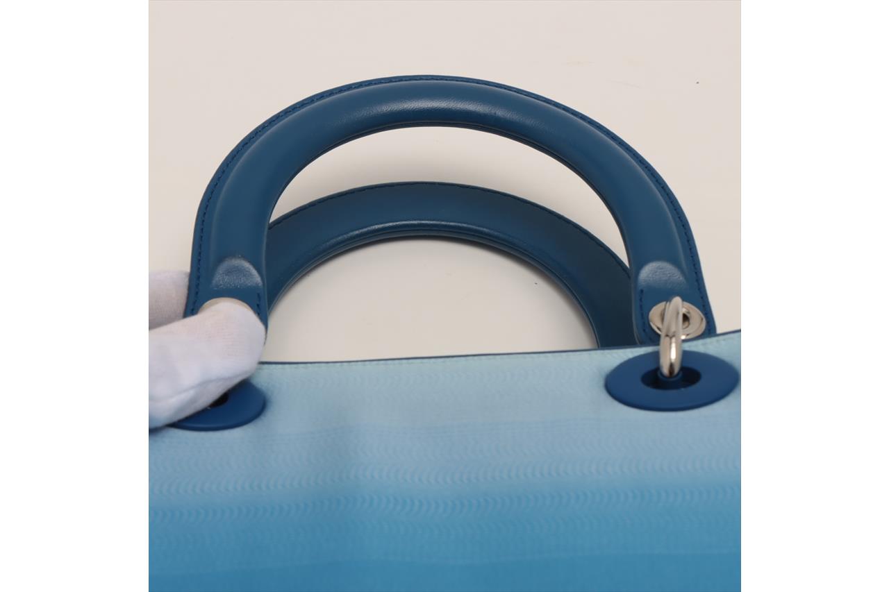 Christian Dior Lady Dior handbag in gradient blue satin & leather. Silver-toned hardware. The top is open to a blue leather interior with single zipped pocket. Zip closure on top. Approxiate dimensions: 23.5cm(L) x 20cm(H) x 11.5cm(D), 10cm handle drop height and 42cm detachable shoulder strap height. Accompanied by Dior certificate card. With Entrupy Certificate of Authenticity. (Pre-owned)