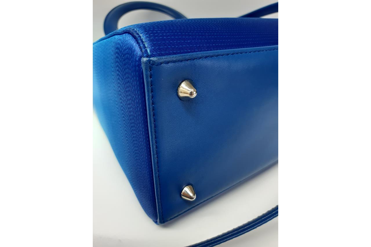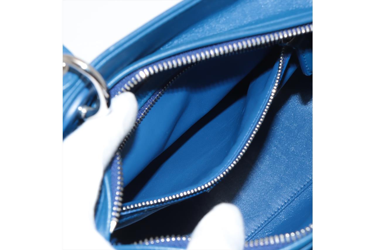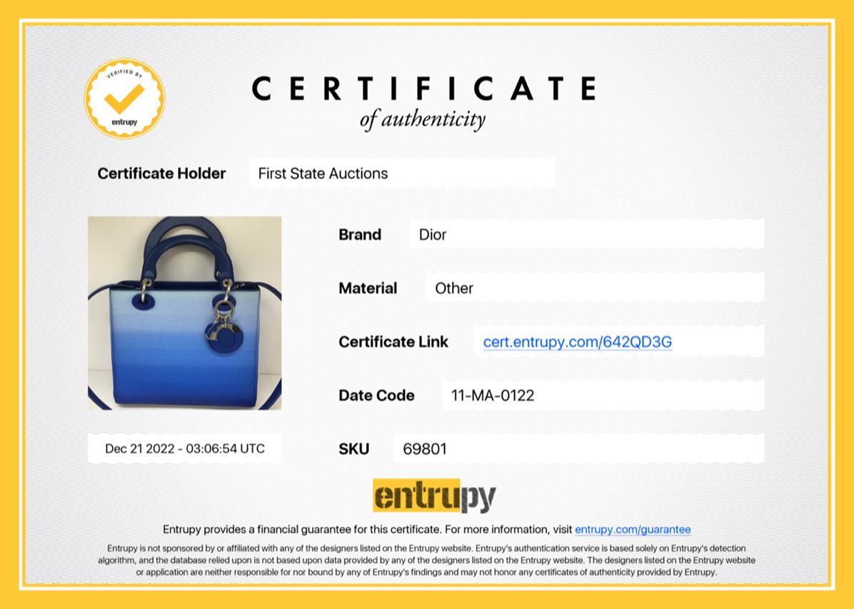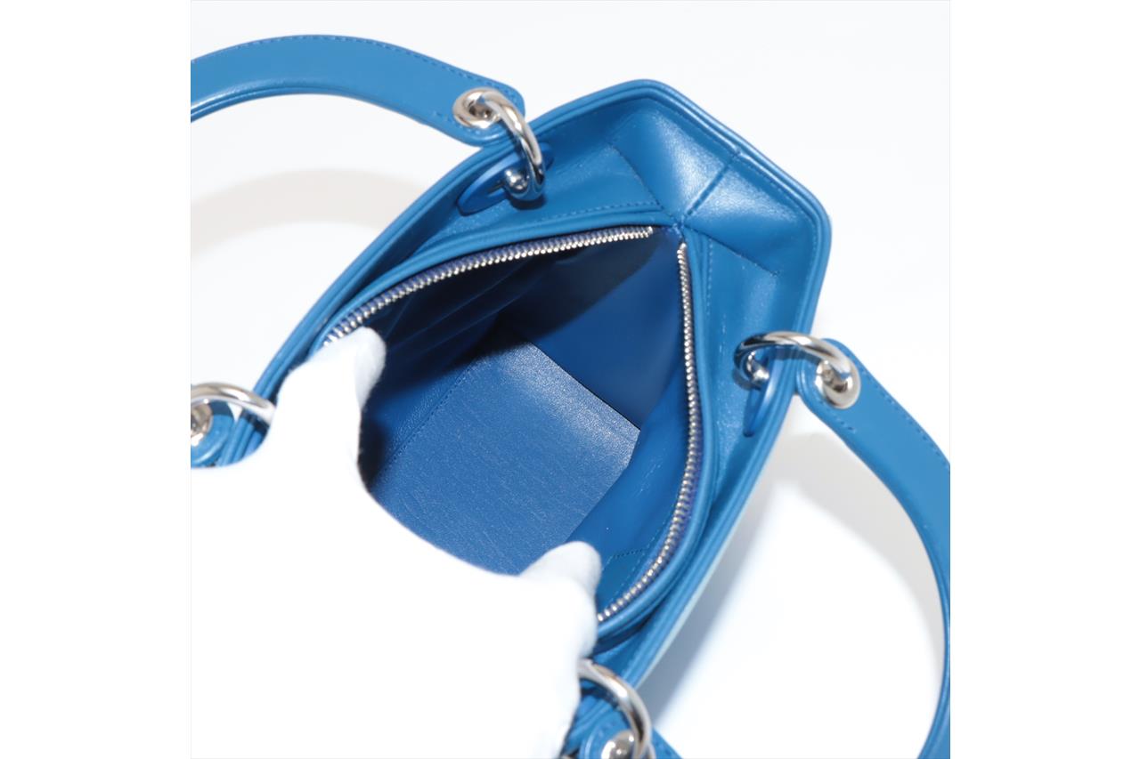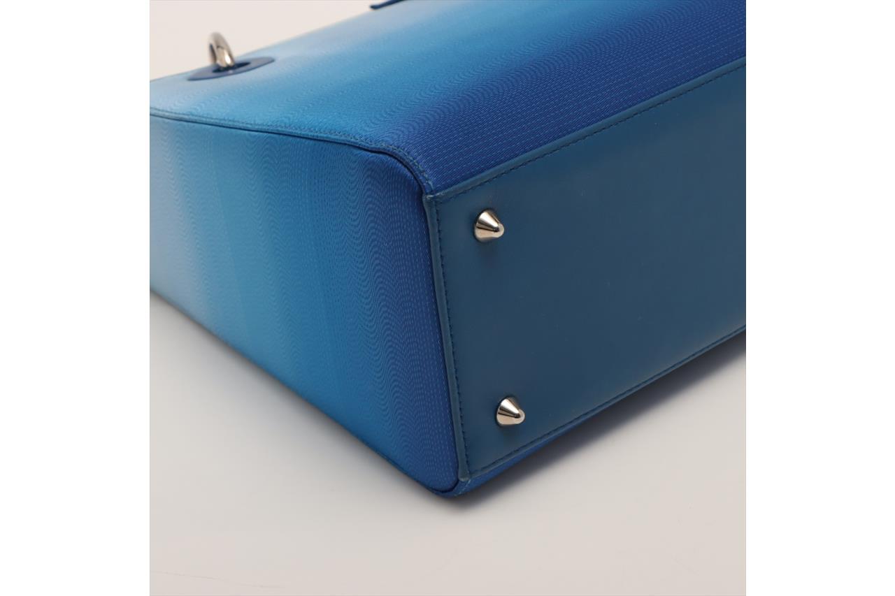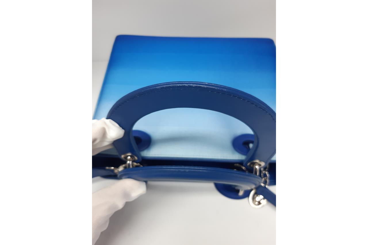 Christian Dior Lady Dior handbag in gradient blue satin & leather. Silver-toned hardware. The top is open to a blue leather interior with single zipped pocket. Zip closure on top. Approxiate dimensions: 23.5cm(L) x 20cm(H) x 11.5cm(D), 10cm handle drop height and 42cm detachable shoulder strap height. Accompanied by Dior certificate card. With Entrupy Certificate of Authenticity. (Pre-owned)