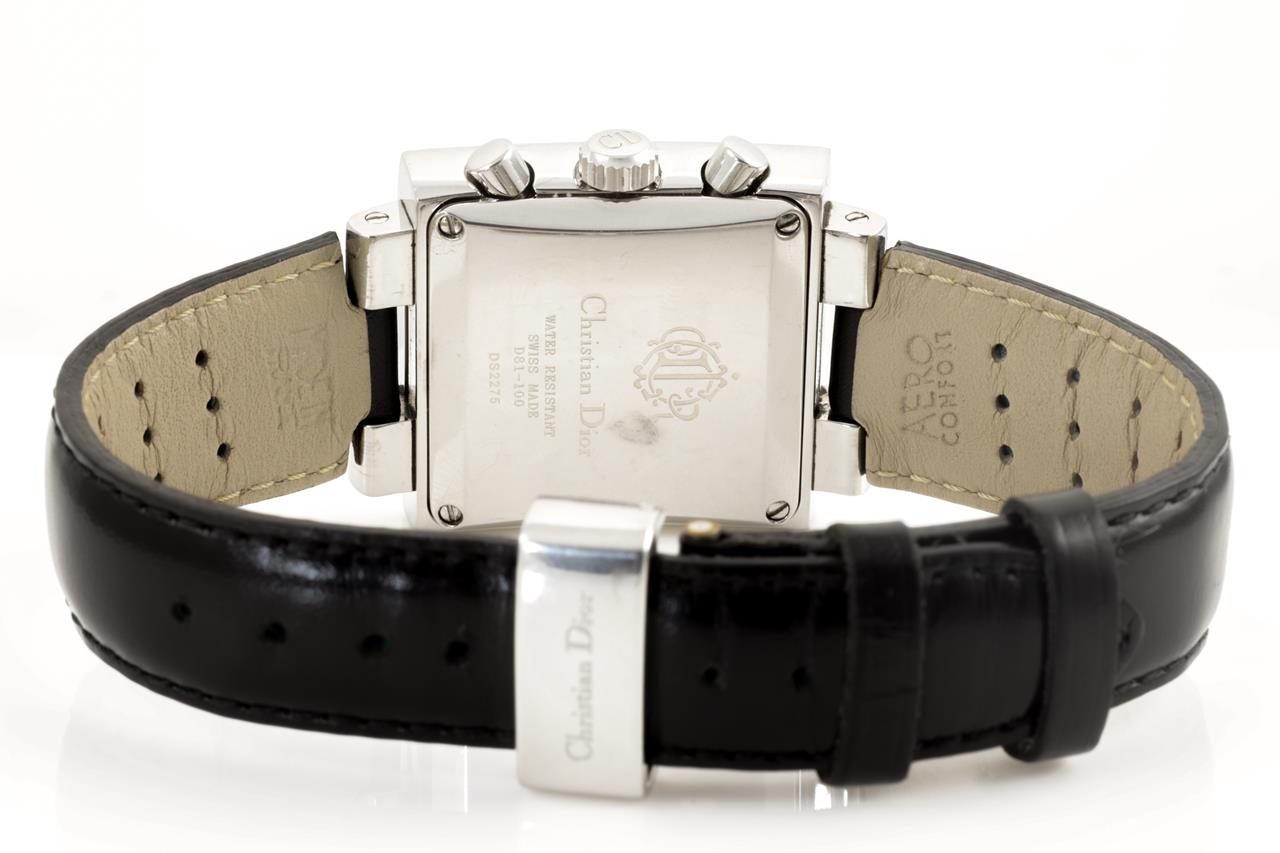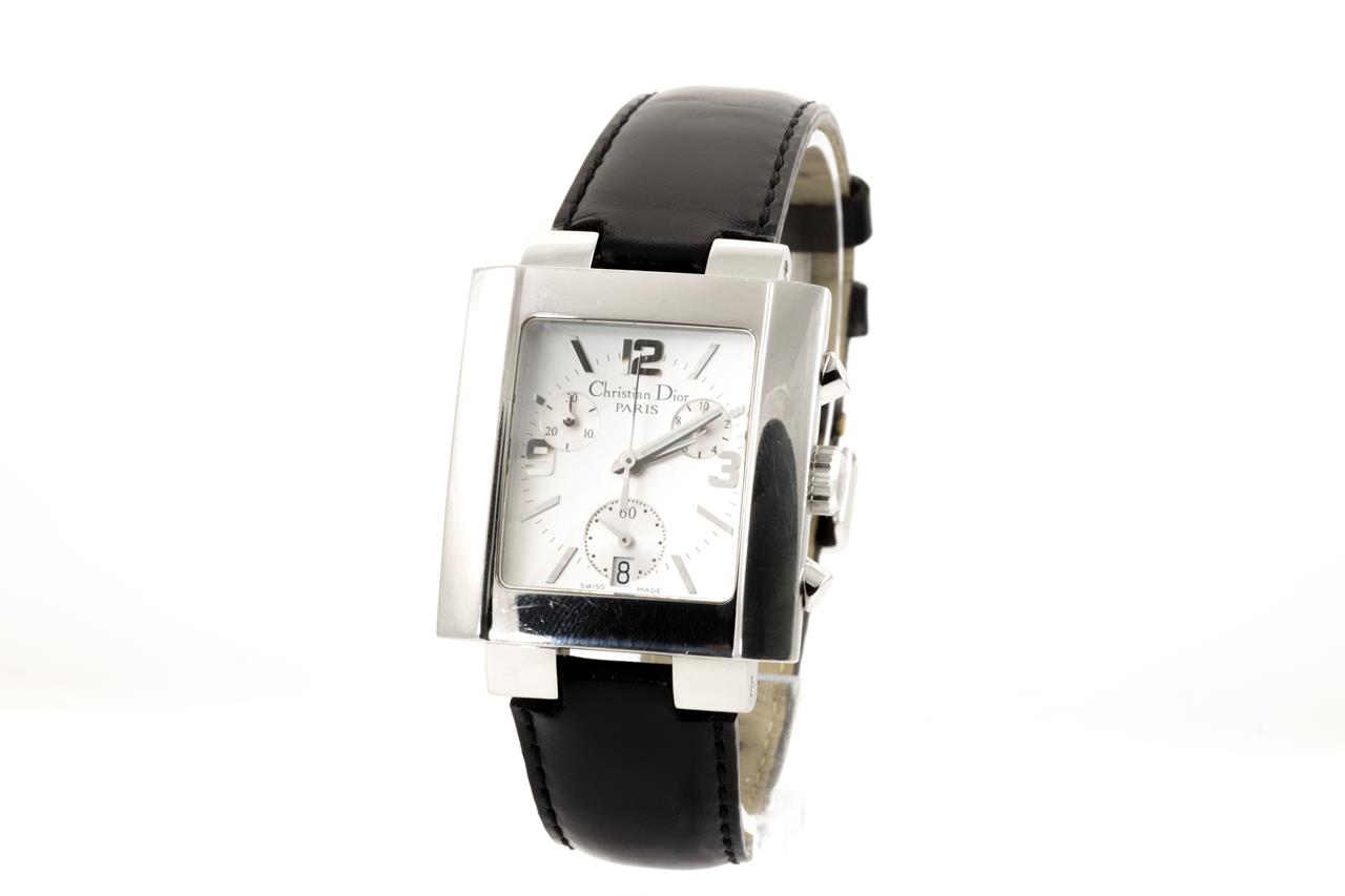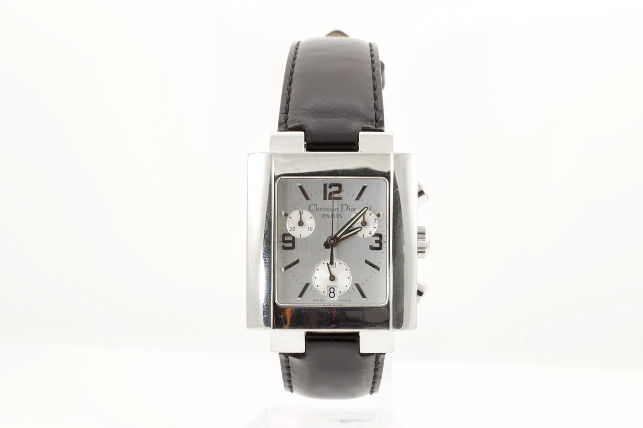 Christian Dior Riva stainless steel quartz watch. Silver chronograph dial, date, case diameter: 31mm x 11mm, Swiss made. Ref# D81-100. With unbranded black leather strap and Christian Dior clasp. With certificate of authenticity. 3 month FSA warranty. (Pre-owned)