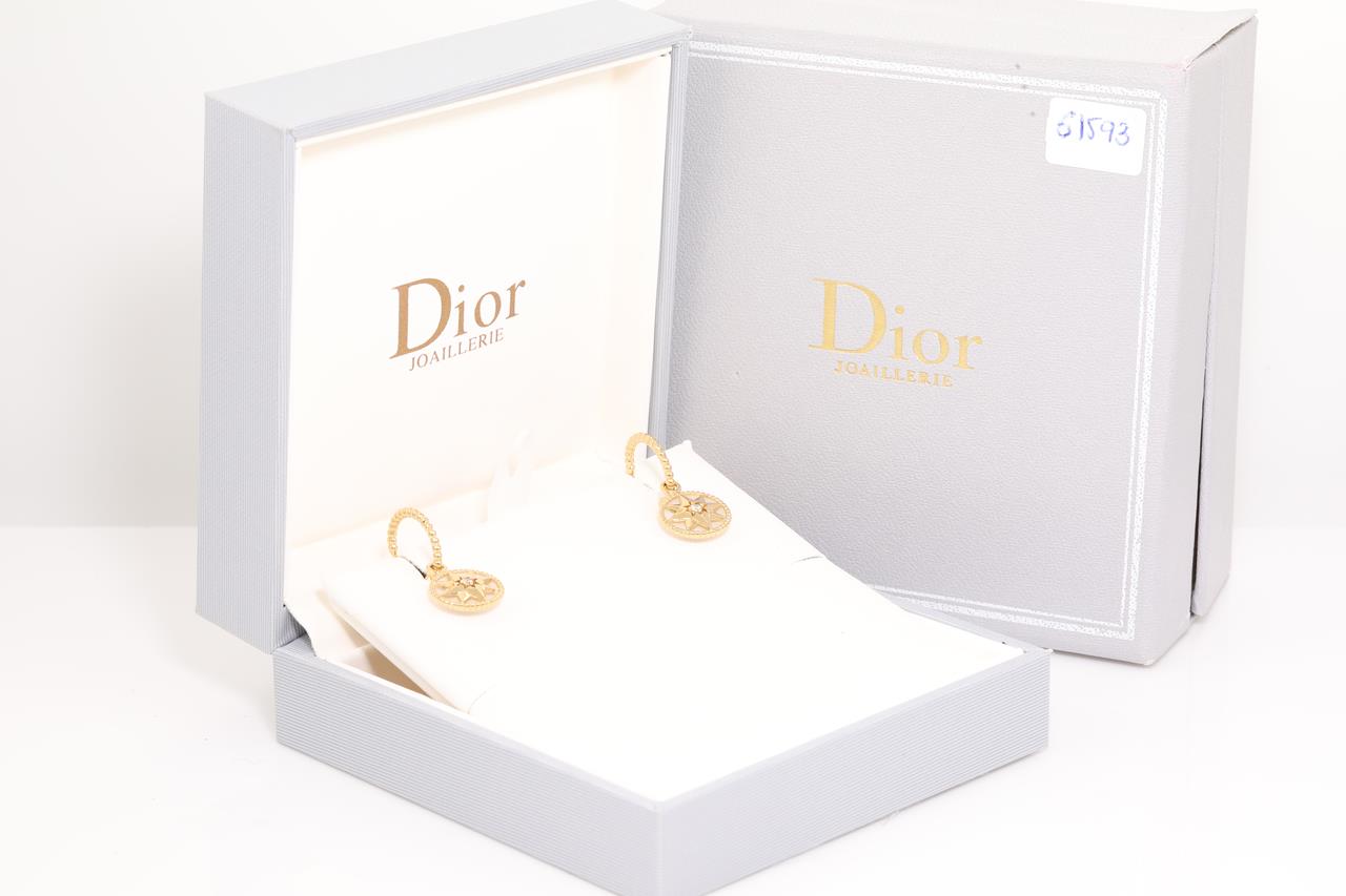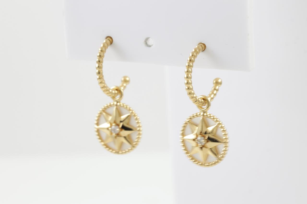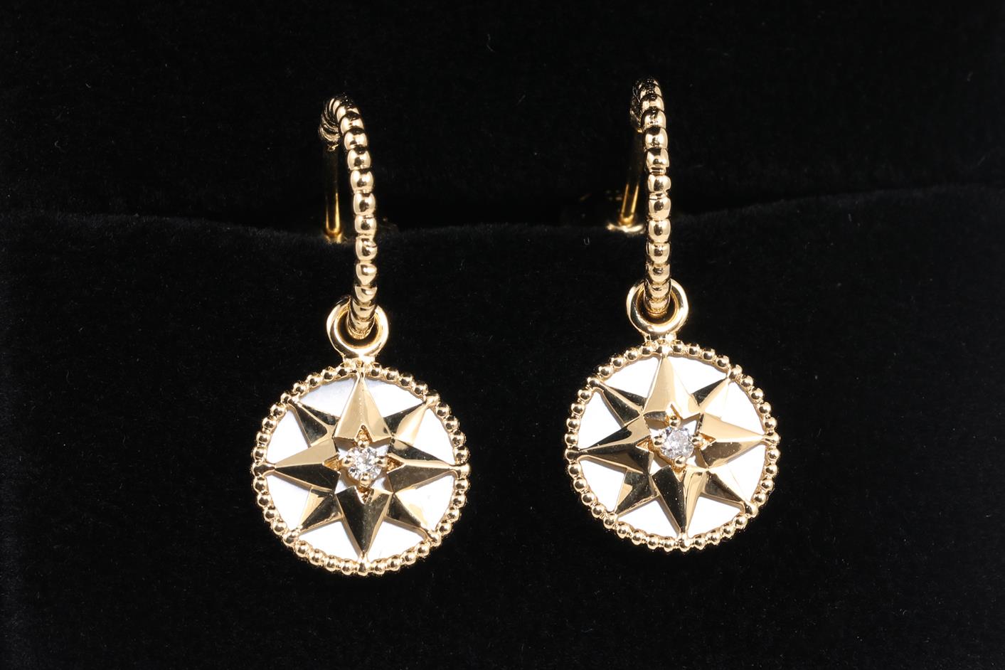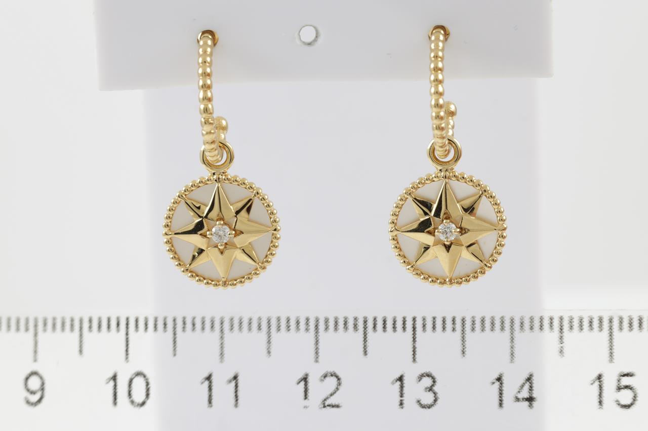 Christian Dior Rose Des Vents earrings with round Diamond totalling approximately 0.09cts and mother-of-pearl. 18ct yellow gold. Weight 4.5g. Diameter of motifs: 12mm. With Christian Dior box and Christian Dior Authenticity booklet dated 23/11/2018. (Pre-owned)