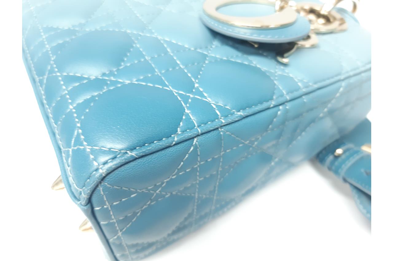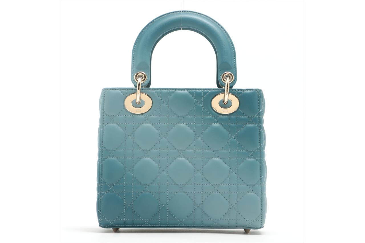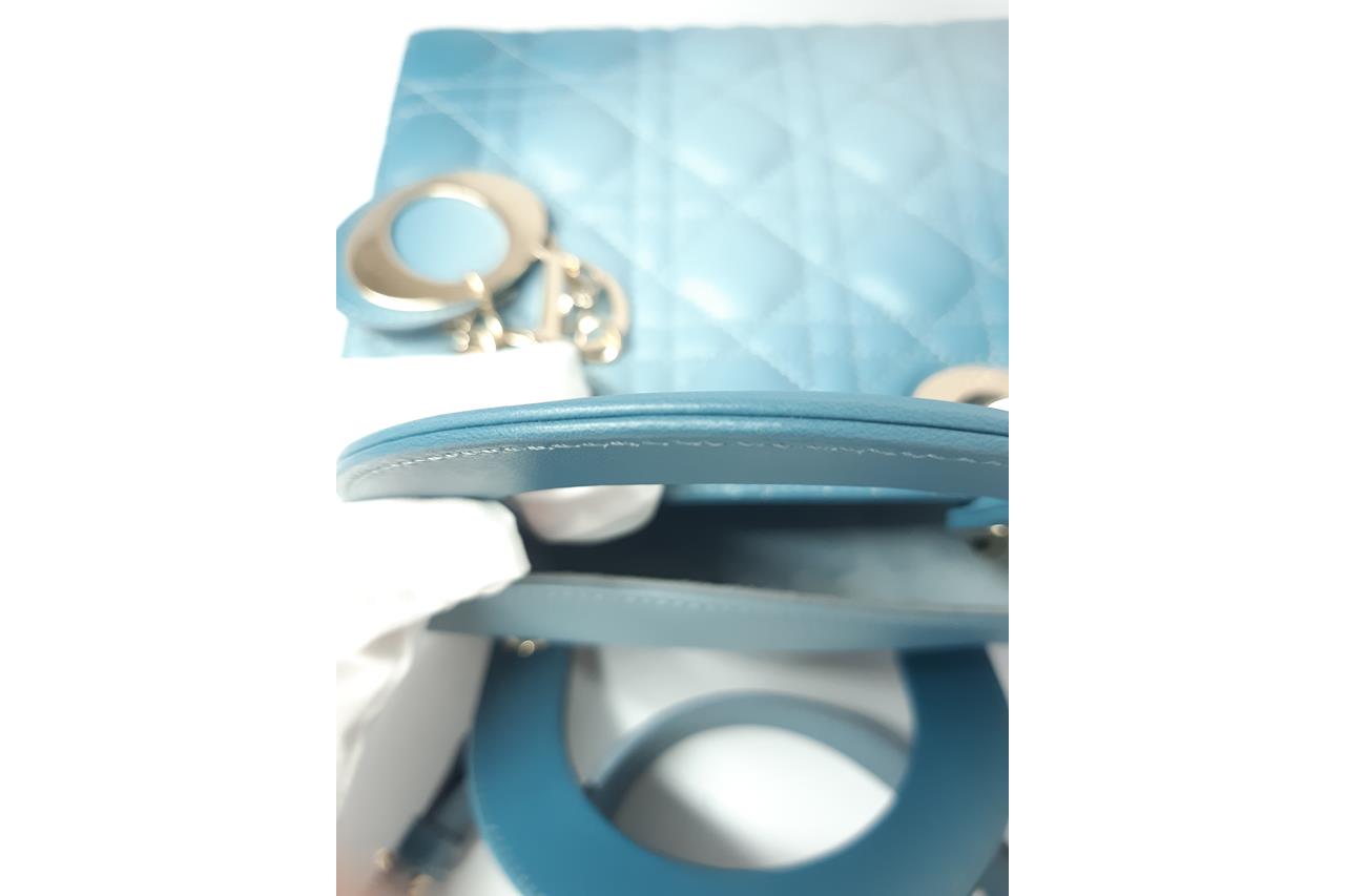 Christian Dior Small Lady Dior My ABCDIOR Bag in Denim Blue Gradient Cannage Lambskin Leather. Featuring gold-tone hardware, 'D.I.O.R.' charms, interior zip and patch pocket, and top leather flap closure. Approximate dimensions: 20cm (L) x 17cm (H) x 8.5cm (D), 8.5cm handle drop and 53cm detachable strap drop. Accompanied by Dior box and dust bag. With Entrupy Certificate of Authenticity. (Pre-owned)