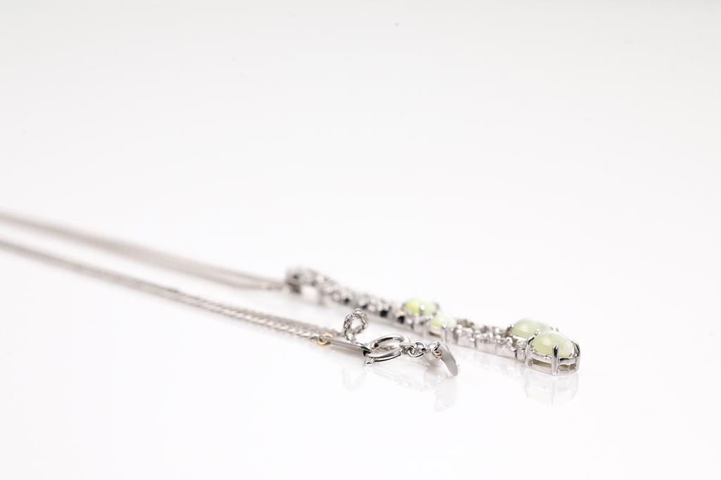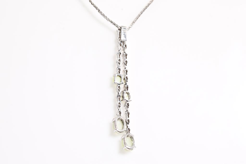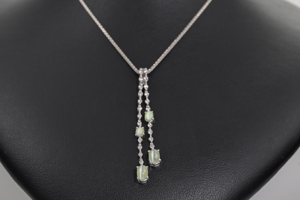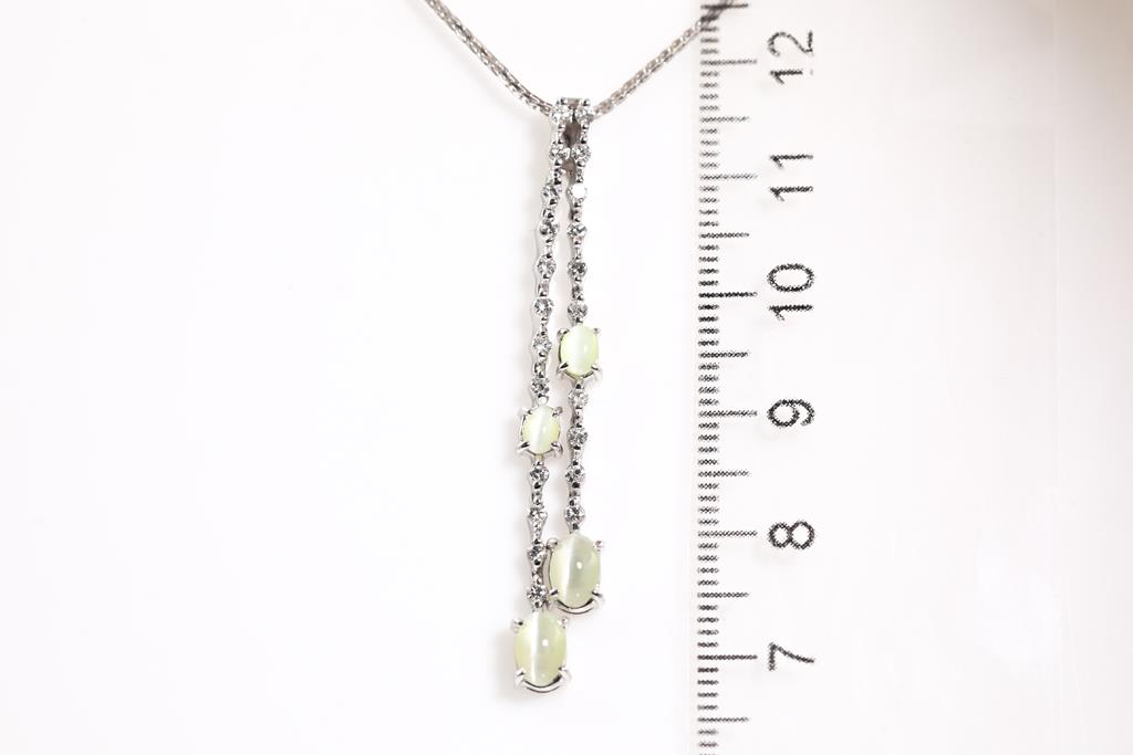 Chrysoberyl and Diamond Pendant with 4 oval cabochon cut Chrysoberyl Cats Eye of 1.81ct and round Diamonds totalling 0.40cts (Estimate grading: G-H SI). 18ct white gold with 45cm adjustable chain. Weigth: 6.3g. (Pre-owend)
