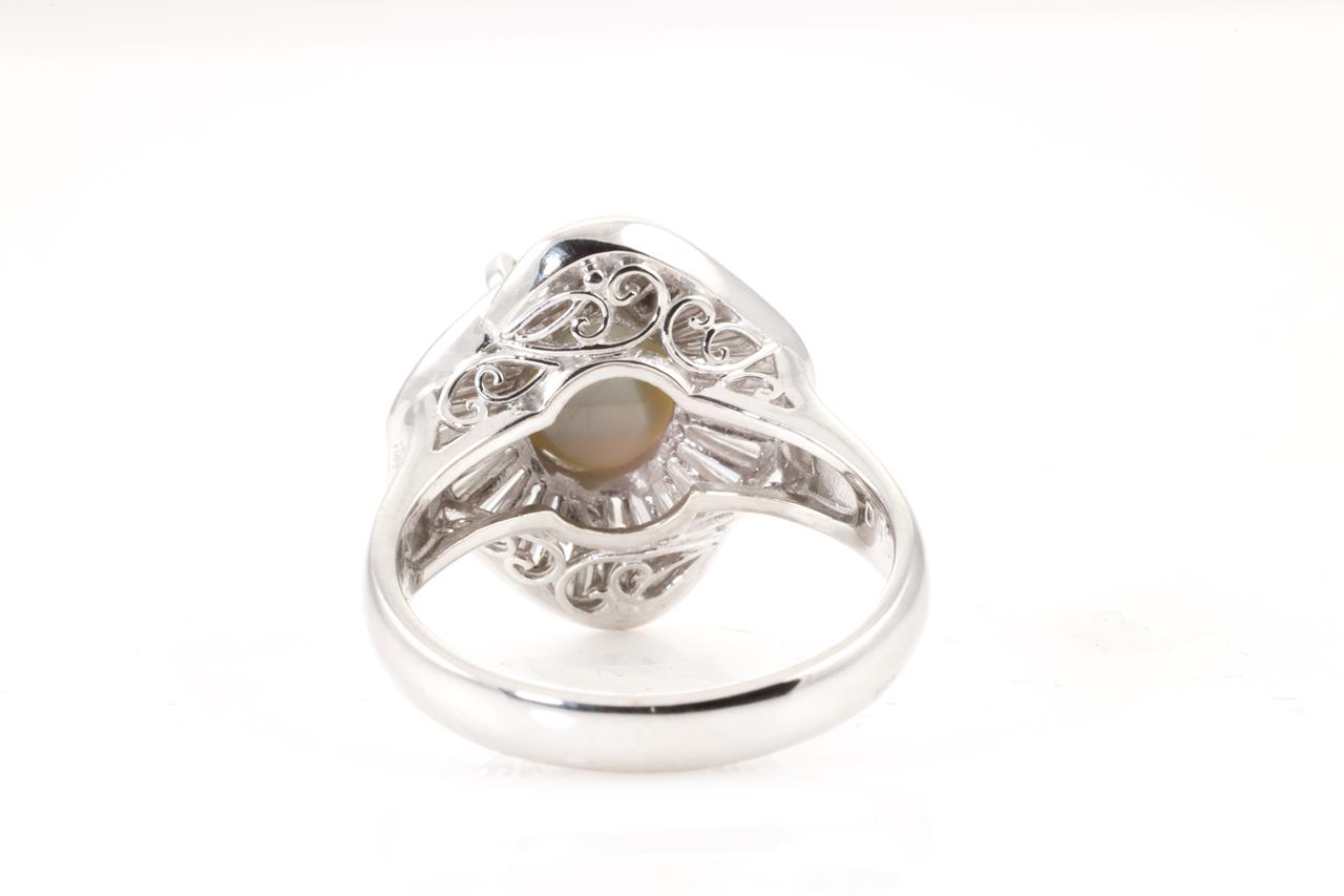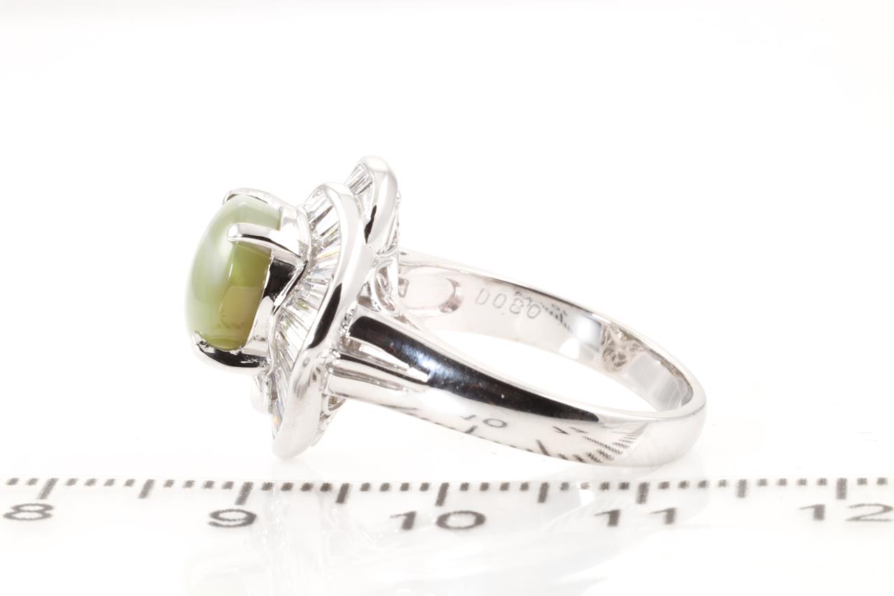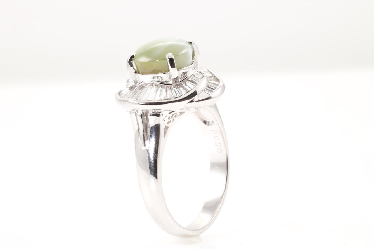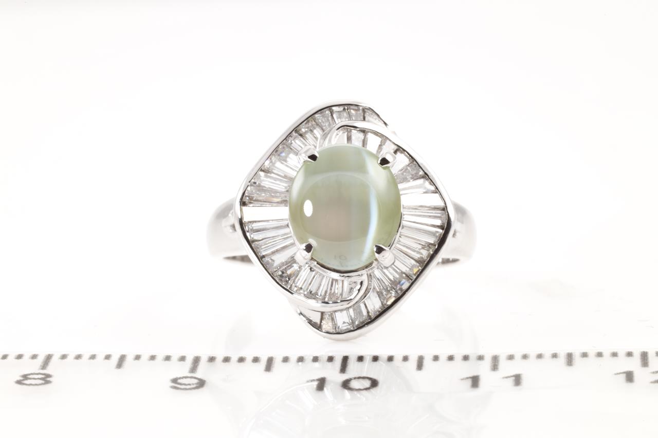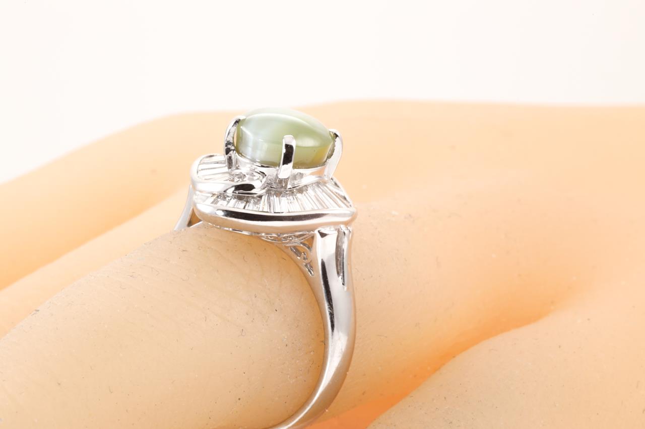 Chrysoberyl and Diamond ring with Chrysoberyl Cat's Eye of 3.71ct and baguette cut Diamonds totalling 0.80cts (Estimated grading: G VS-SI). Platinum. Ring size L. Weight: 8.7g (Pre-owned)