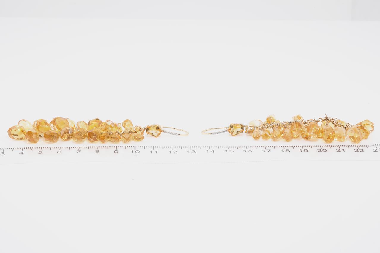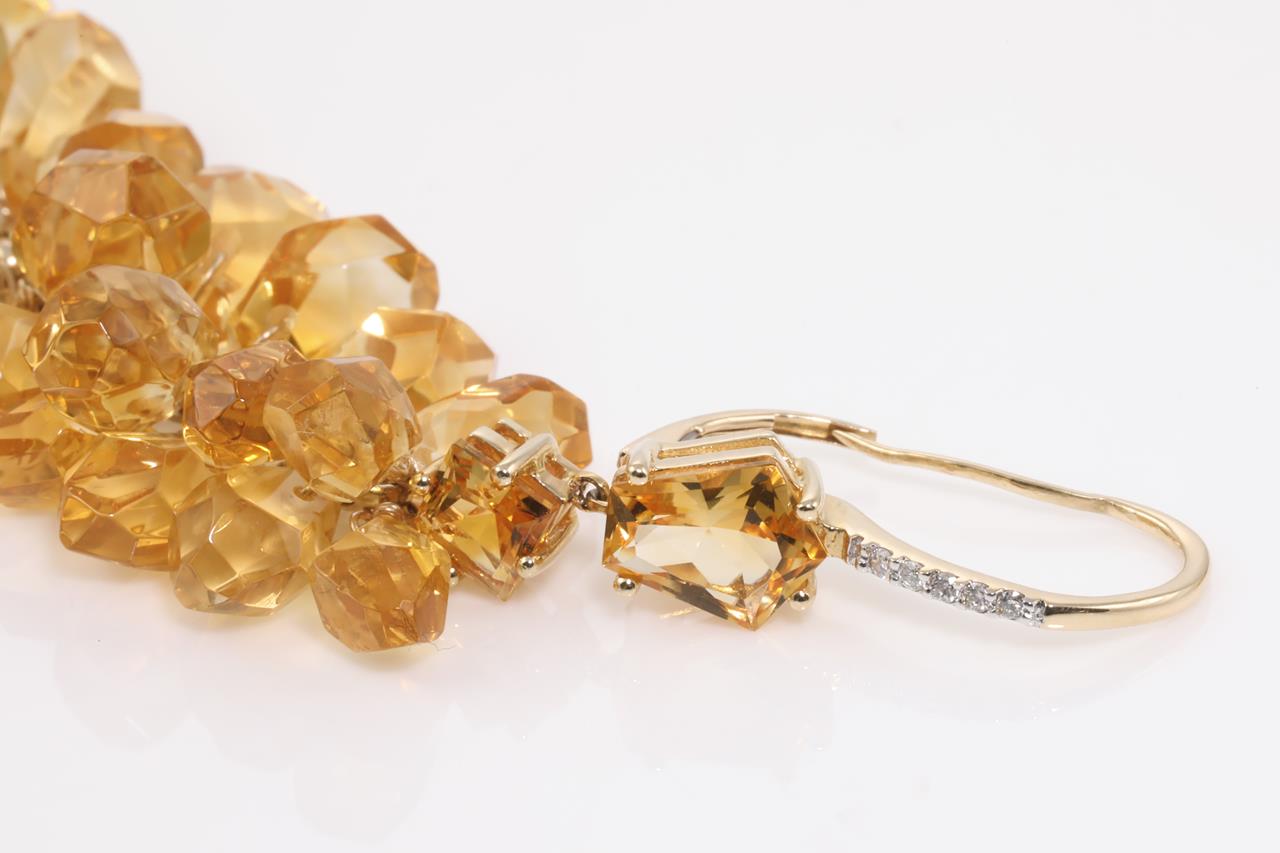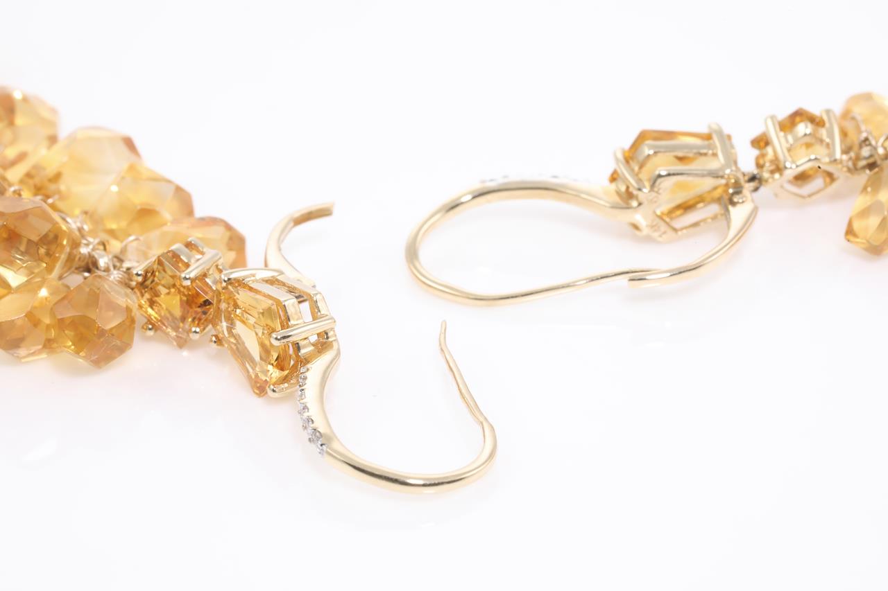 Citrine and Diamond leverback Earrings with fancy cut Citrines totalling approximately 139.25cts and round Diamonds totalling 0.08ct. 14ct yellow gold. Weight 32.8g. (Pre-owned)