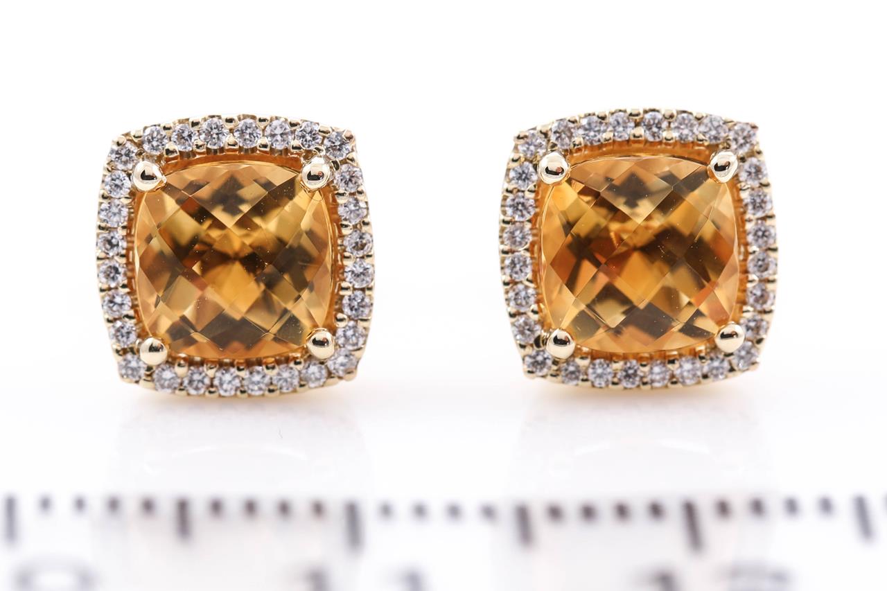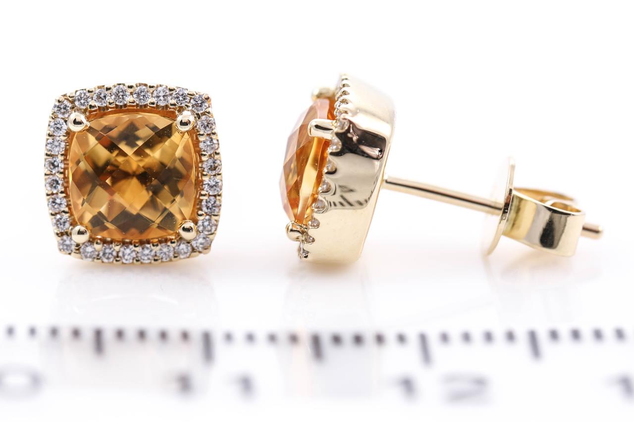Citrine and Diamond earrings with cushion cut Citrine totalling 1.70cts and Diamonds totalling 0.16cts. 14ct yellow gold. Weight: 2.7g. (New)