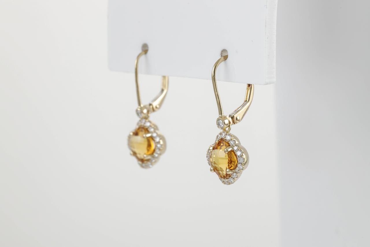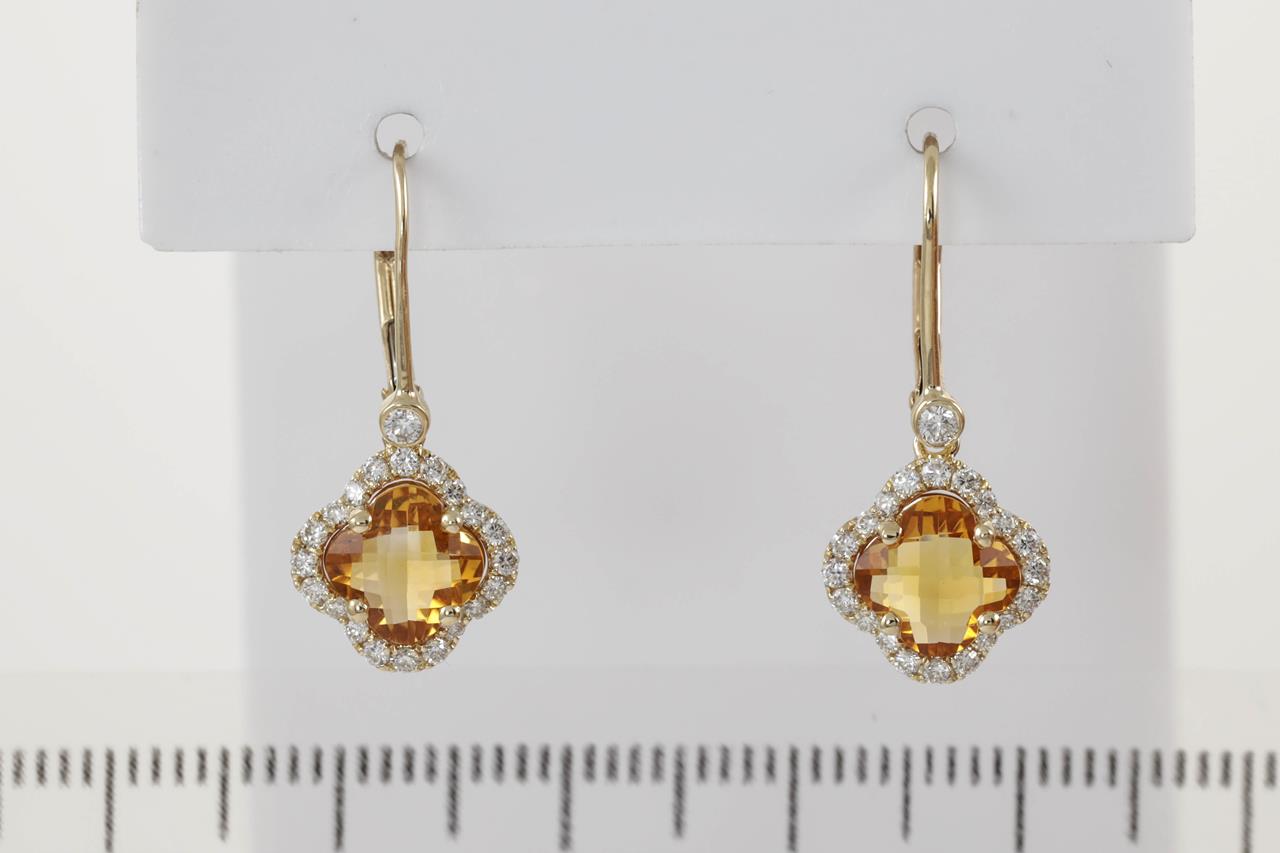 Citrine and Diamond leverback earrings with fancy shape checkerboard cut Citrines totalling 1.42cts and Diamonds totalling 0.31cts (Estimated grading: H SI). 14ct yellow gold. Weight: 2.5g. (New)