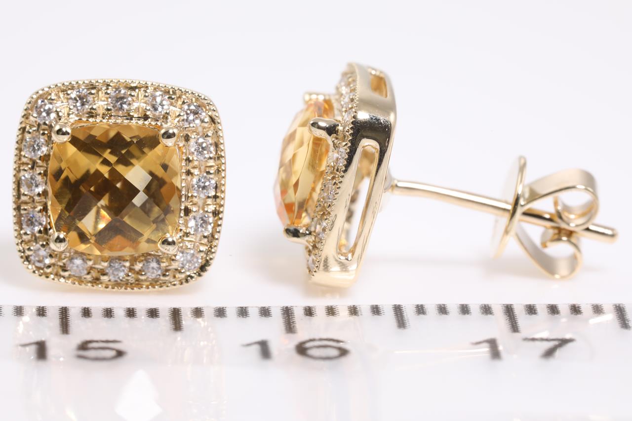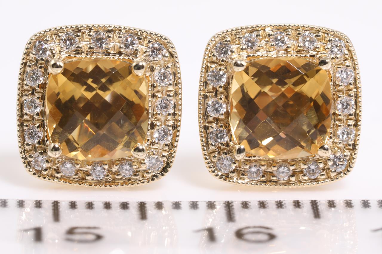 Citrine and Diamond earrings with cushion cut Citrine totalling 1.71cts and Diamonds totalling 0.19cts. 14ct yellow gold. Weight: 2.6g. (New)