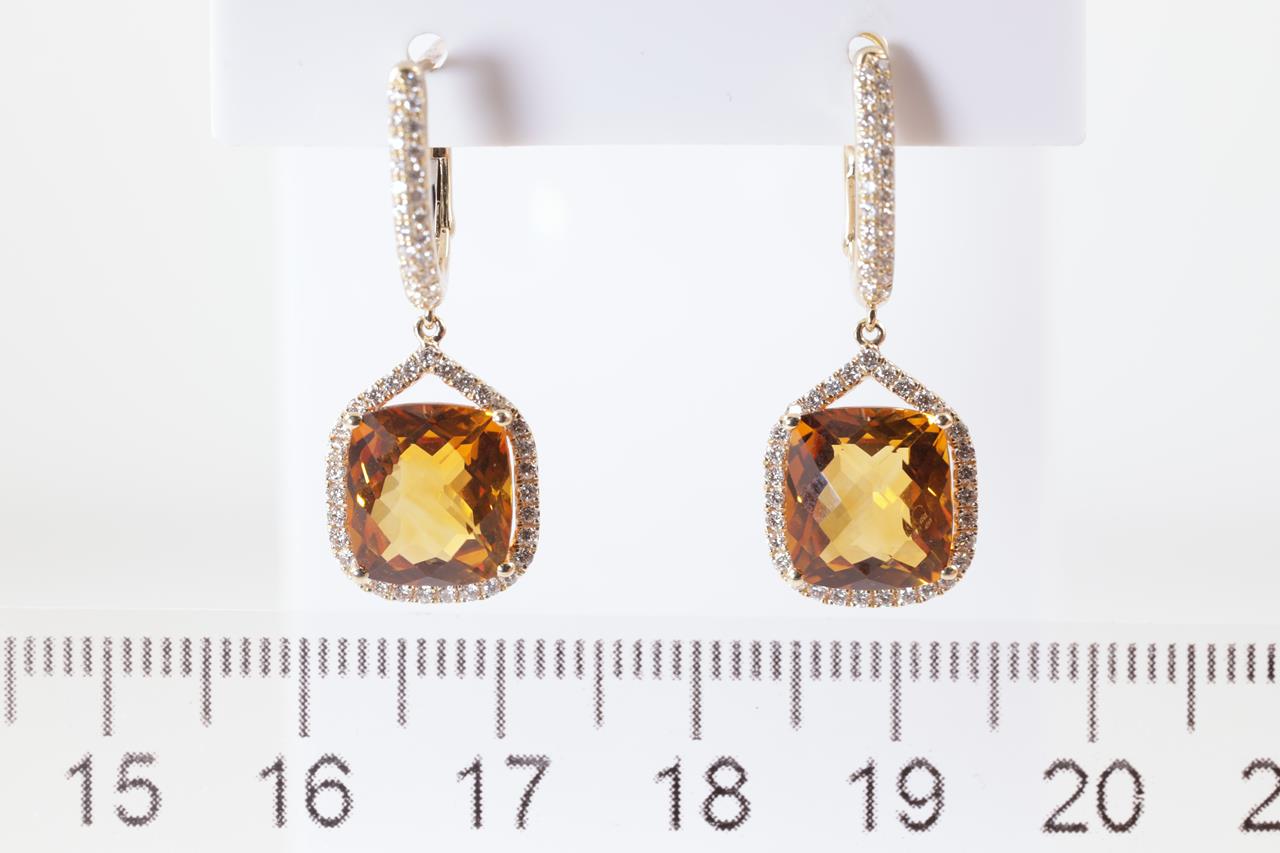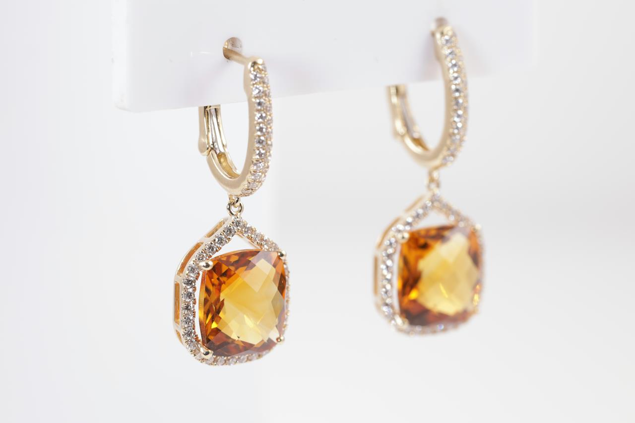 Citrine and Diamond earrings with cushion cut Citrine totalling 6.05cts and Diamonds totalling 0.48cts (Estimated grading: H SI). 14ct yellow gold. Weight: 4.3g. (New)