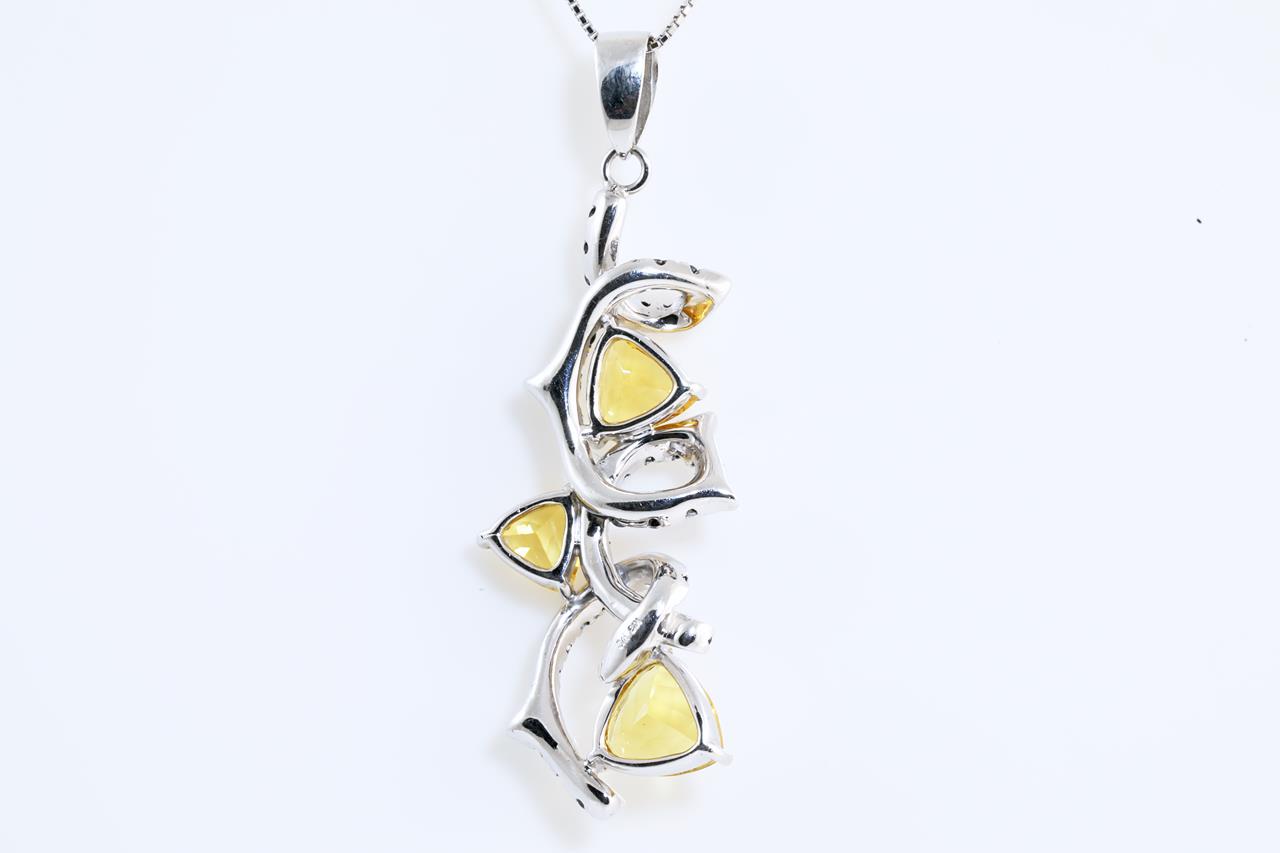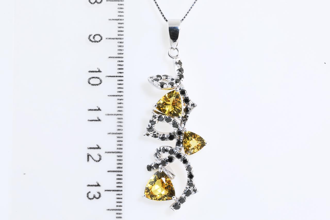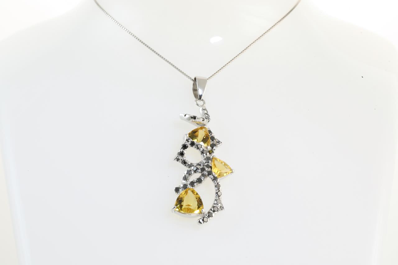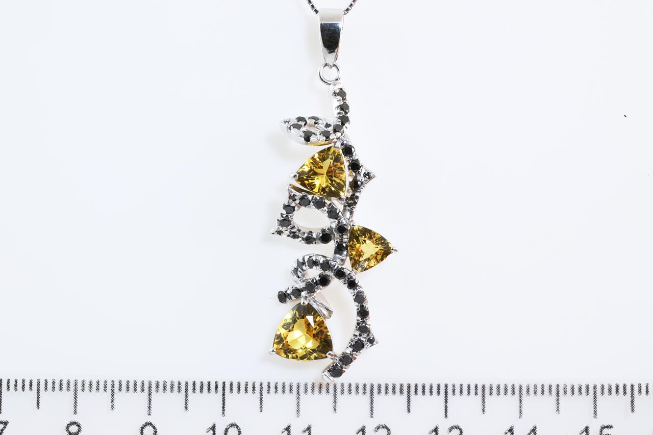 Citrine and Diamond pendant with black Diamonds and 3 trilliant cut Citrines. 18ct white gold with adjustable 40cm chain. Weight: 9.5g. (Pre-owned)