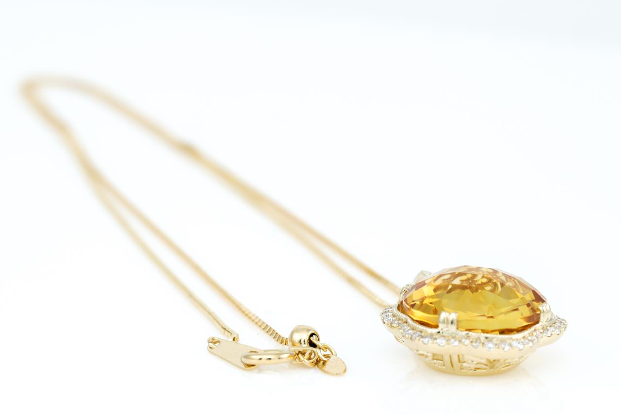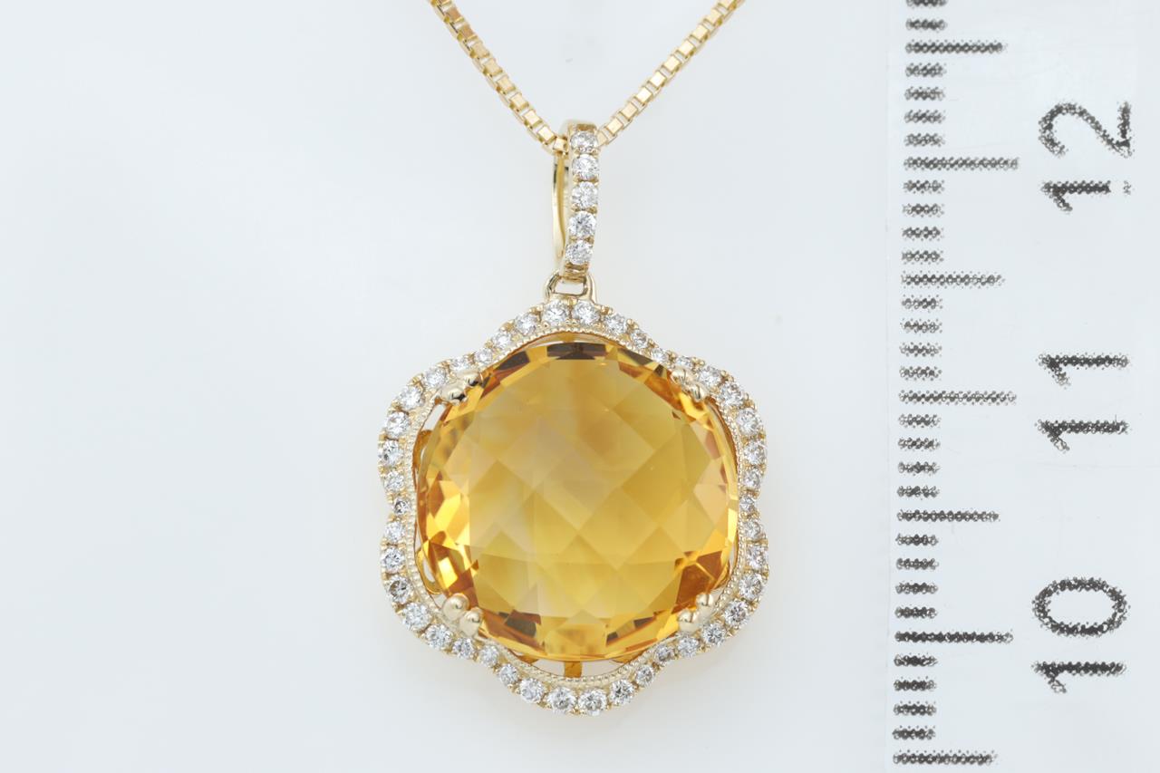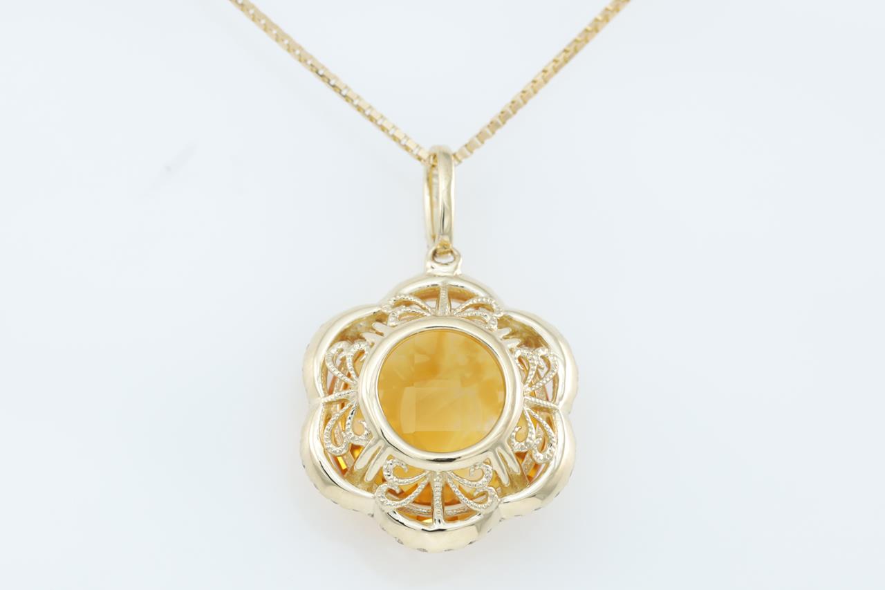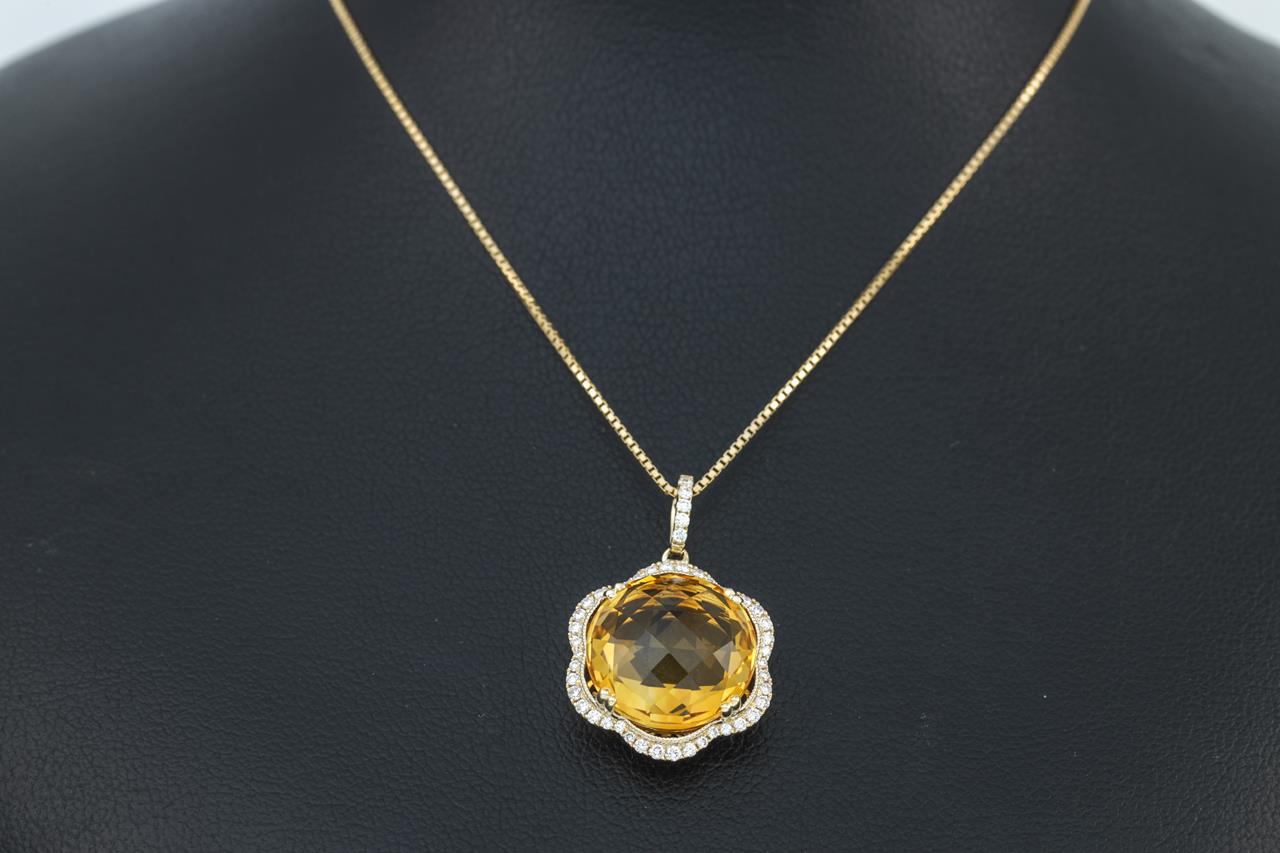 Citrine and Diamond pendant with a round checkerboard cut Citrine of 5.77ct and Diamonds totalling 0.23cts. 14ct yellow gold with 18ct gold 44cm adjustable chain. Weight: 5.4g. (New)