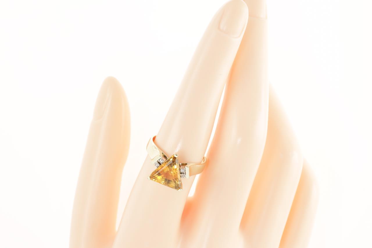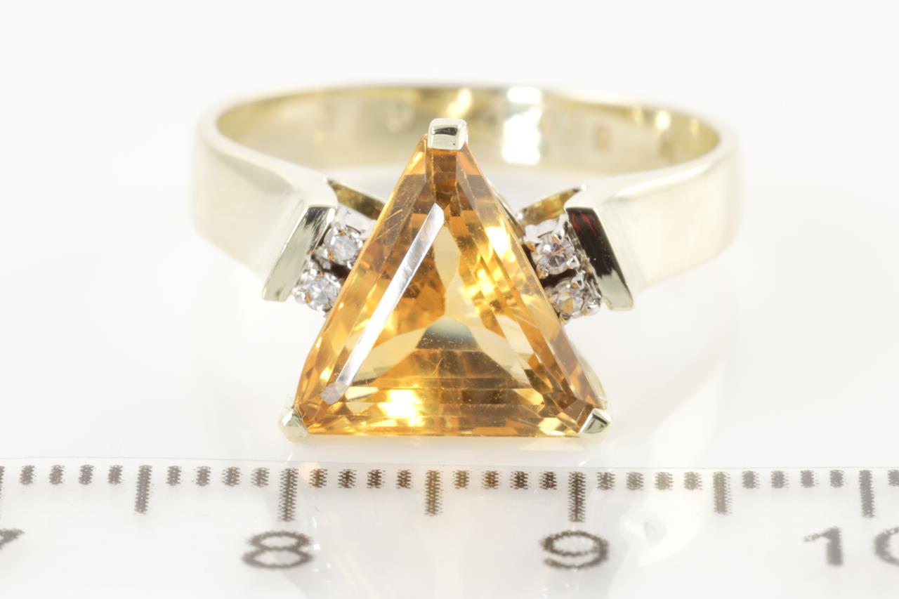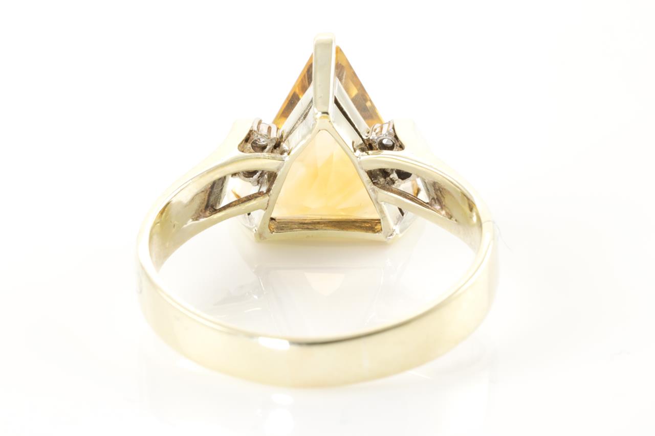 Citrine and Diamond ring with trilliant cut Citrine of 3.75ct and four round Diamonds totalling 0.06cts. 14ct yellow gold. Ring size P1/2. Weight 4.5g. (Pre-owned).