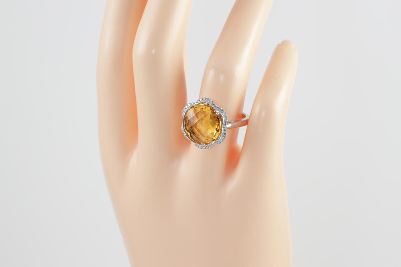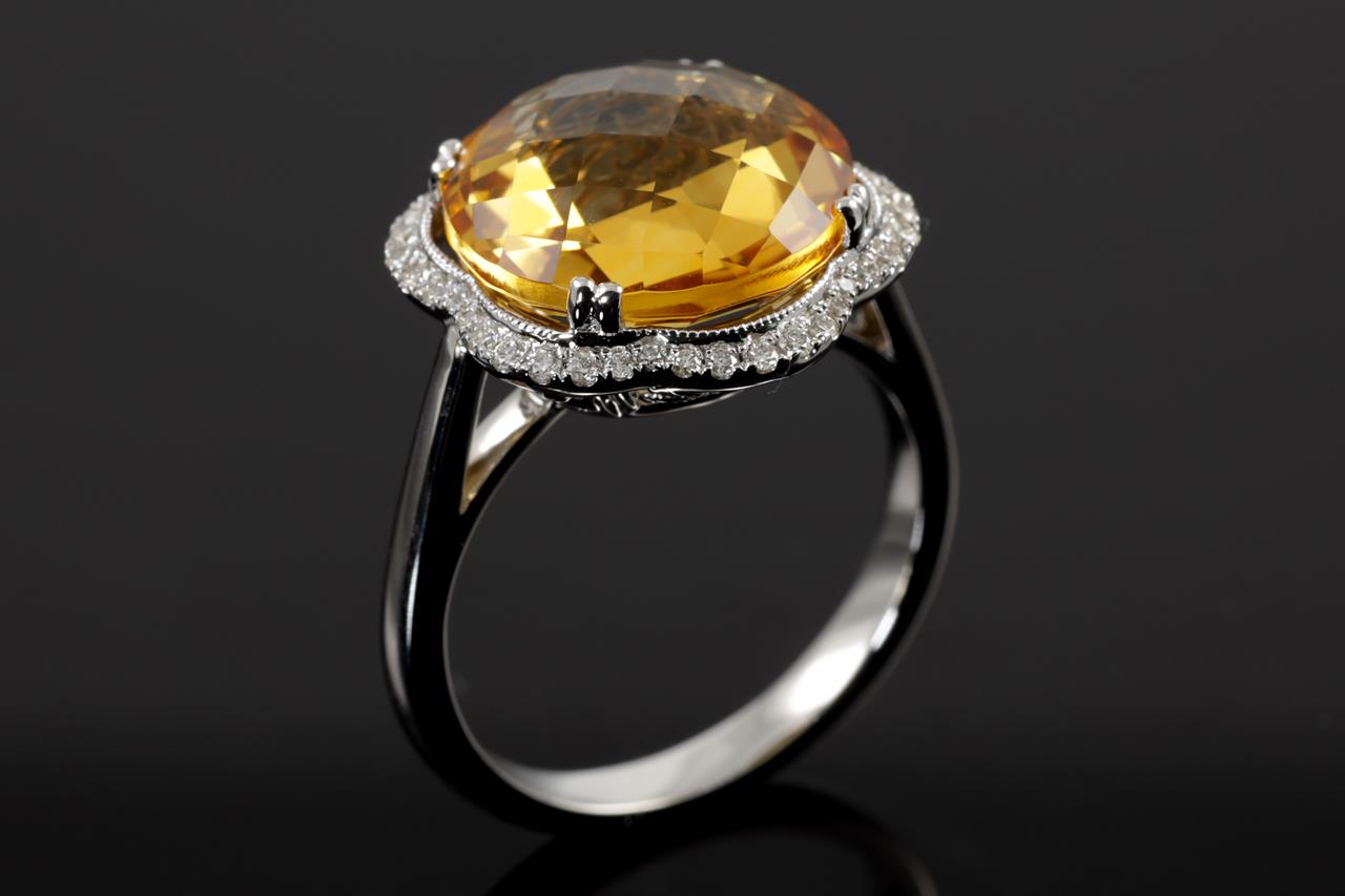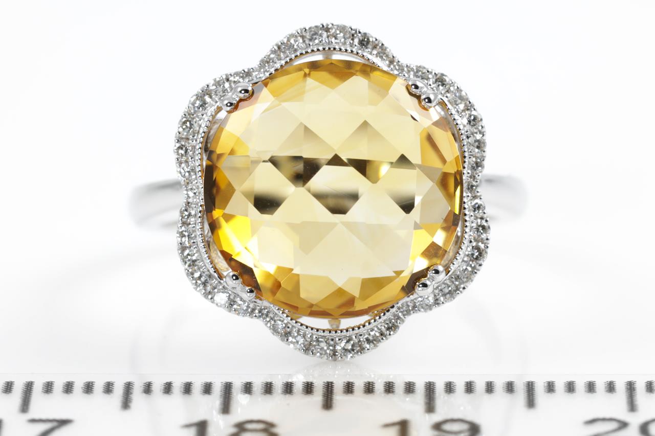 Citrine and Diamond ring with a round Citrine of 6.84ct and Diamonds totalling 0.21cts. 14ct white gold. Ring size N. Weight: 5.4g. (New)