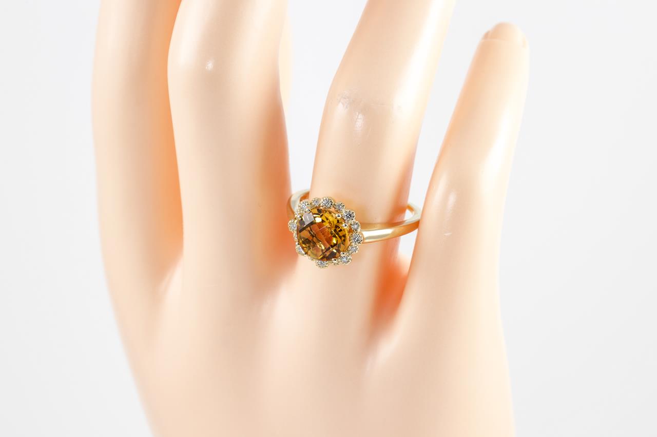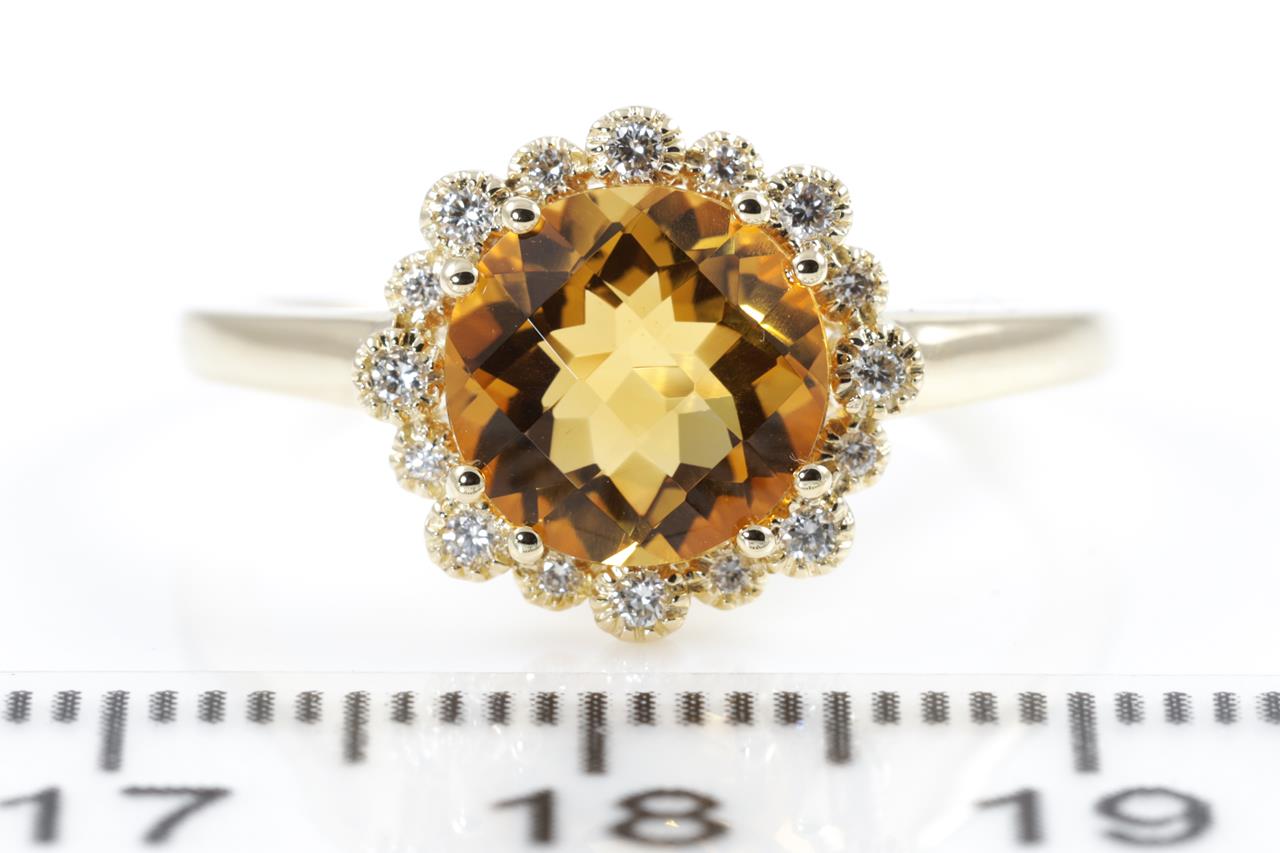 Citrine and Diamond ring with a round Citrine of 1.72ct and Diamonds totalling 0.09cts. 14ct yellow gold. Ring size N. Weight: 2.7g. (New)