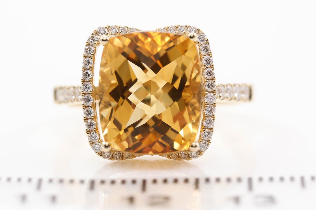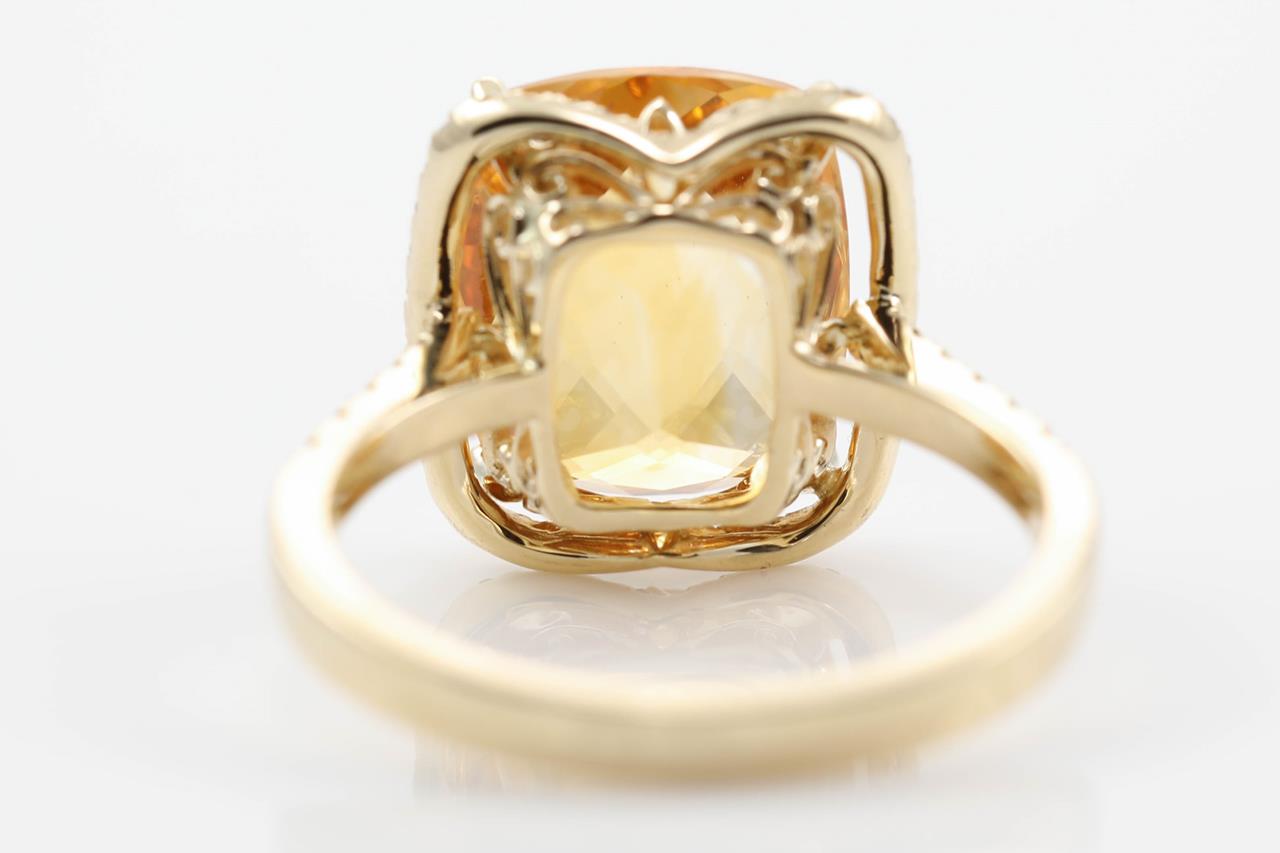 Citrine and Diamond ring with a cushion cut Citrine of 5.48ct and Diamonds totalling 0.36cts (Estimated grading: H SI). 14ct yellow gold. Ring size N - ring resizing is not recommended. Weight: 4.2g. (New)