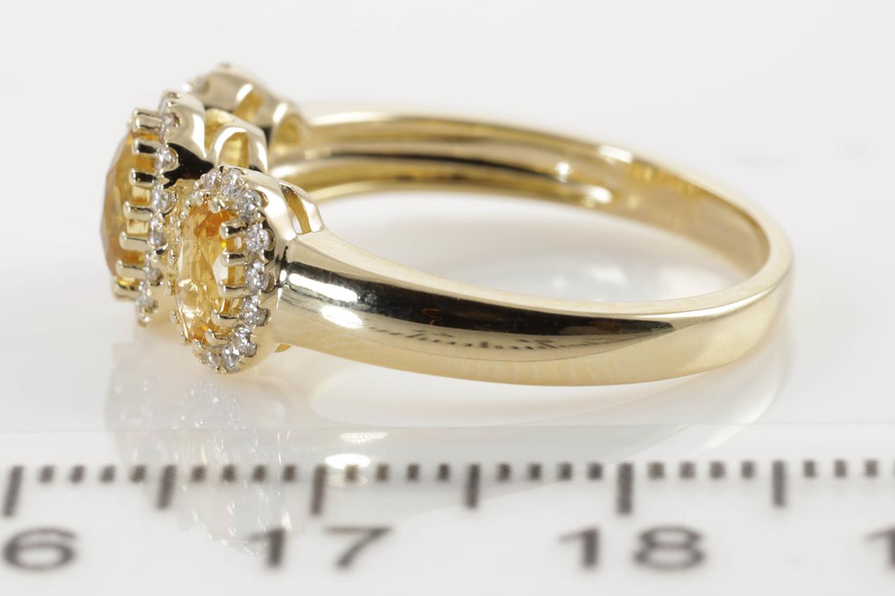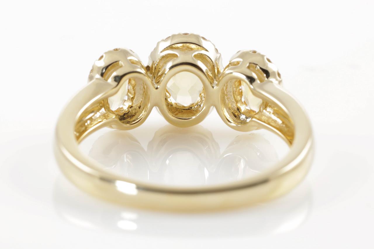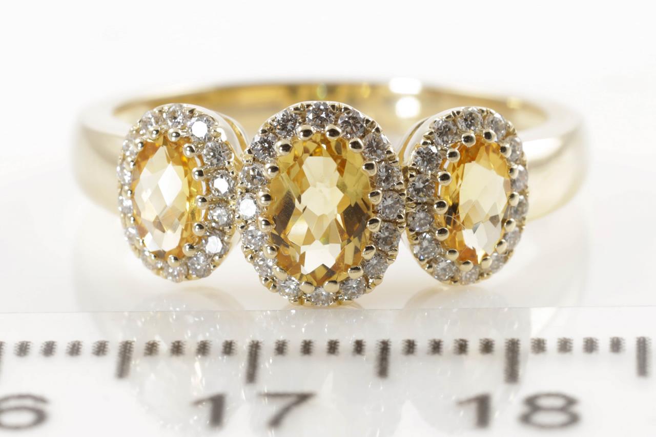 Citrine and Diamond ring with 3 oval Citrines totalling 0.80ct and Diamonds totalling 0.27cts. 14ct yellow gold. Ring size N. Weight: 3.8g. (New)