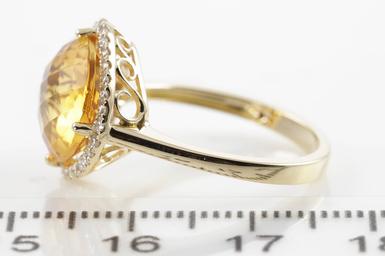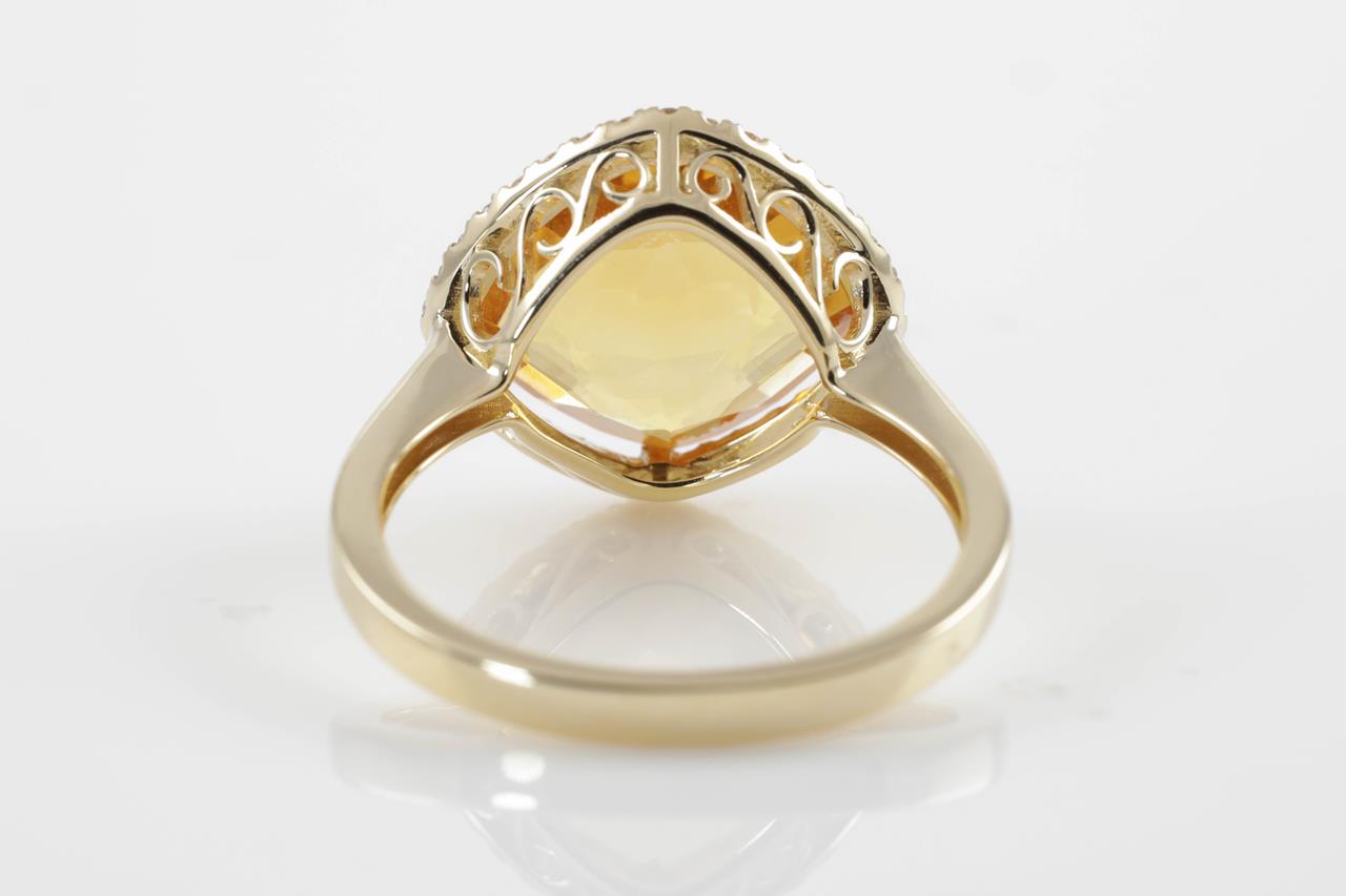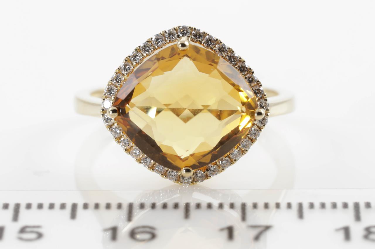 Citrine and Diamond ring with a cushion checkerboard cut Citrine of 5.23ct and Diamonds totalling 0.22cts. 14ct yellow gold. Ring size N. Weight: 3.4g. (New)