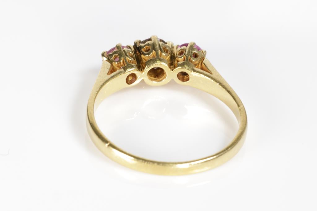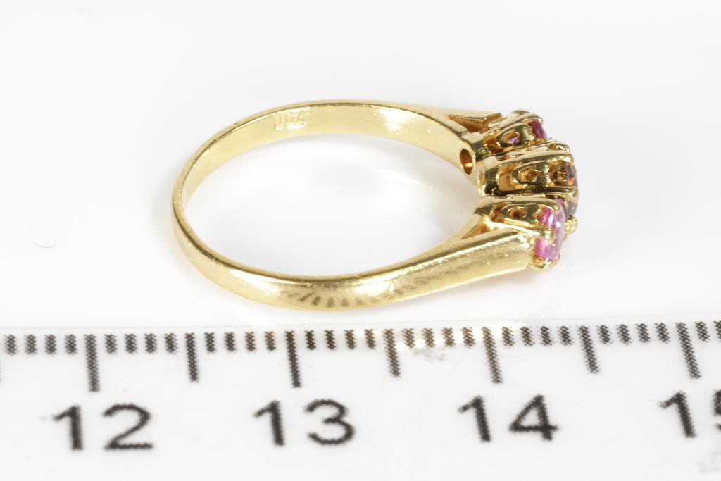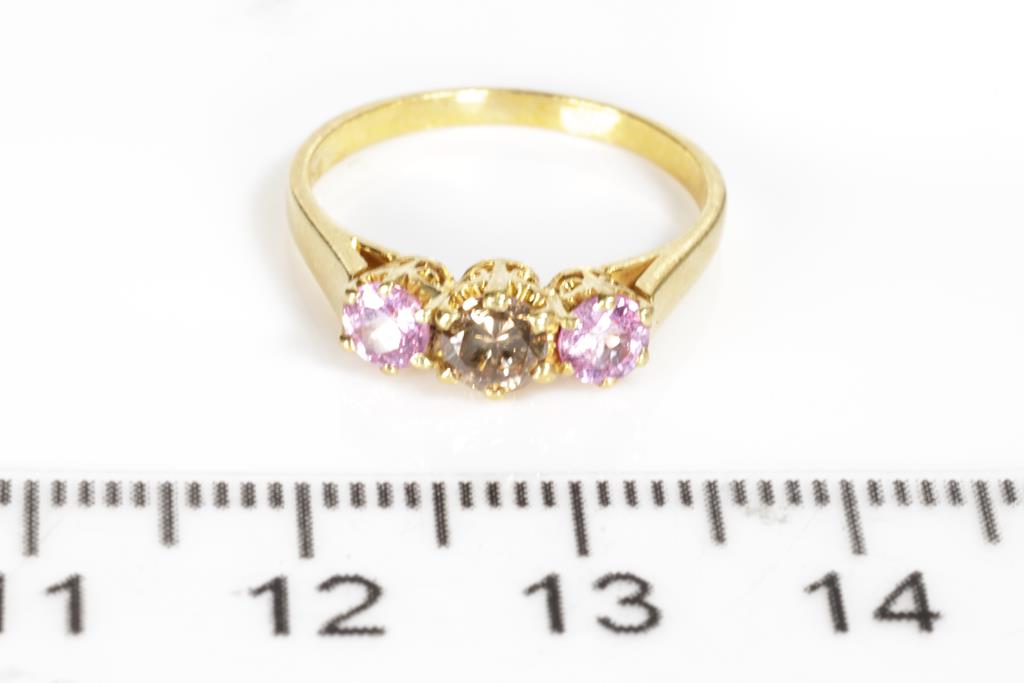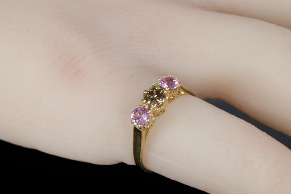 Diamond and Sapphire ring with round cut Cognac Diamond of approximately 0.18ct and round pink sapphires totalling approximately 0.20cts. 18ct yellow gold. Ring size I. Weight 2.2g. (Pre-owned)