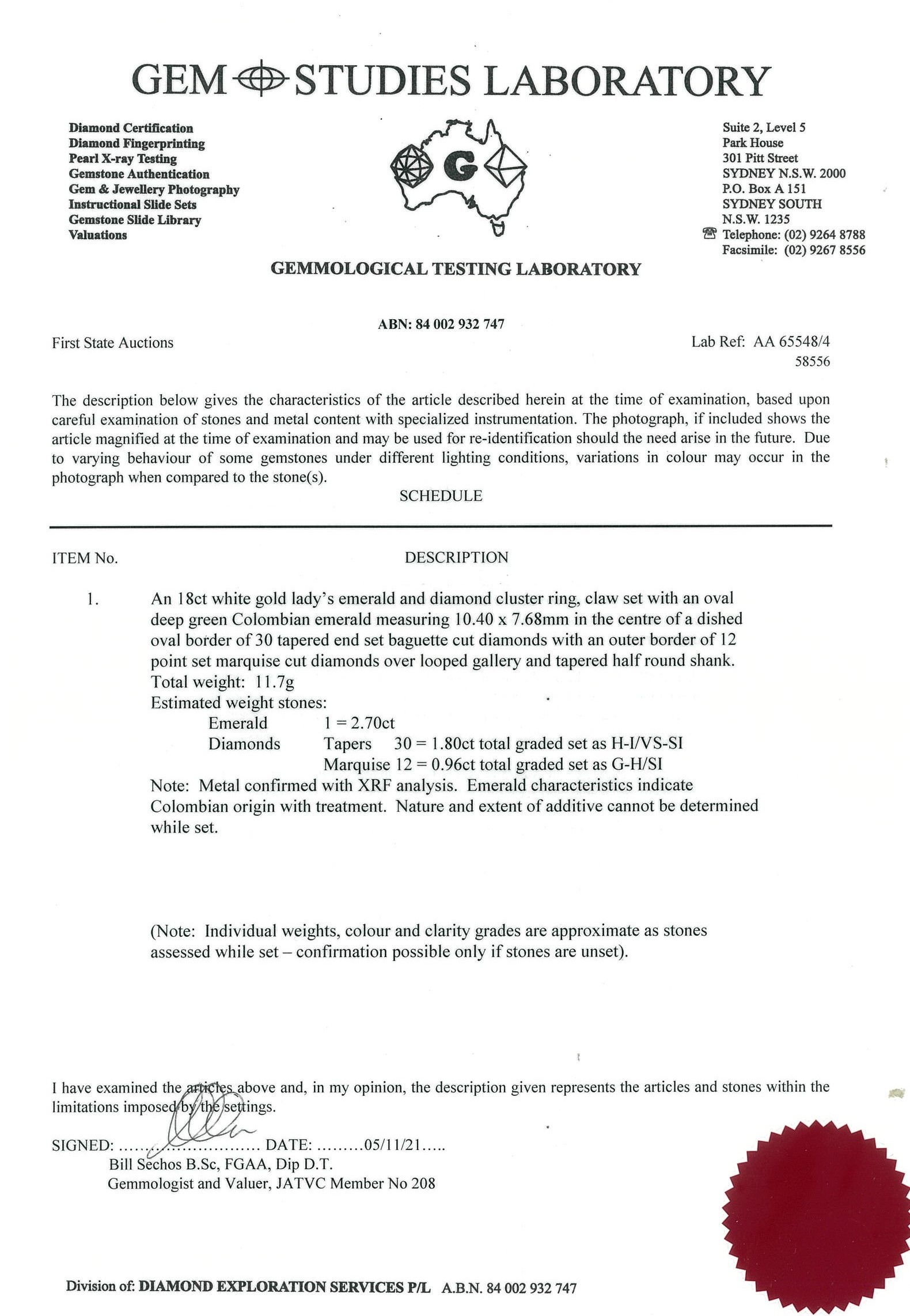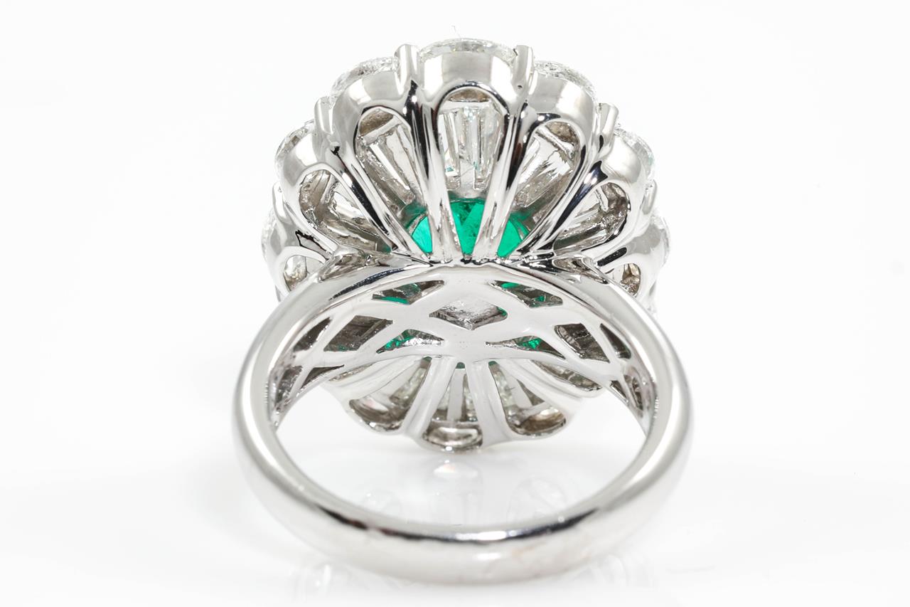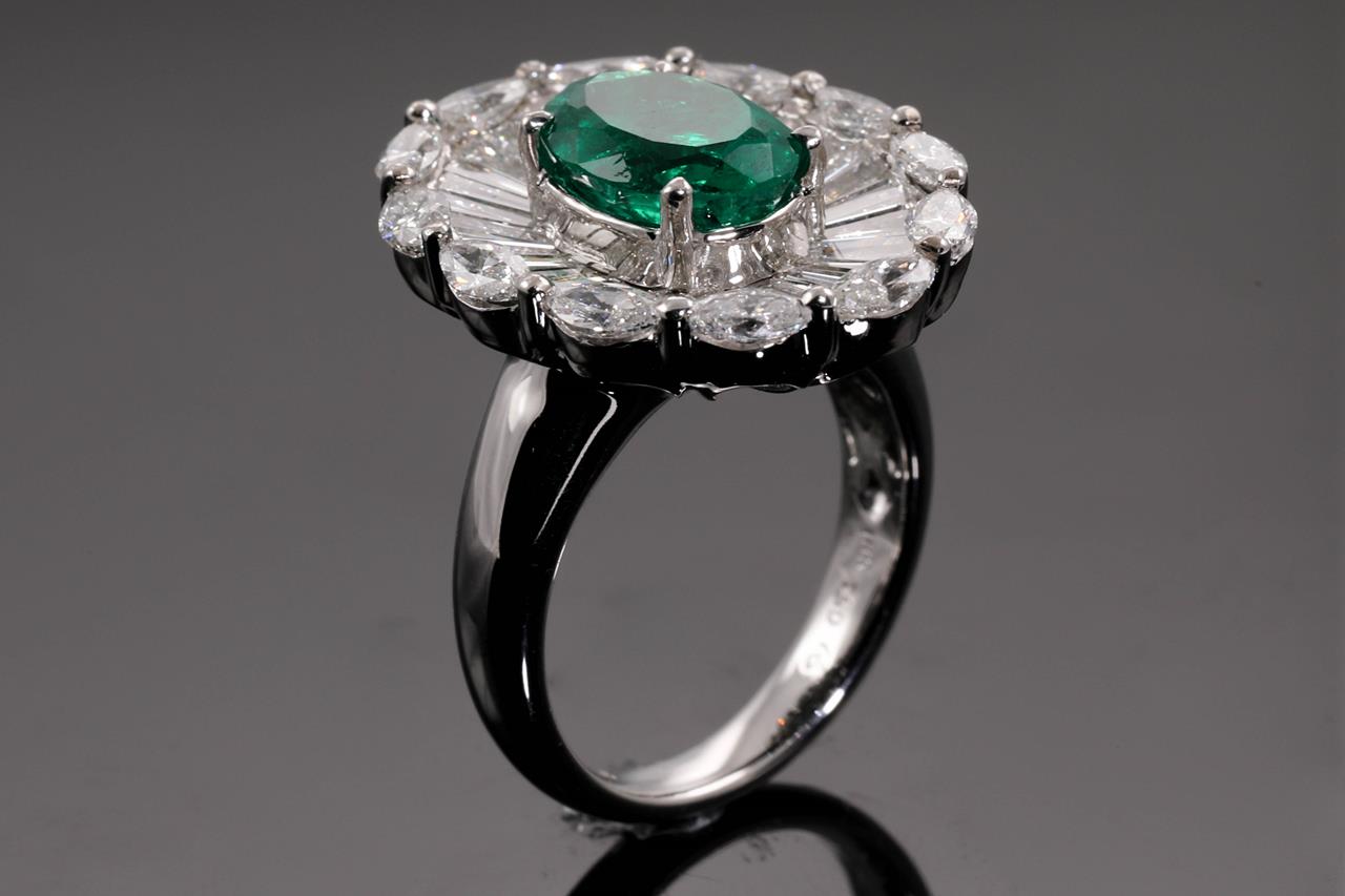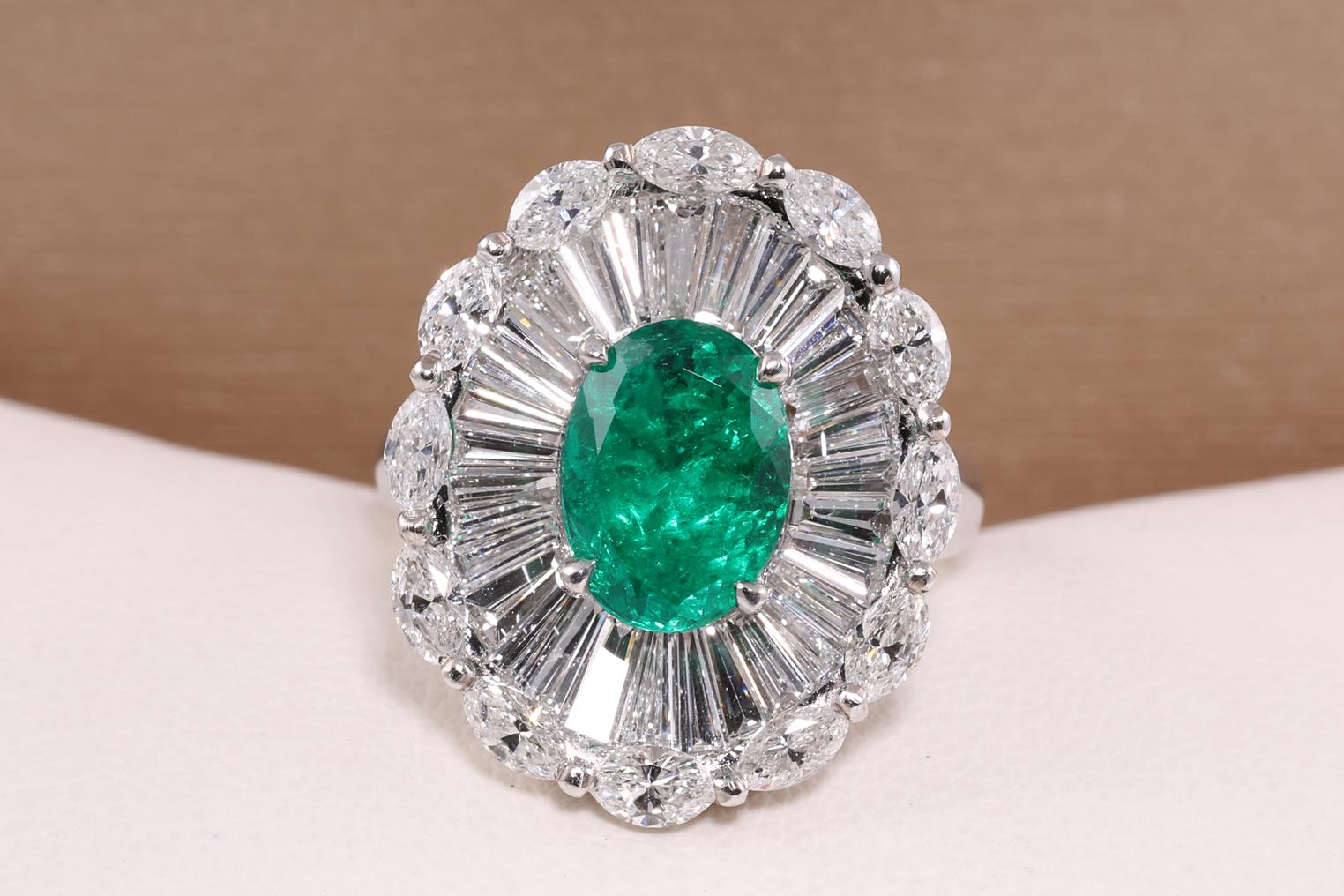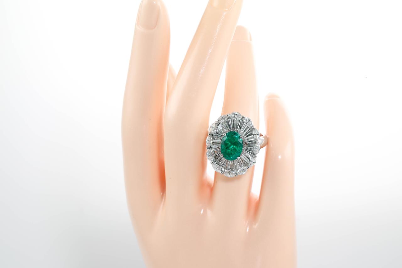 Emerald and Diamond Ring with oval shape Colombian Emerald of approximately 2.70ct and round & baguette Diamonds totalling approximately 2.76cts (Estimated grading: G-I VS-SI) 18ct white gold. Ring size L1/2. Weight 11.7g. With GSL certificate #AA65548/4. (Pre-owned)