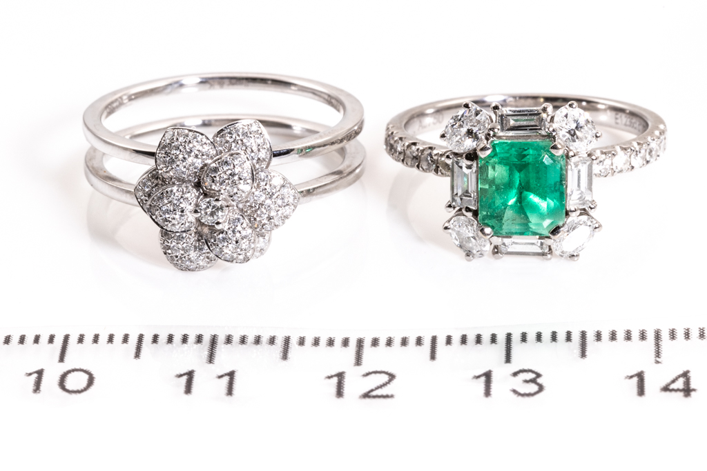 Interlocking Emerald and Diamond rings with emerald cut Columbian Emerald of 1.23ct and round/oval/marquise cut Diamonds totalling approximately 1.42cts (Estimated grading G-H SI). 18ct white gold. Ring size M 1/2. Weight: 8.0g. With Guild Certificate for Emerald #29644683. (Pre-owned)