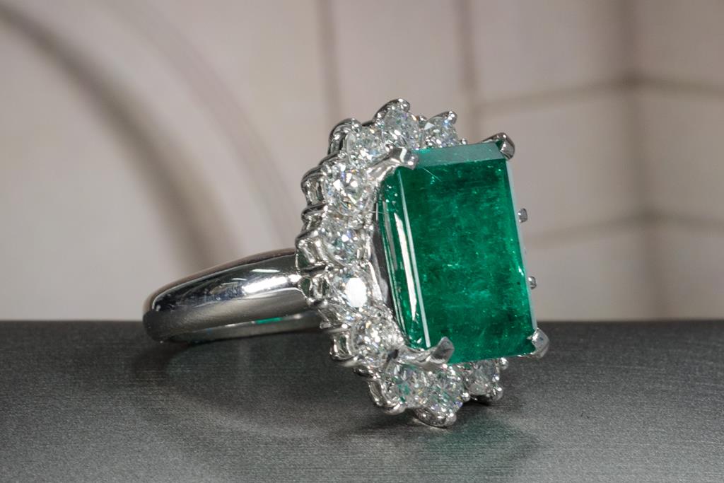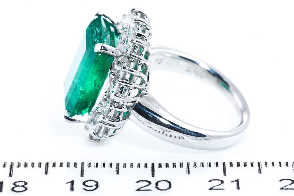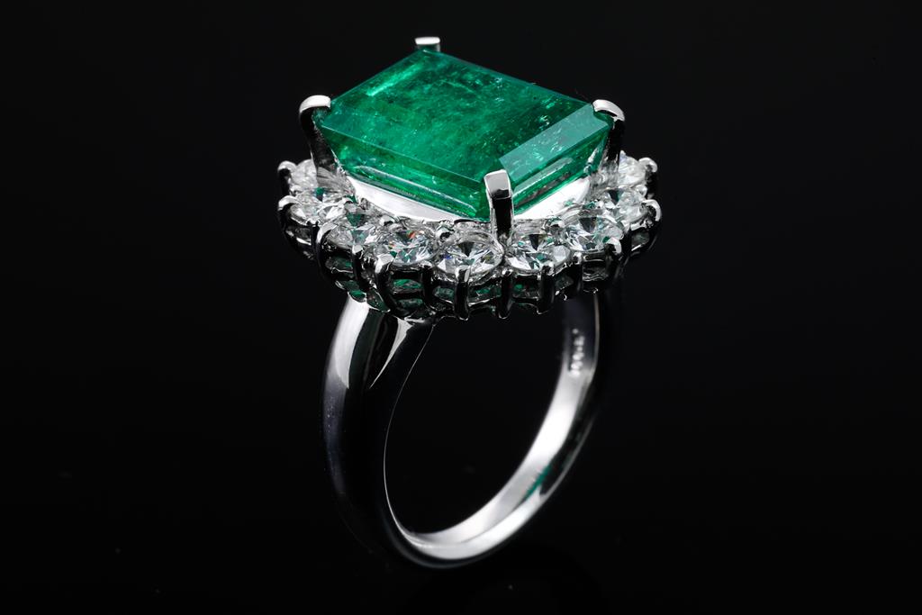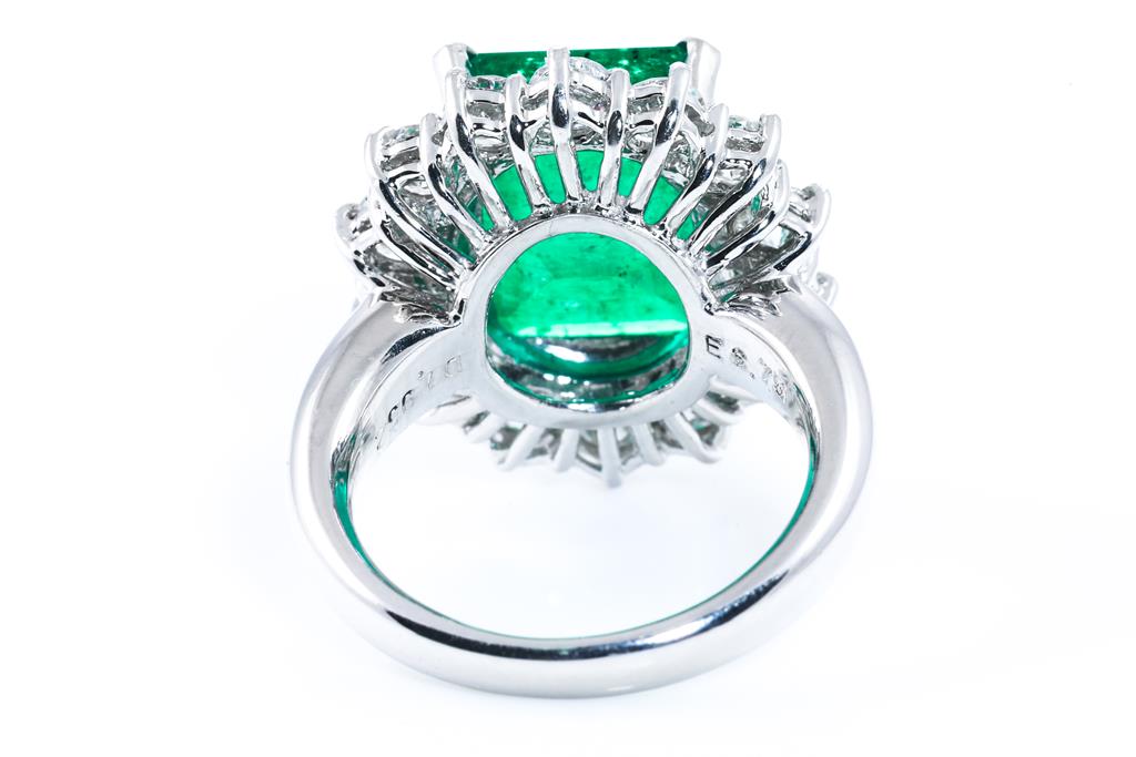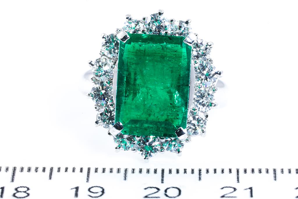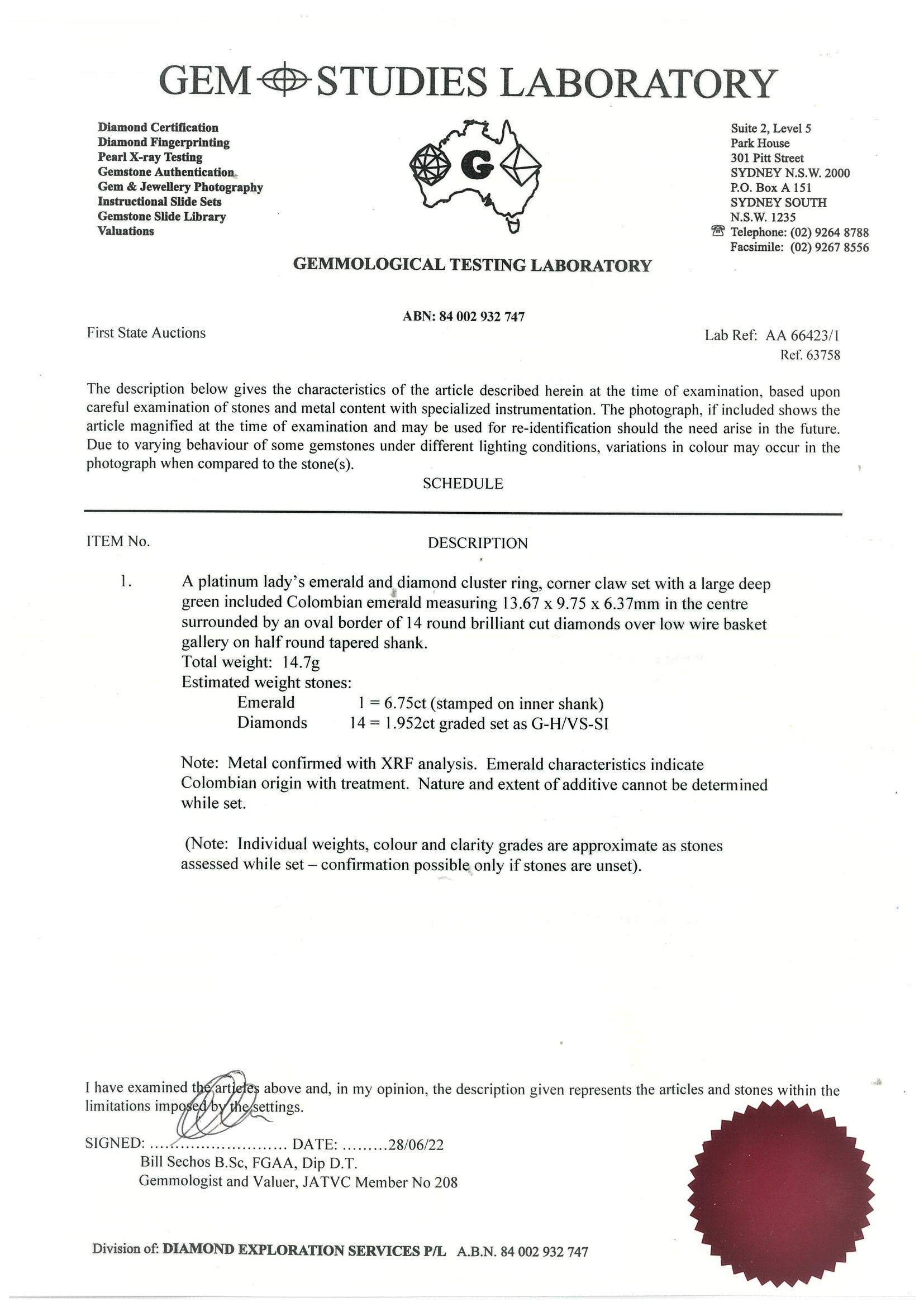 Emerald and Diamond ring with an emerald cut Colombian Emerald of 6.75ct and round Diamonds totalling 1.95cts (Estimated grading: G-H VS-SI). Platinum. Ring size L. Weight: 14.7g. With GSL certificate #AA 66423/1. (Pre-owned)