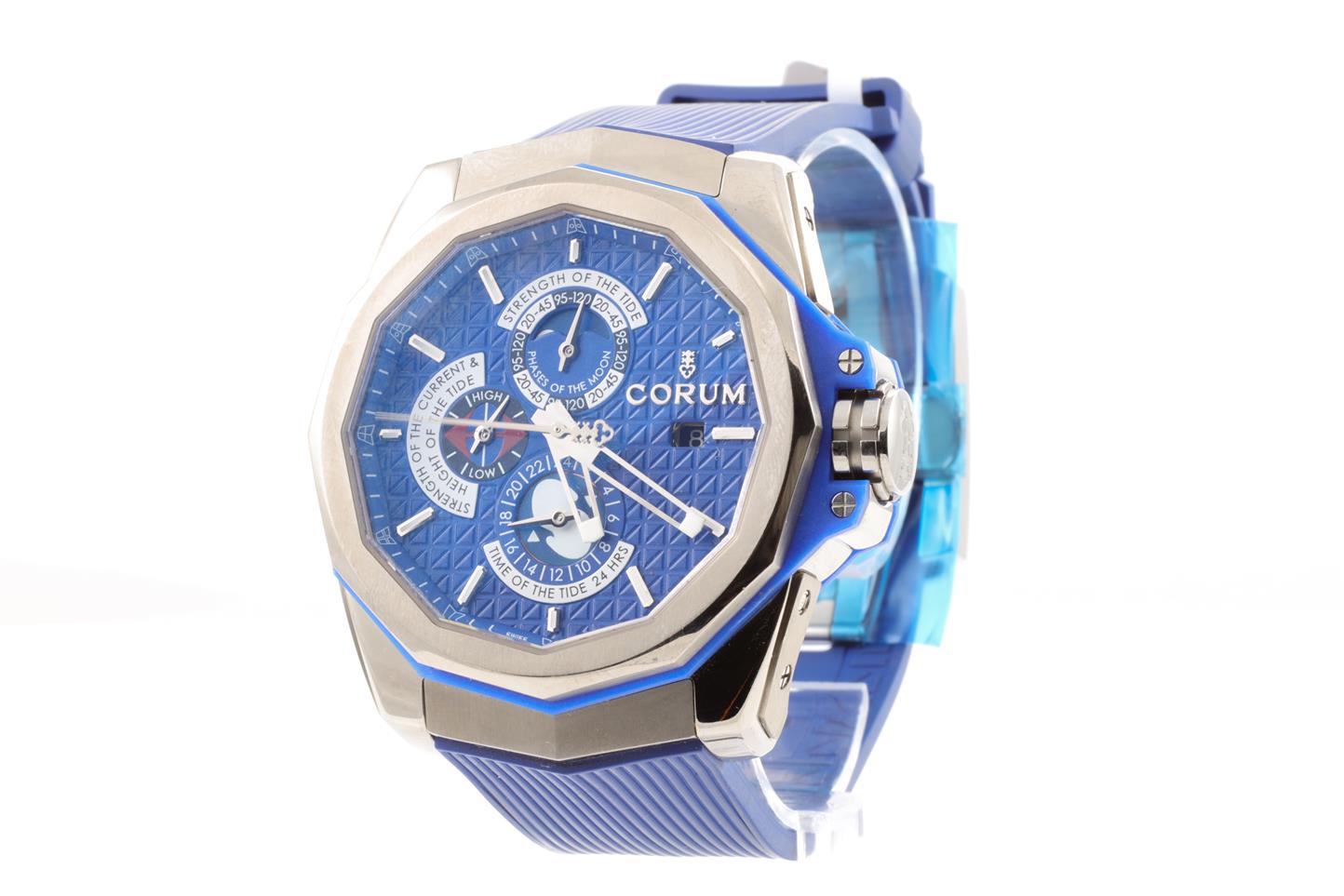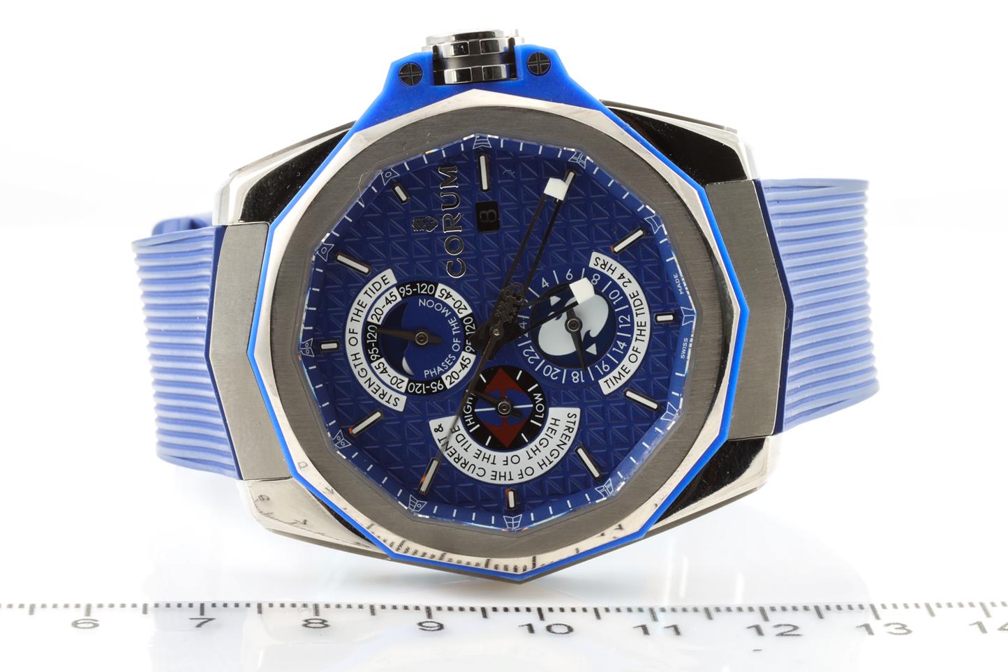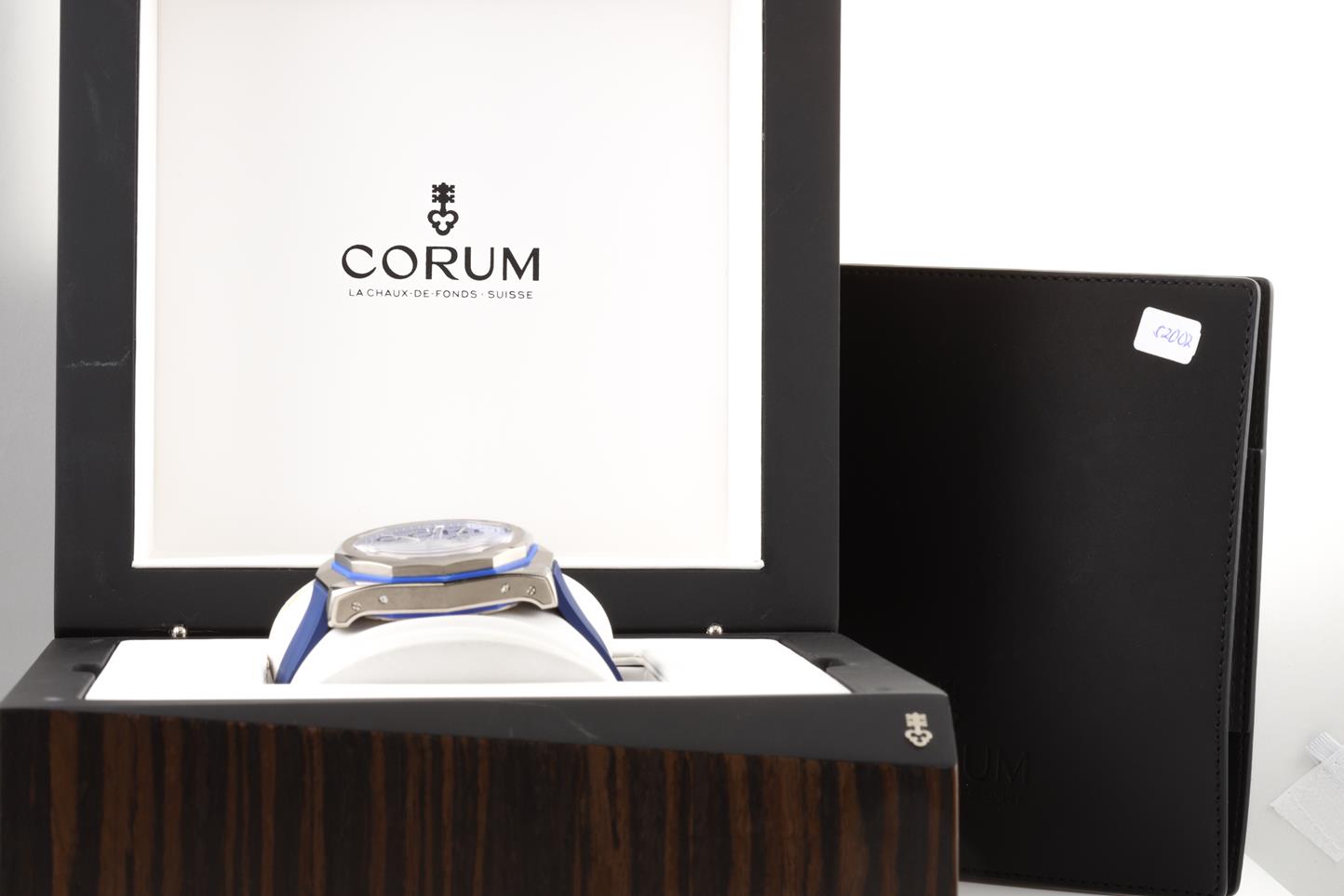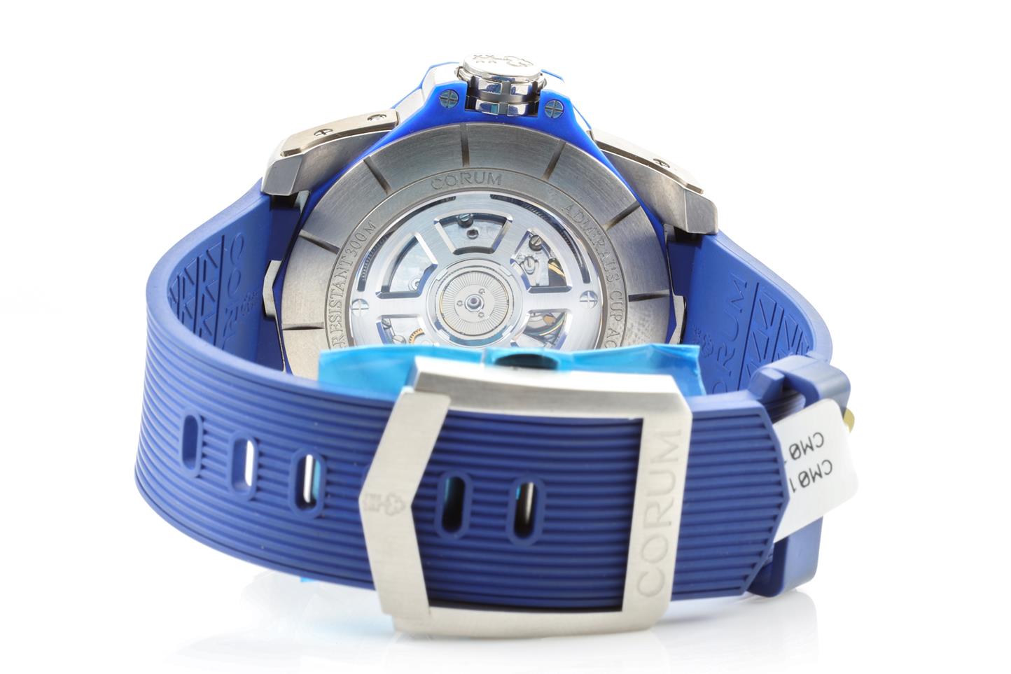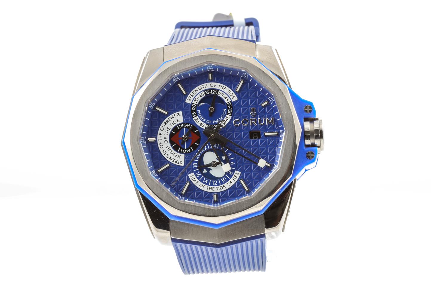 Corum Admirals Cup AC-One titanium automatic men's watch. Patterned blue dial, moonphase feature, date, case diameter: 45mm, Swiss made. Ref #277.101.04/F373 AB12. With Corum vulcanized blue rubber strap and clasp. With Corum instruction manual, international warranty card (not stamped) inside Corum box. 3 month FSA warranty. (New)