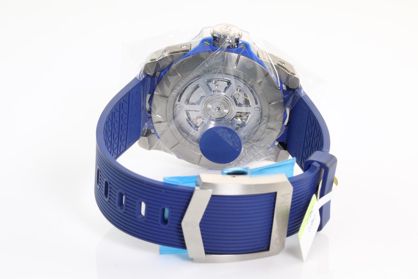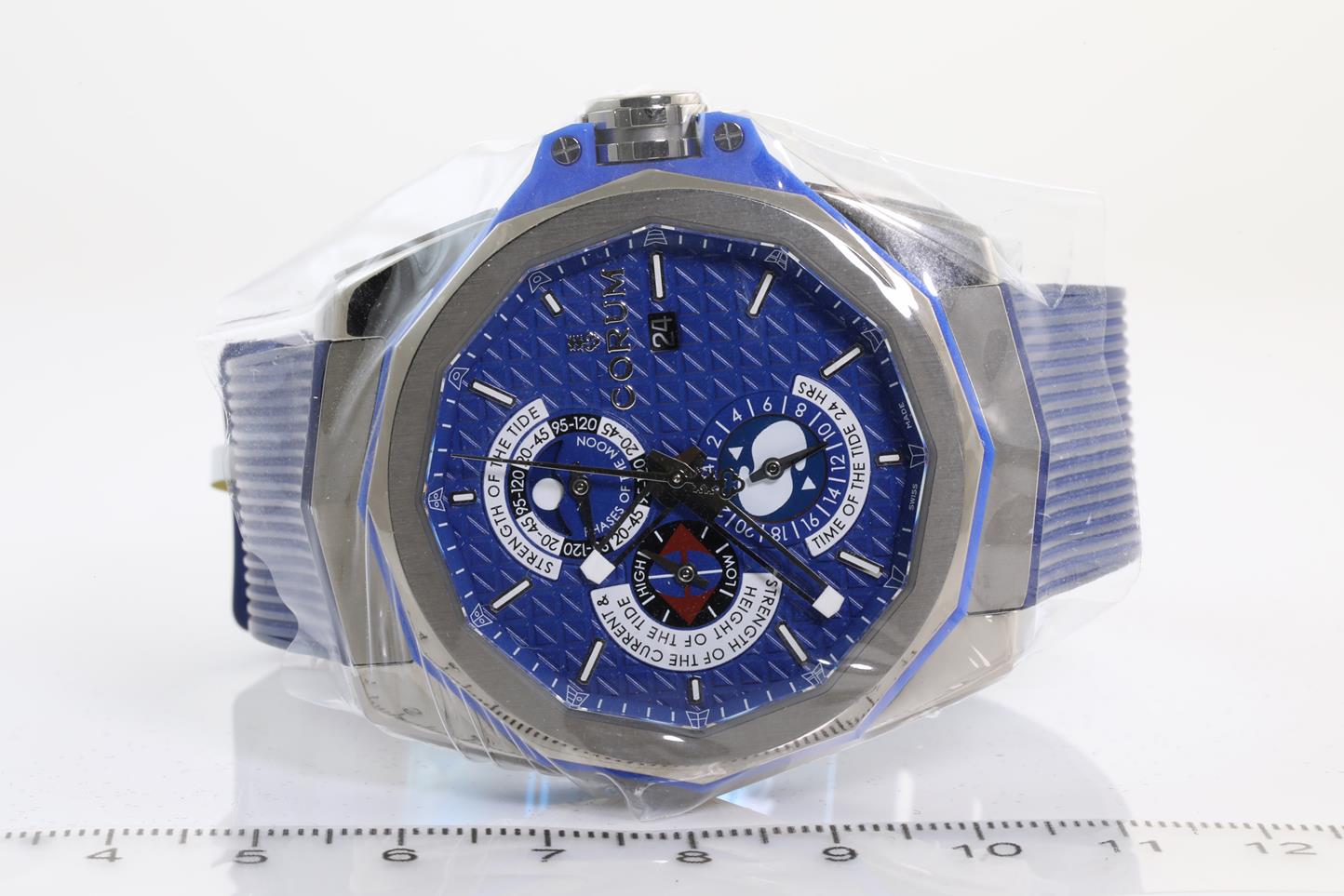 Corum Admirals Cup AC-One titanium automatic mens watch. Patterned blue dial, moonphase feature, date, case diameter: 45mm, Swiss made. Ref #277.101.04/F373 AB12. With Corum vulcanized blue rubber strap and clasp. With Corum instruction manual, international warranty card (not stamped) inside Corum box. 3 month FSA warranty. (New, in original wrapping)