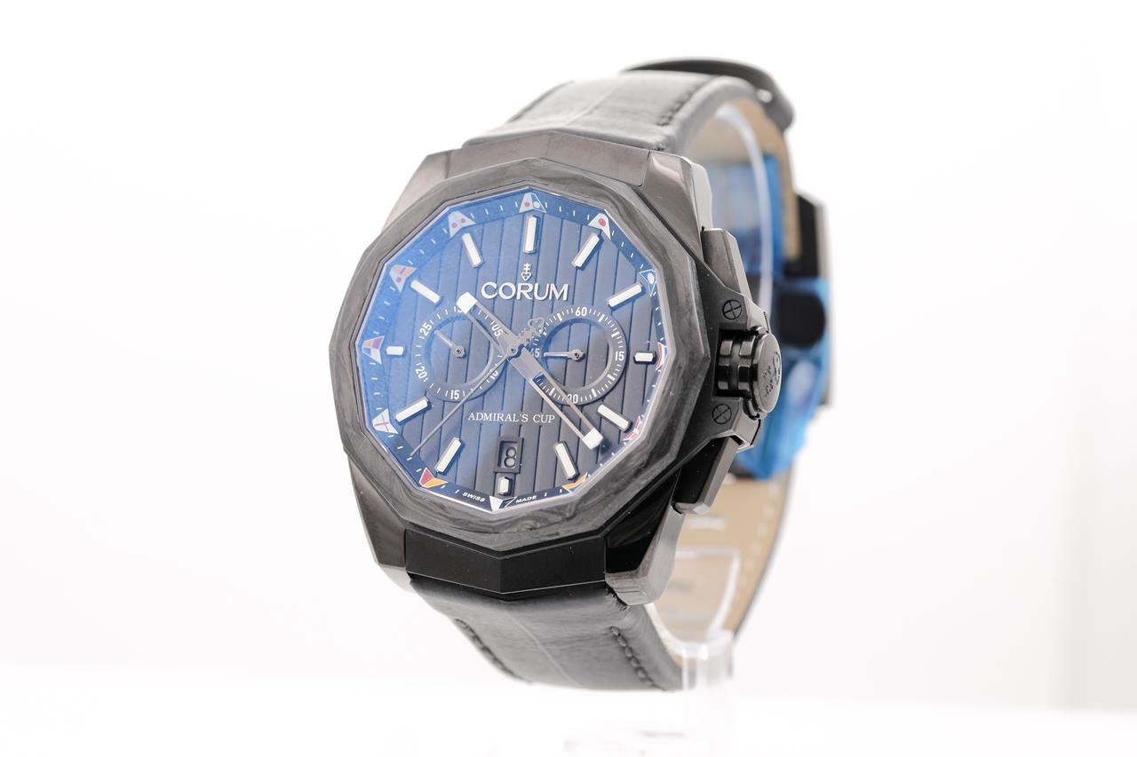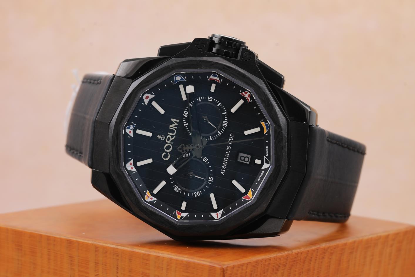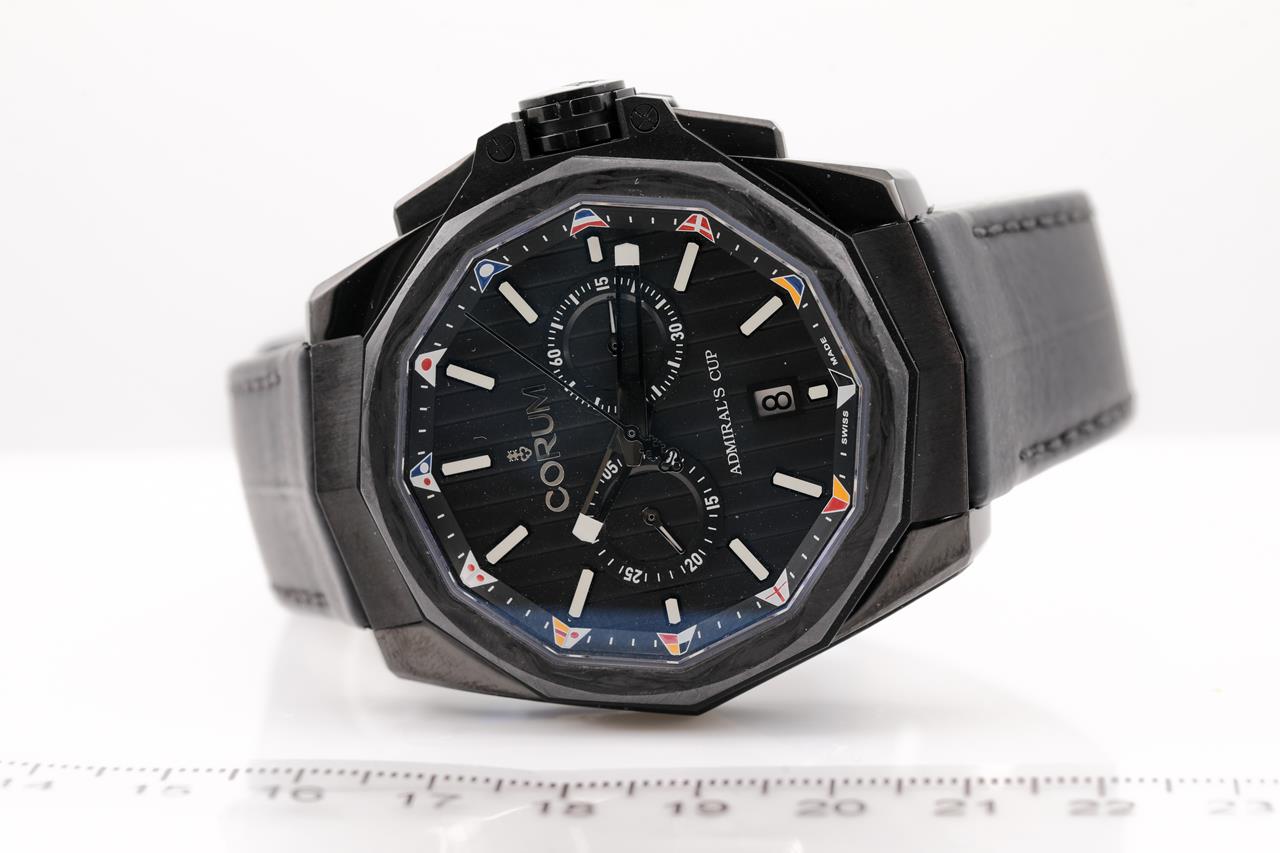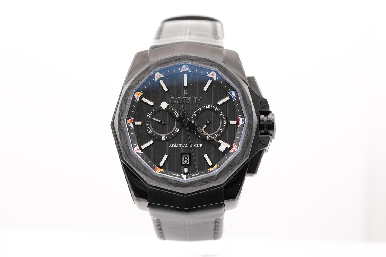 Corum Admiral's Cup AC-One black PVD stainless steel automatic men's watch. Black chronograph dial, date, case diameter: 45mm, wrist size: 20.5cm, Swiss made. Ref #116.101.36/0F61 AN20. With Corum black leather strap and clasp. With Certificate of Authenticity. No box provided. 3 month FSA warranty. (New)
