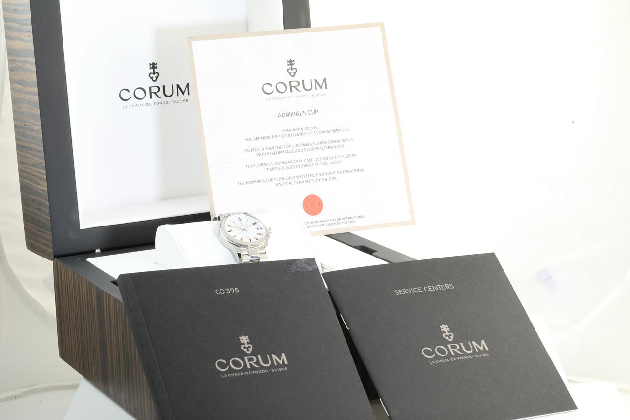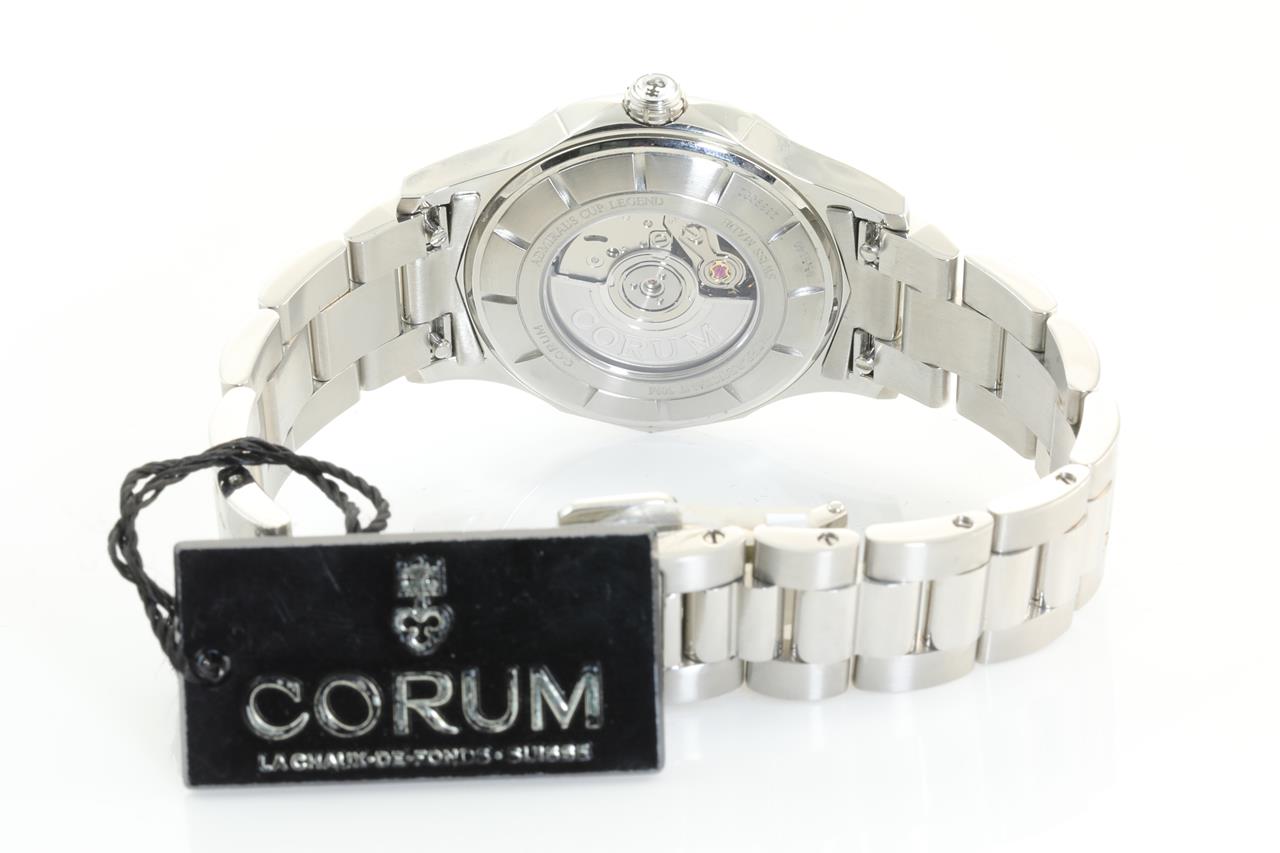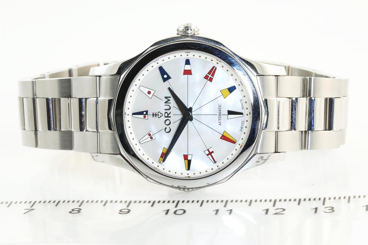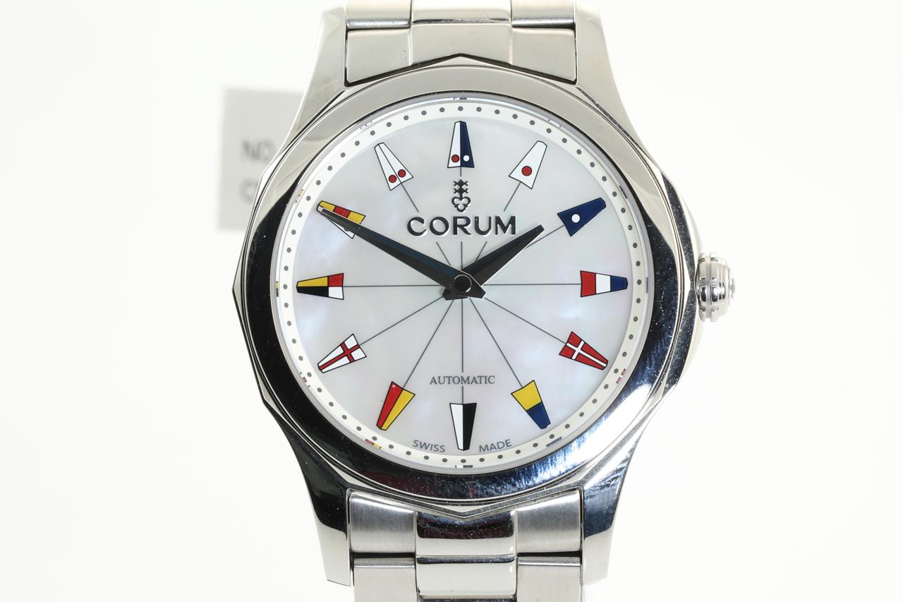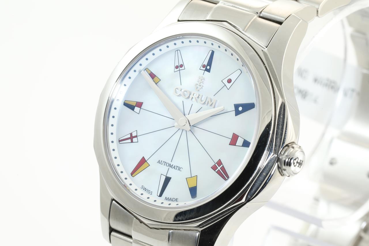 Corum Admirals Cup Legend 32 stainless steel quartz ladies watch. Mother of Pearl dial with nautical flag indicators, case diameter: 32mm, wrist size: 17cm, Swiss made. Ref #400.100.20/V200 PN12. With Corum stainless steel bracelet and clasp. With Corum instruction manual inside Corum box. 3 month FSA warranty. (New)