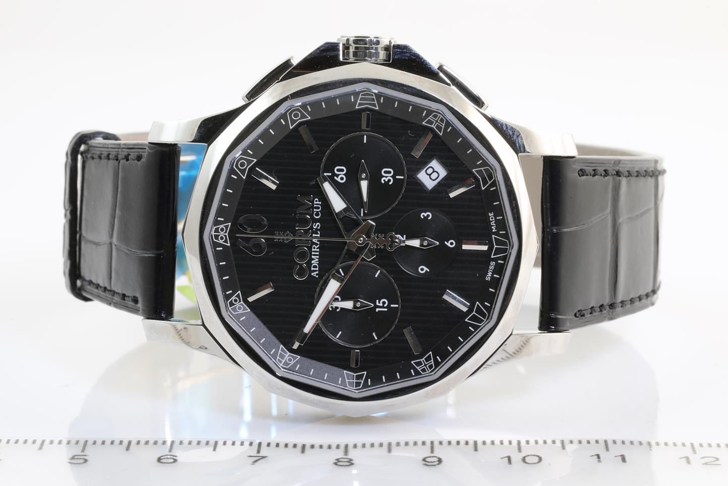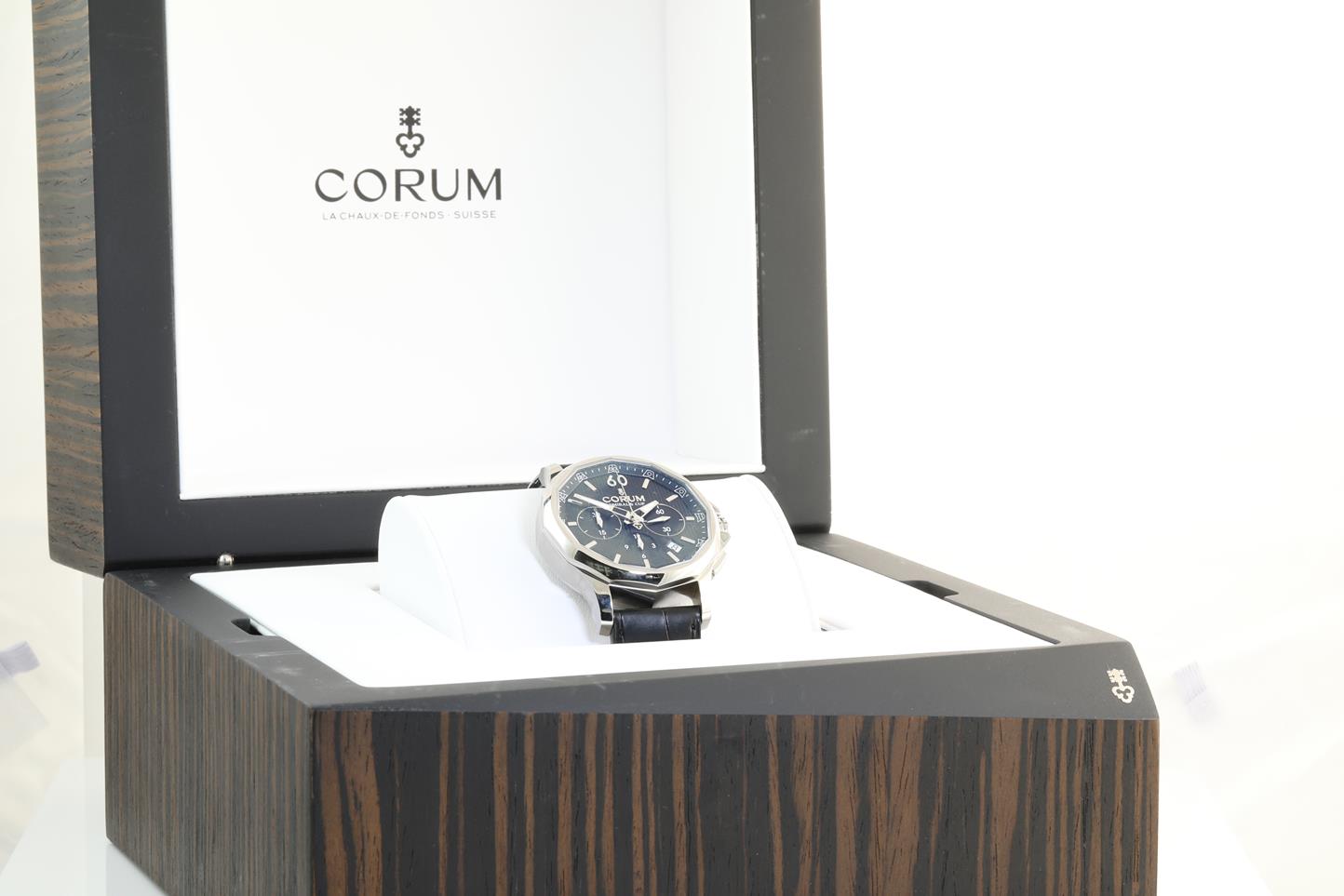 Corum Admirals Cup Legend 42 chronograph stainless steel automatic mens watch. Black vertical Yacht-Decking guilloche dial, date, case diameter: 42mm, Swiss made. Ref #984.101.20/0F01 AN10. With Corum black leather strap and clasp. Note: light wear on strap due to being display stock. With Corum international warranty card (not stamped) and instruction manual inside Corum box. 3 month FSA warranty. (New)