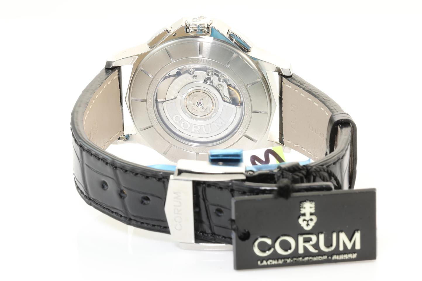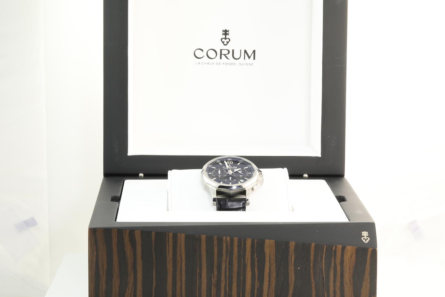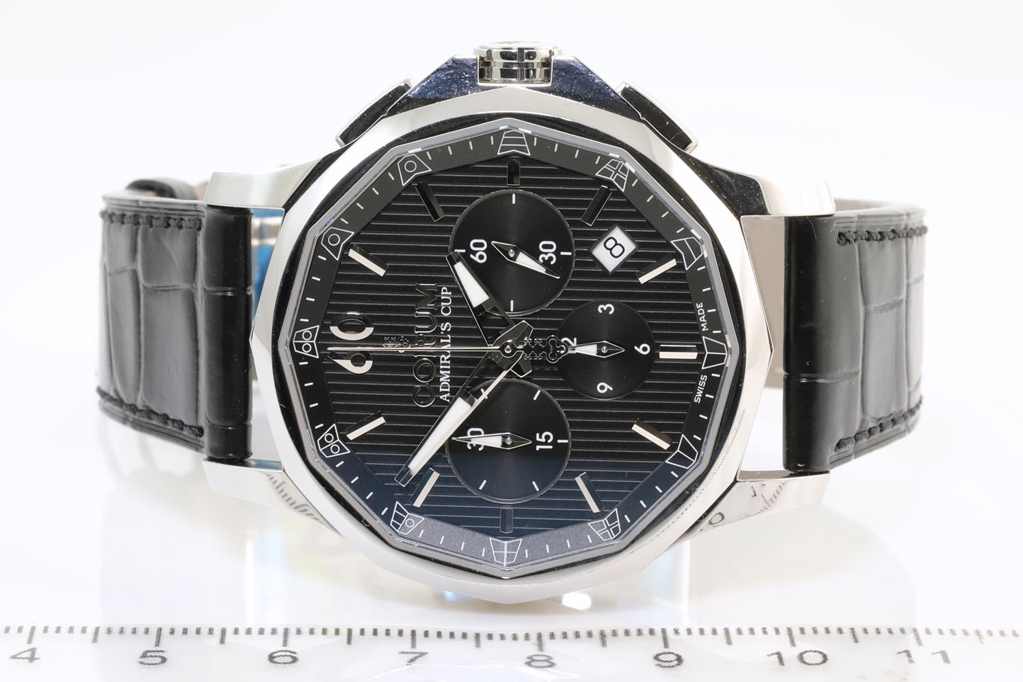 Corum Admirals Cup Legend 42 chronograph stainless steel automatic men's watch. Black vertical Yacht-Decking guilloche dial, date, case diameter: 42mm, Swiss made. Ref #984.101.20/0F01 AN10. With Corum black leather strap and clasp. Note: light wear on strap due to being display stock. With Corum international warranty card (not stamped) and instruction manual inside Corum box. 3 month FSA warranty. (New)