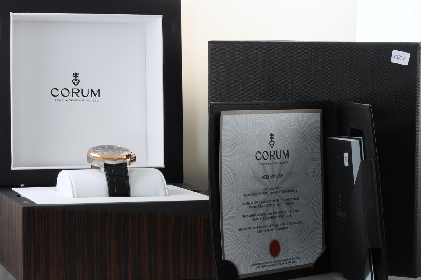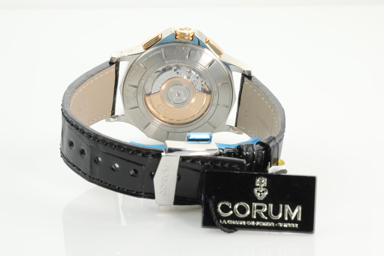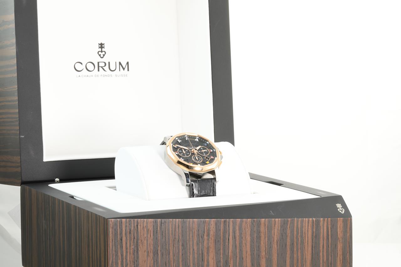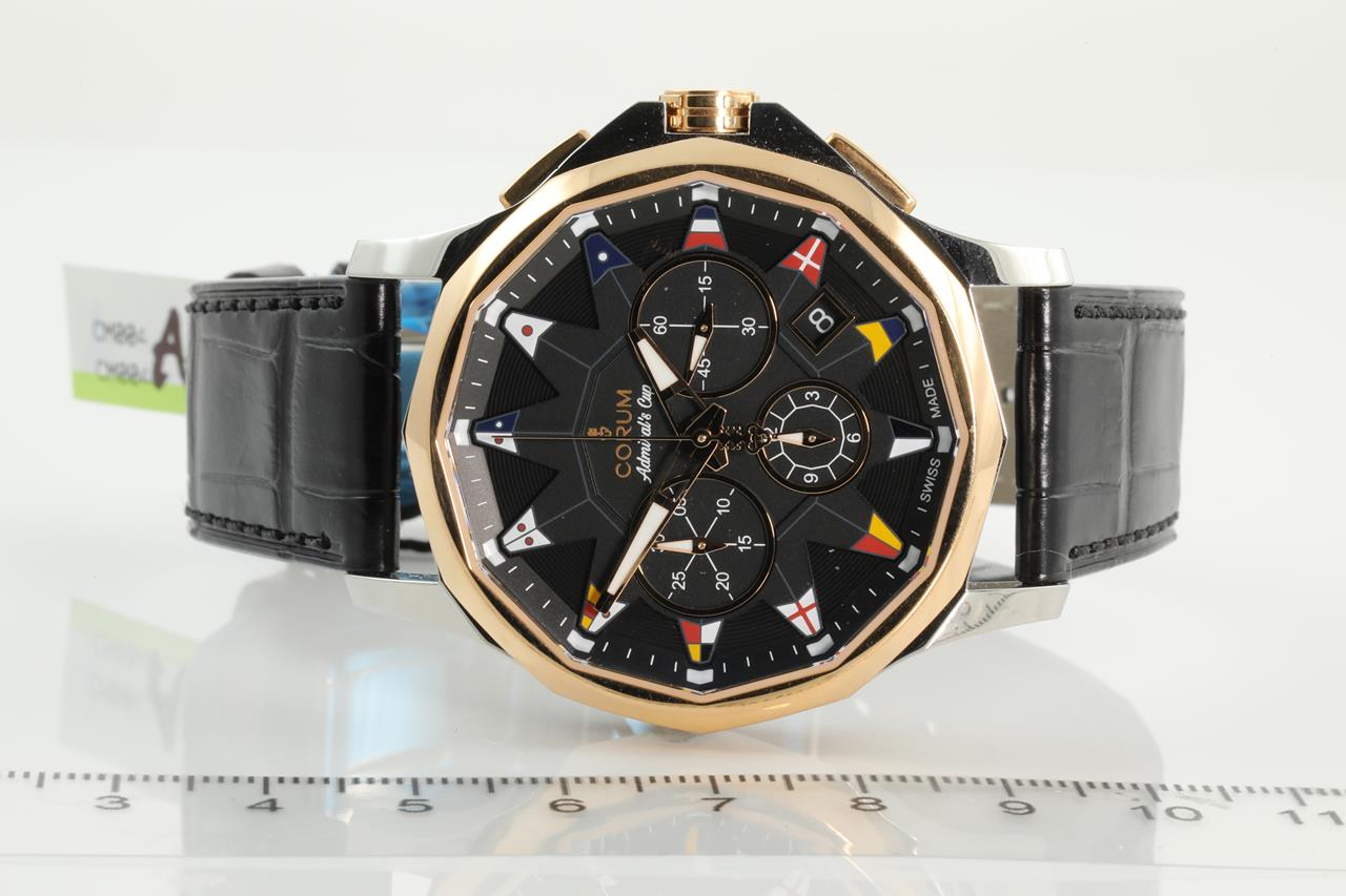 Corum Admirals Cup Legend 18ct rose gold and stainless steel automatic mens watch. Black chronograph dial, date, case diameter: 42mm, Swiss made. Ref #984.101.24/0F01 AN12. With Corum black leather strap and clasp. Note slight wear on strap and plastic marks on back case due to being display stock. With Corum international warranty card (not stamped) inside Corum box. 3 month FSA warranty. (New)