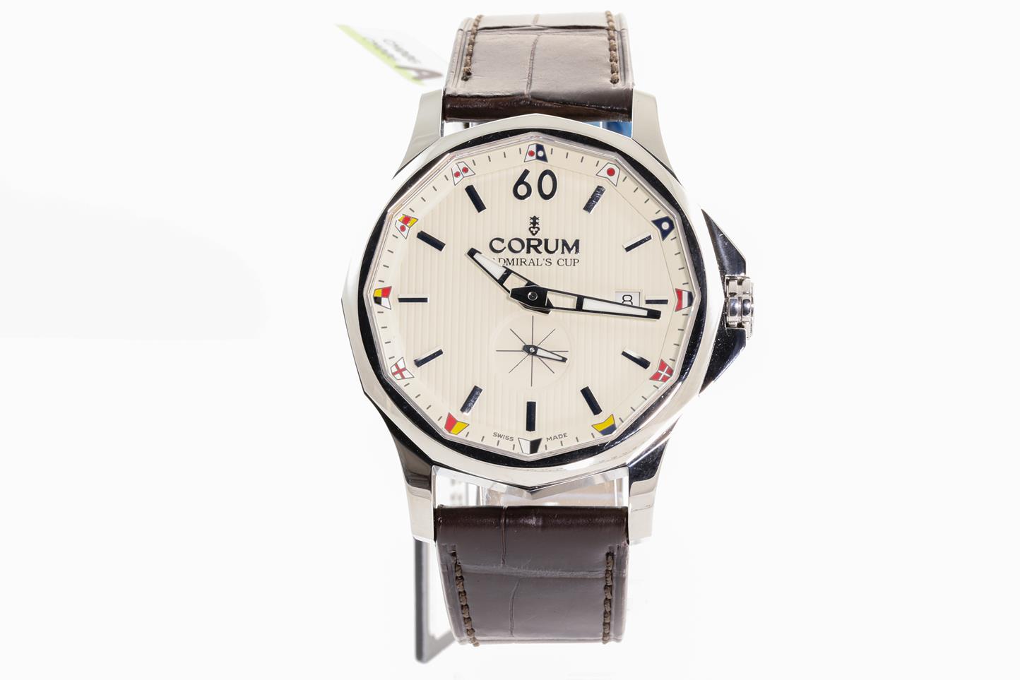 Corum Admiral's Cup Legend stainless steel automatic mens watch. Beige dial, date, case diameter: 42mm, wrist size: 20cm (can be adjusted up to 21cm), Swiss made. Ref #395.101.20/0F02 AA20. With Corum brown leather strap and clasp. Note: light wear on strap & minor scratches on back case due to being display stock. With Corum international warranty card (not stamped) and instruction manual inside Corum box. 3 month FSA warranty. (New)