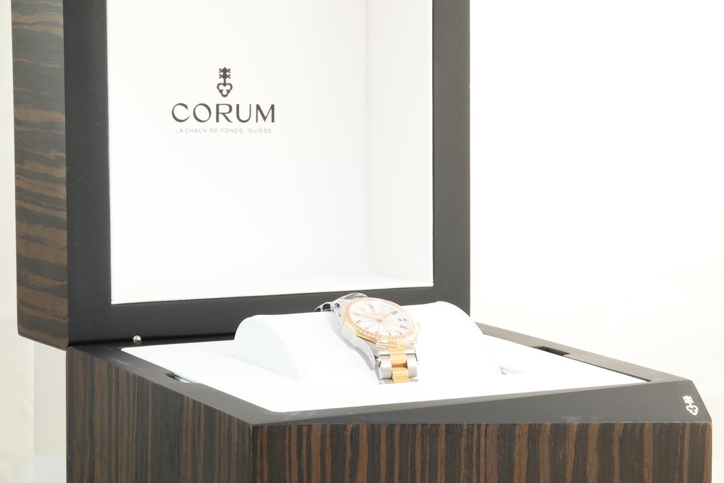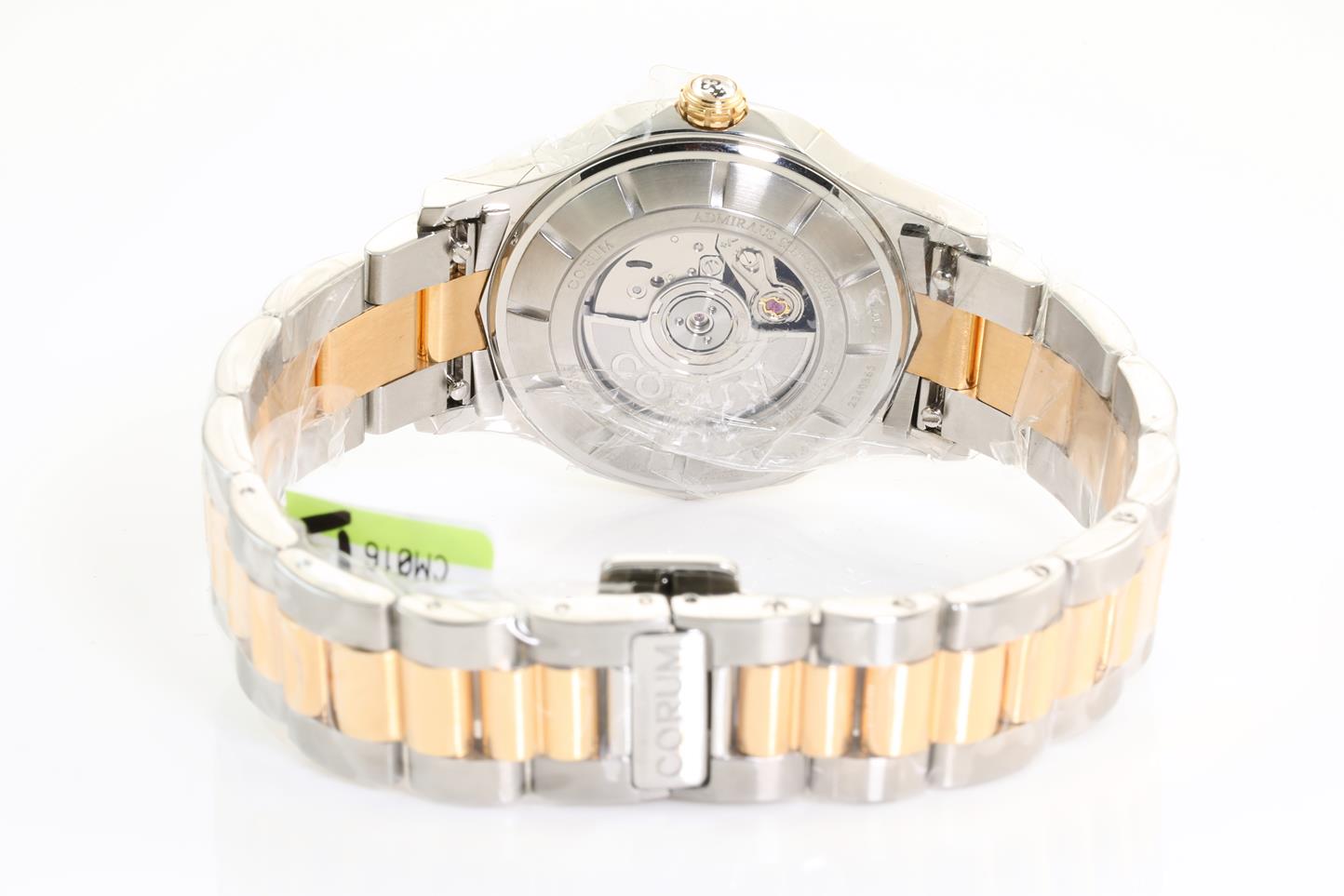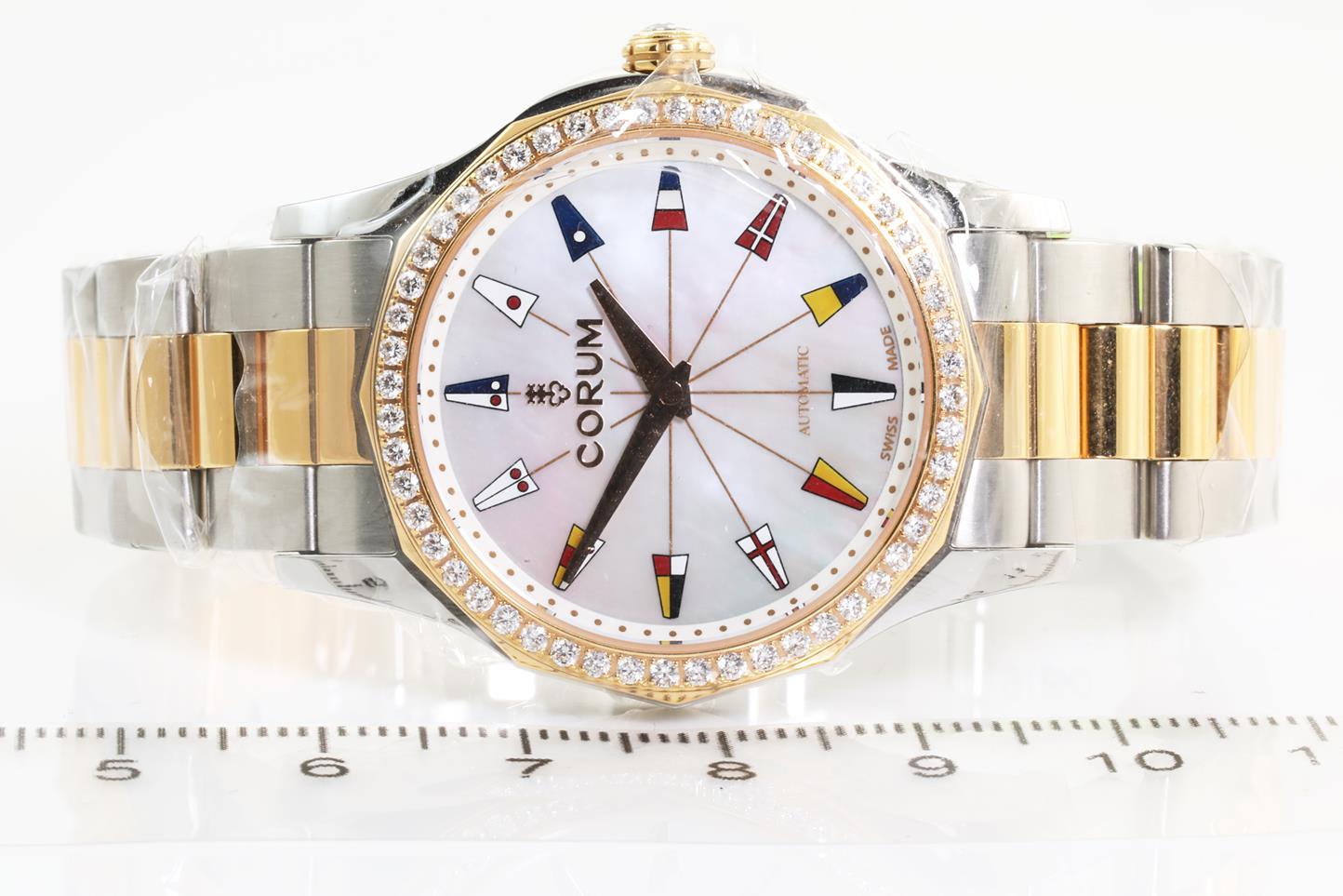 Corum Admiral's Cup Legend 18ct rose gold and stainless steel automatic watch. Mother of Pearl, Diamond set bezel, case diameter: 32mm, Swiss made. Ref #400.100.29/V200 PN13. With Corum two-tone bracelet and clasp. With Corum Gemstone certificate card, warranty certificate card (not stamped) and instruction manual inside Corum box. 3 month FSA warranty. (New, in original wrapping)