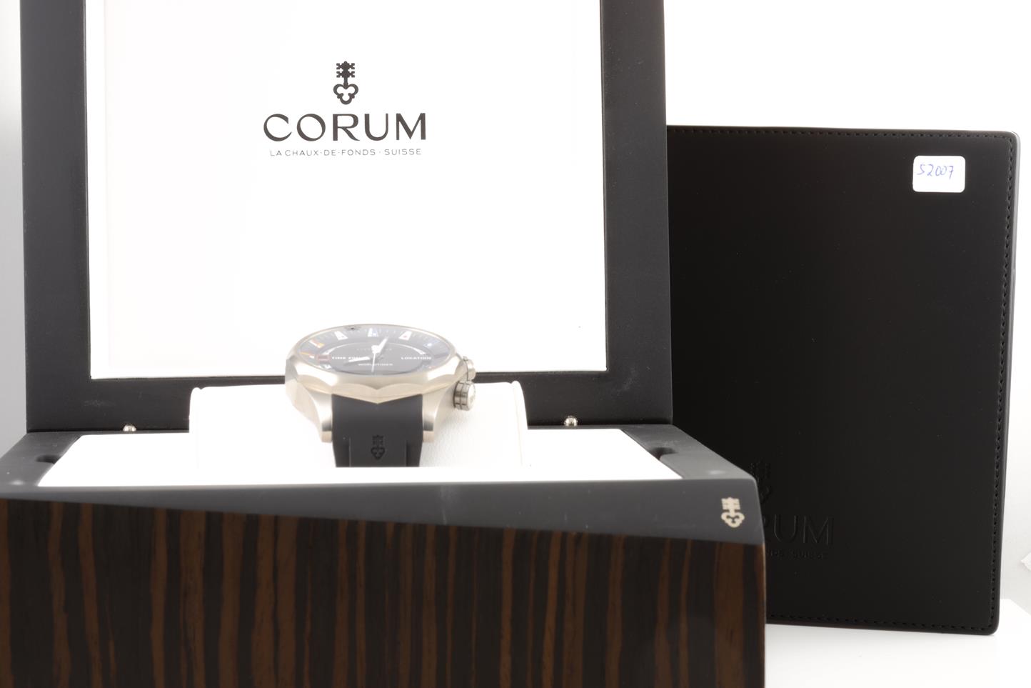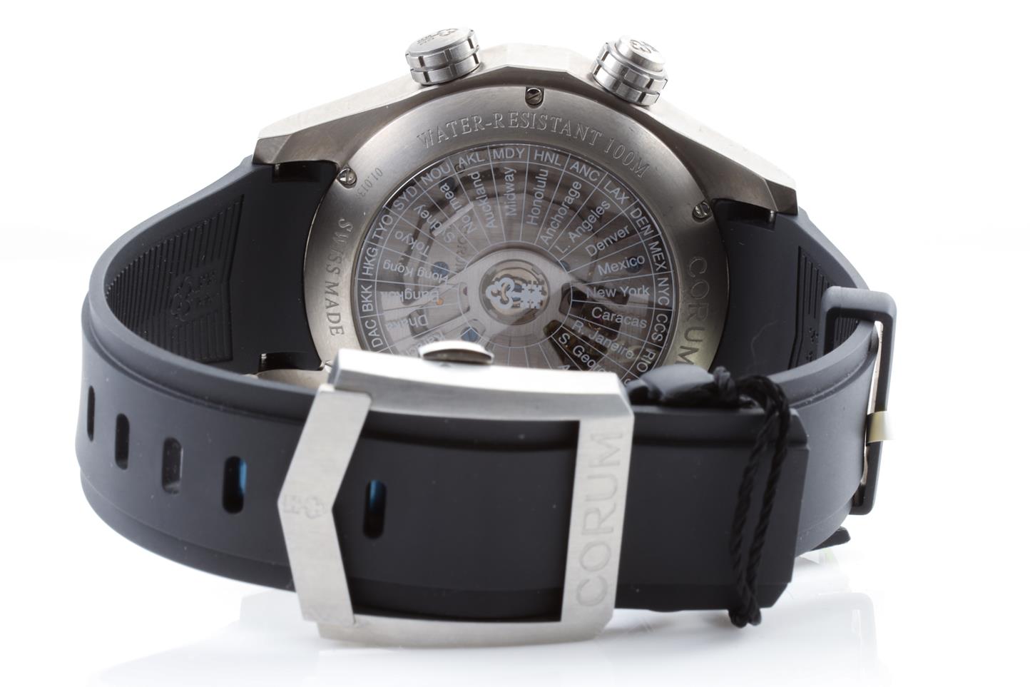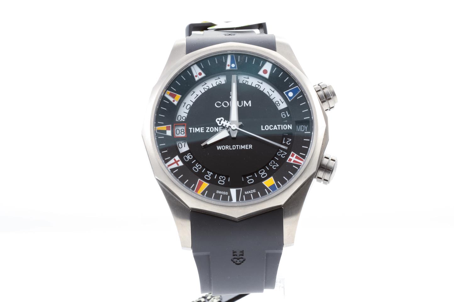 Corum Admirals Cup Legend Worldtimer titanium automatic men's watch. Brass black dial, date, case diameter: 47mm, Swiss made. Ref #637.101.04/F371 AN02. With Corum black rubber strap and clasp. With Corum international warranty card (not stamped) and instruction manual inside Corum box. 3 month FSA warranty. (New)