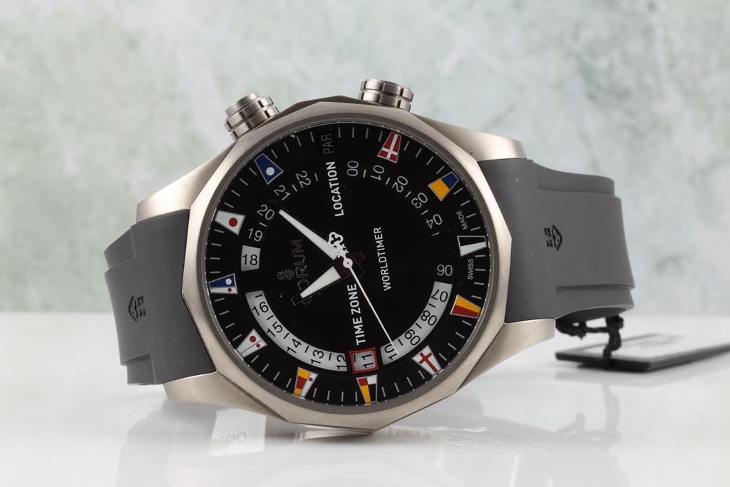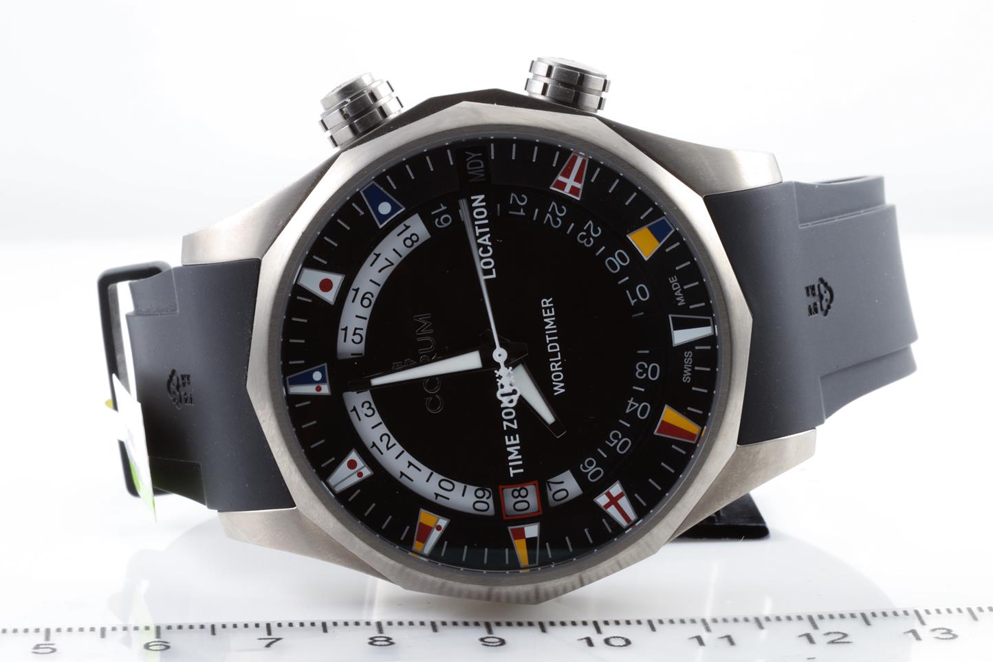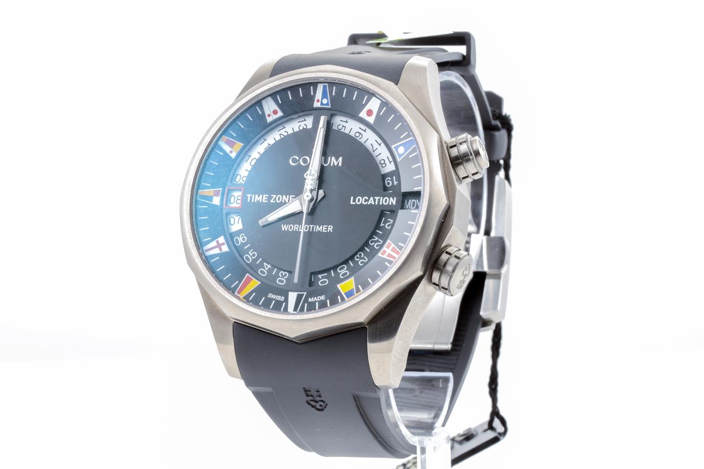 Corum Admirals Cup Legend Worldtimer titanium automatic men's watch. Brass black dial, date, case diameter: 47mm, Swiss made. Ref #637.101.04/F371 AN02. With Corum black rubber strap and clasp. With Corum international warranty card (not stamped) and instruction manual inside Corum box. 3 month FSA warranty. (New)