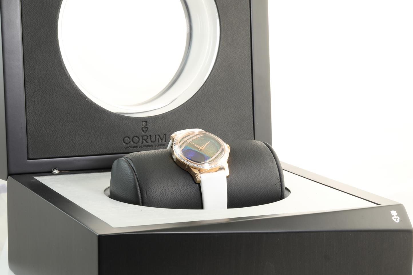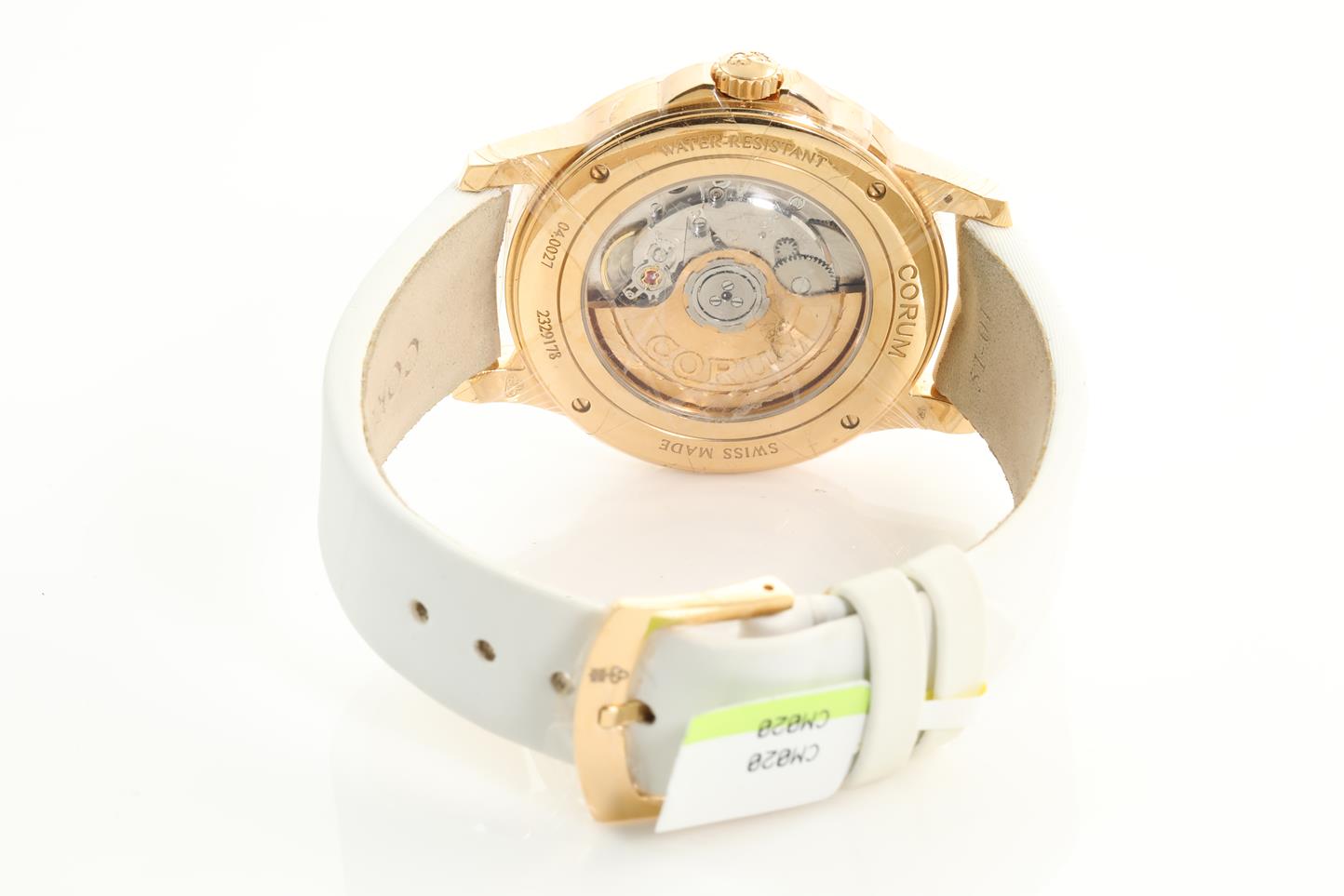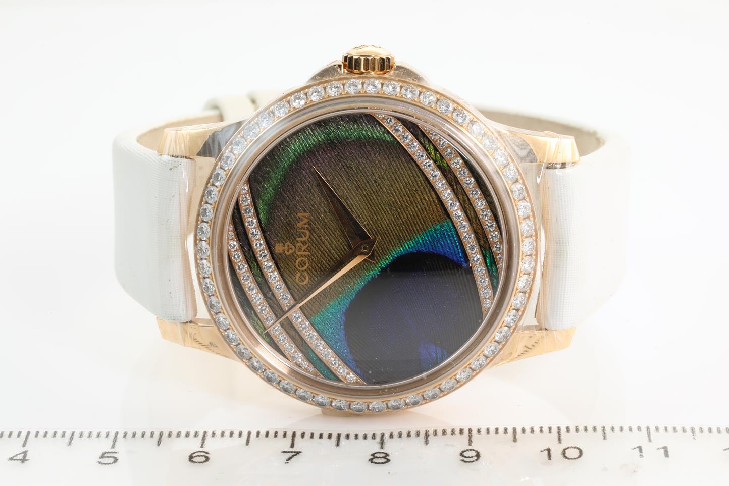 Corum Artisans Feather 18ct rose gold automatic watch. Peacock feather with Diamond dial, Diamond indicators, case diameter: 39mm, length: 21cm, Swiss made, Ref #110.601.85/0049 PL92. With Corum white satin strap and 18ct gold clasp. Note: light wear on strap due to being display stock. With Corum international warranty card (not stamped), Gemstone certificate card, instruction manual and spare white leather strap inside Corum box. 3 month FSA warranty. (New, in original wrapping)
