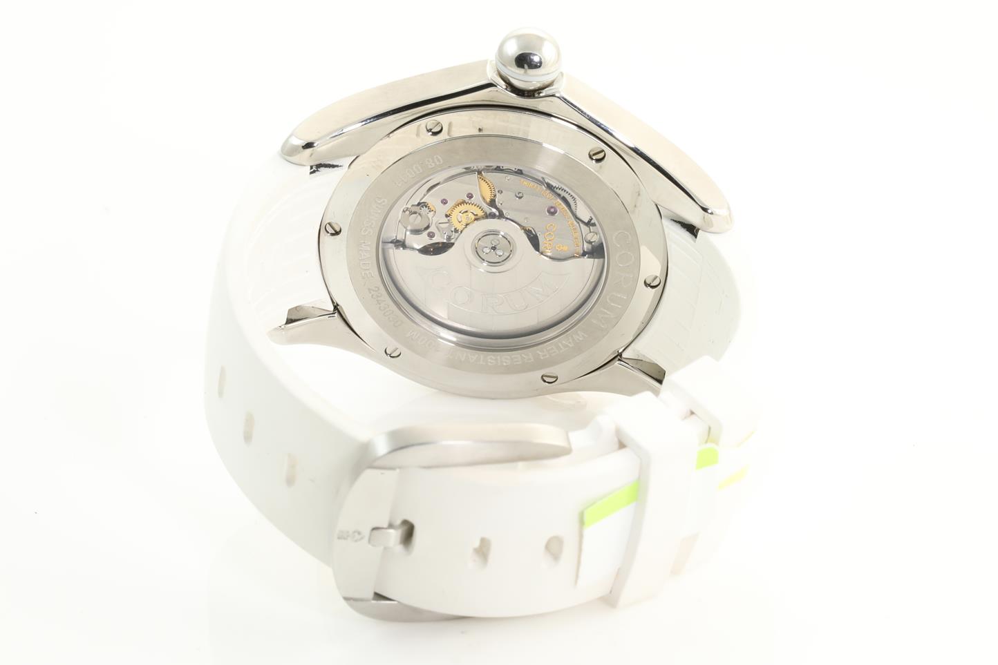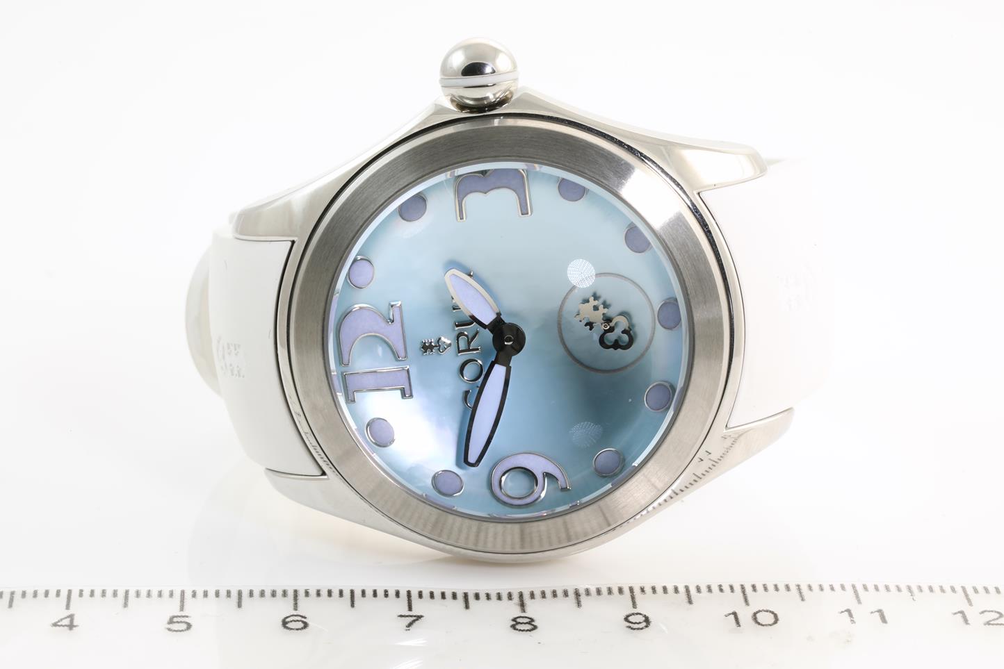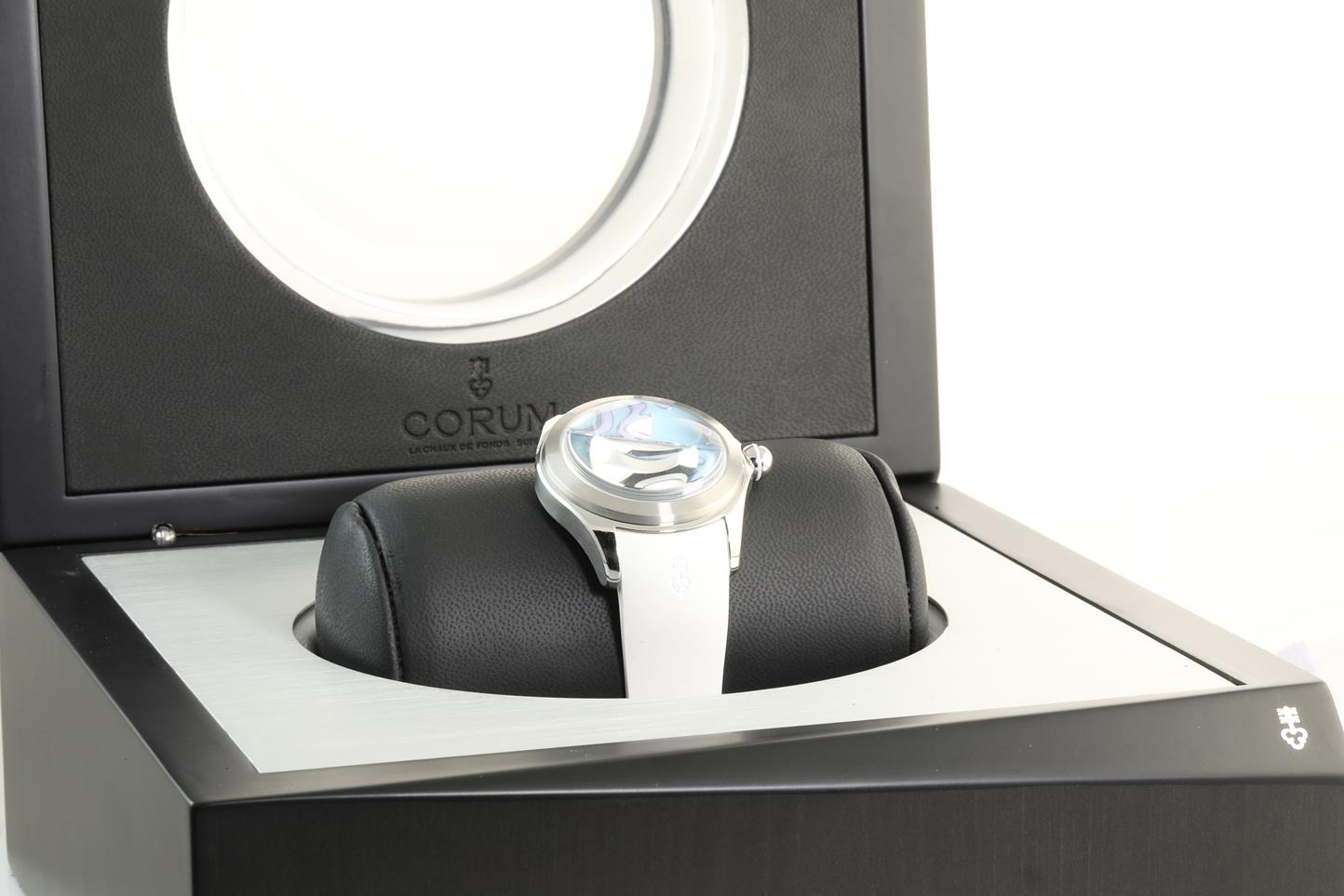 Corum Bubble stainless steel automatic watch. Blue Mother of Pearl dial, small second, case diameter: 42mm, length: 17cm, Swiss made. Ref #295.100.20/0011 PN05. With Corum white rubber strap and clasp. With international warranty card (not stamped) and instruction manual inside Corum box. 3 month FSA warranty. (New)