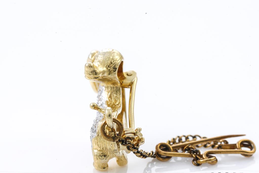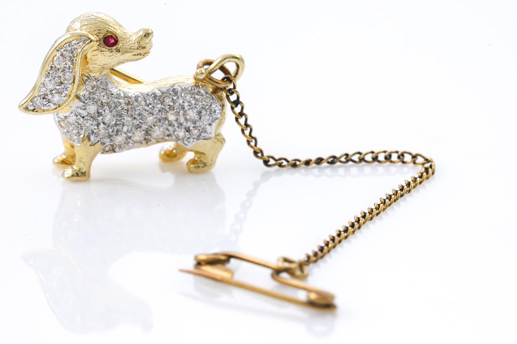 Dachshund shaped brooch set with round cut Diamonds totalling approximately 0.16ct and round Ruby. 14ct yellow gold. Safety chain base metal. Total weight 3.6g. (Pre-owned)