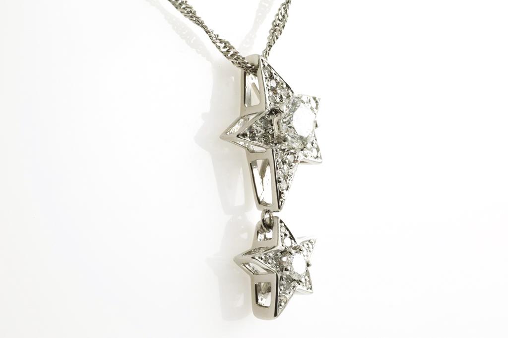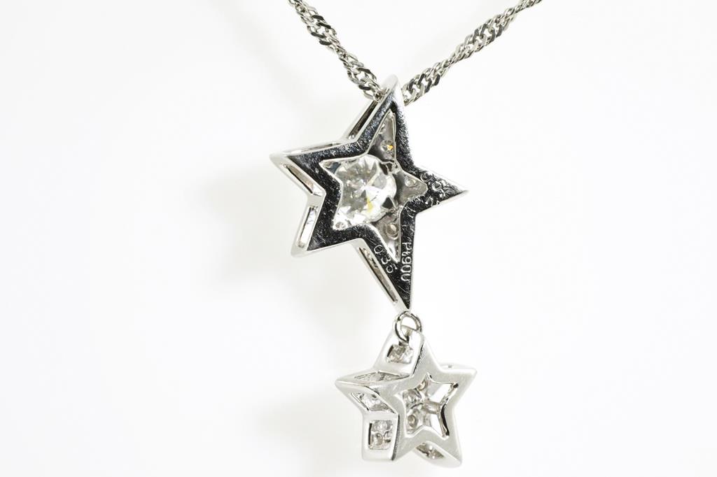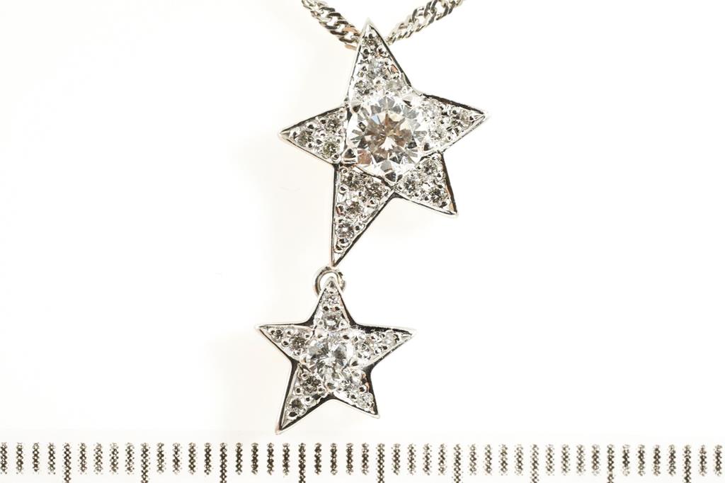 Diamond Star Design pendant with a centre round brilliant cut Diamond of 0.54ct (Estimated grading: H SI) and remaining Diamonds totalling 0.35cts. Platinum with adjustable 43cm platinum chain. Weight: 6.5g (Pre-owned)